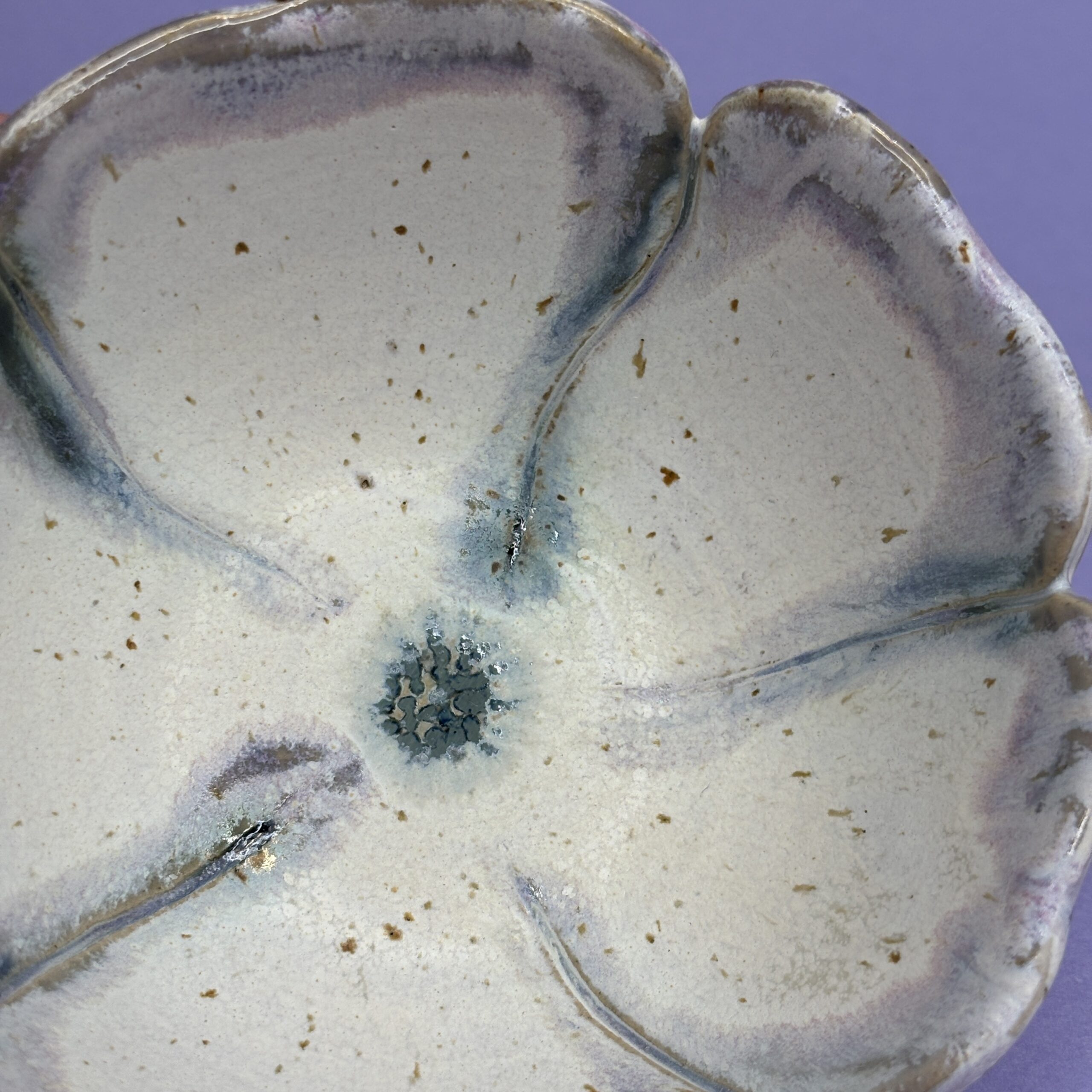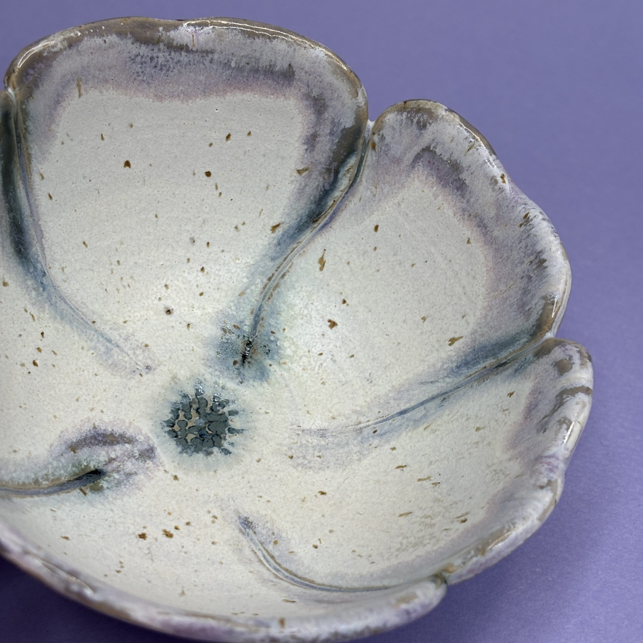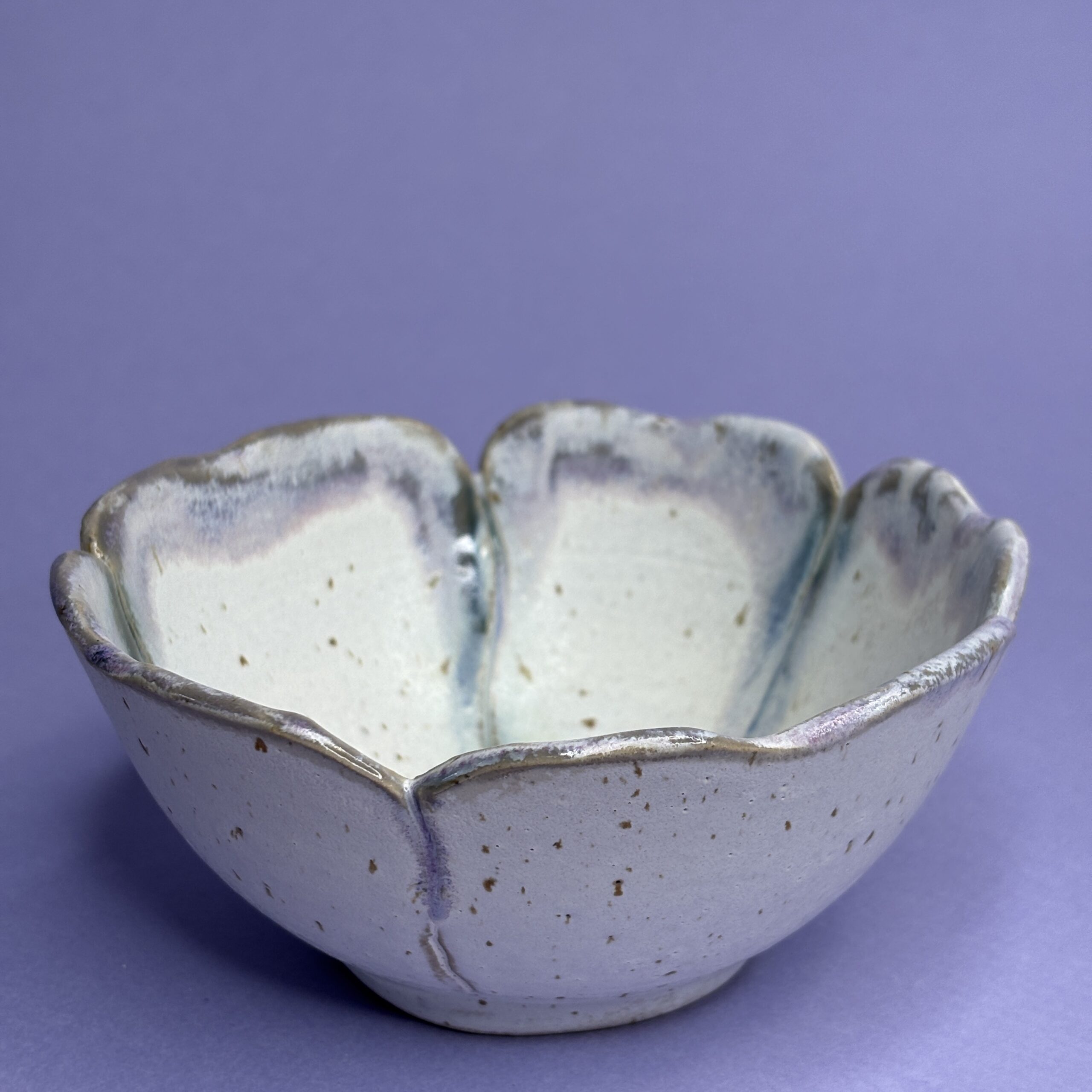 Skålen er hånddrejet i stentøjsler og dekoreret med glasur.