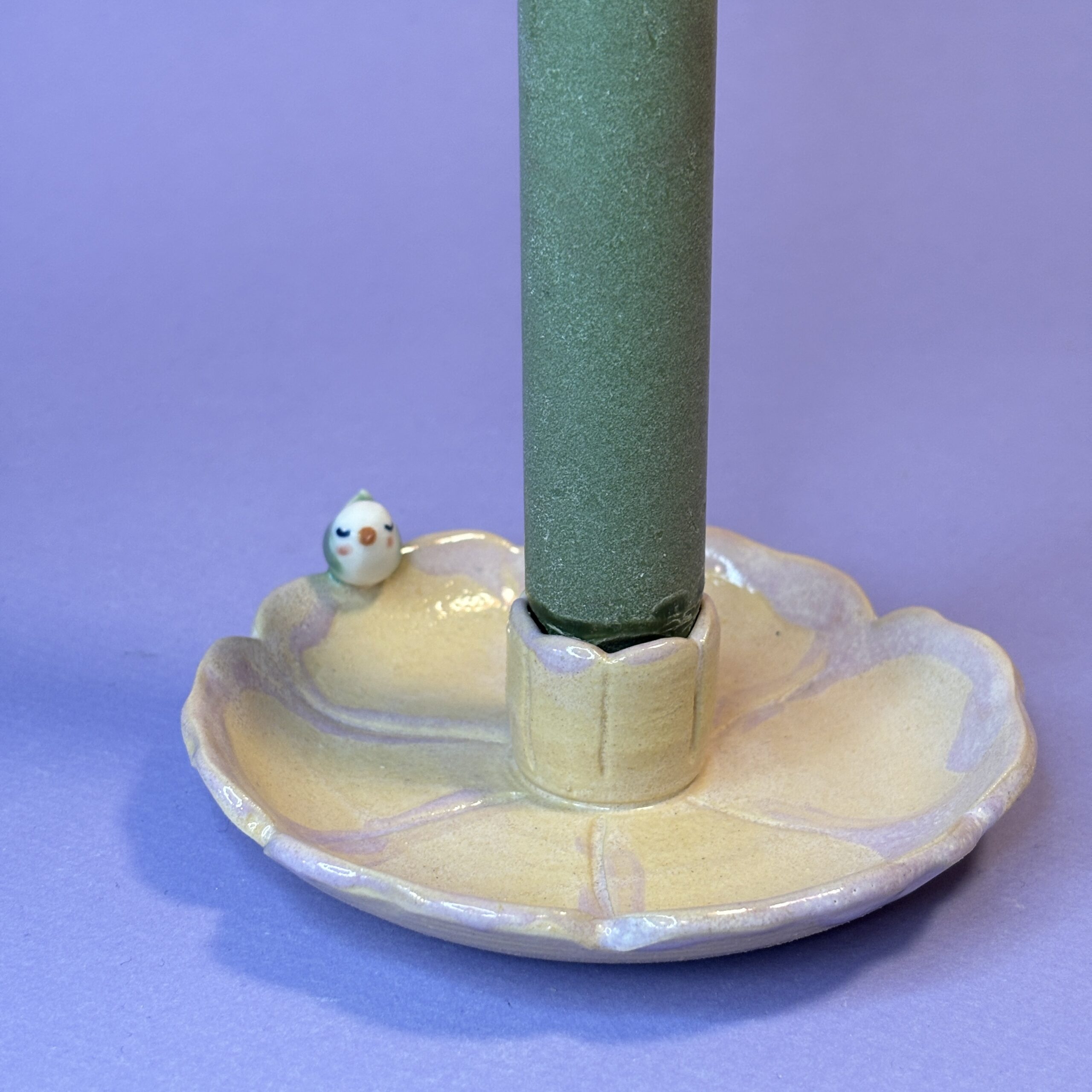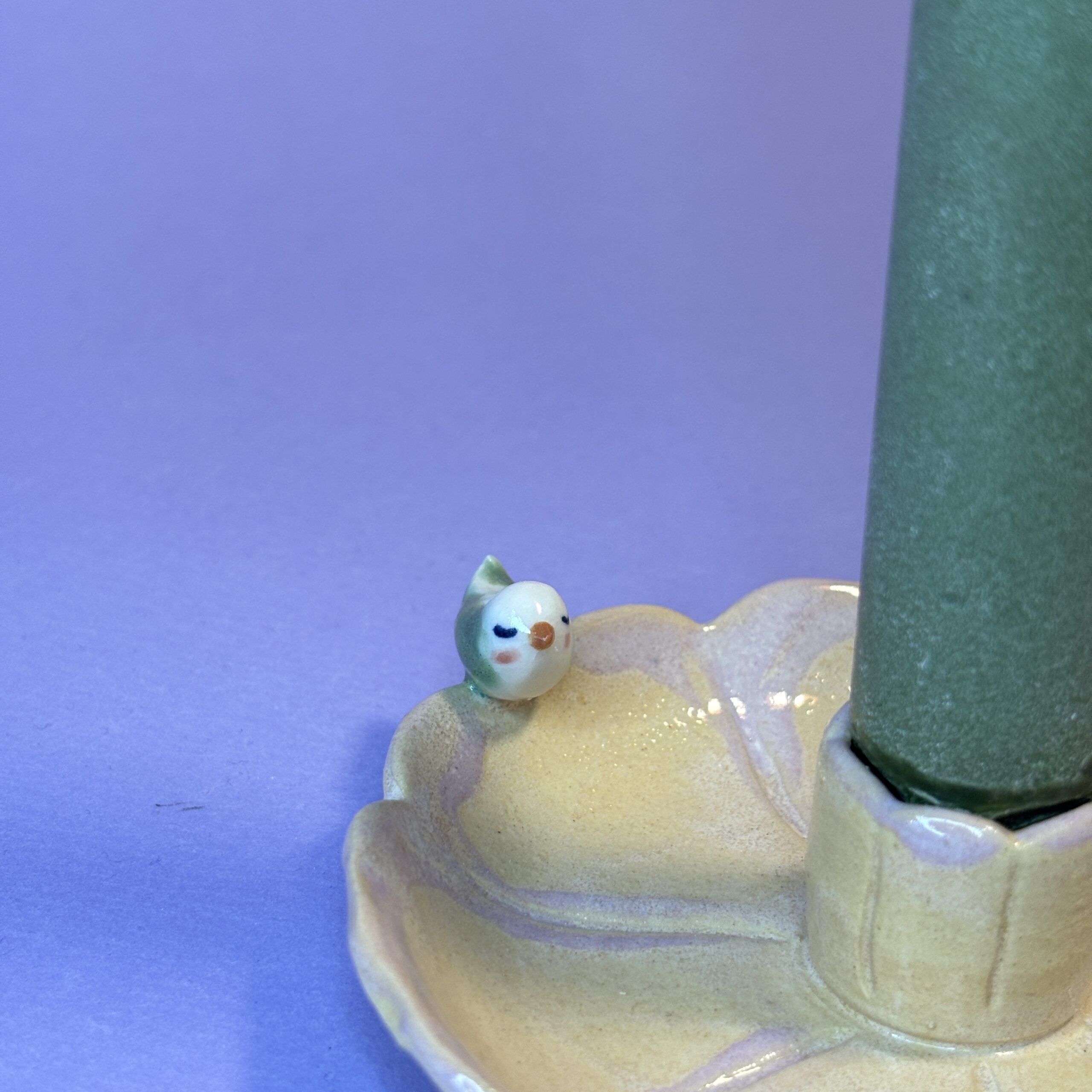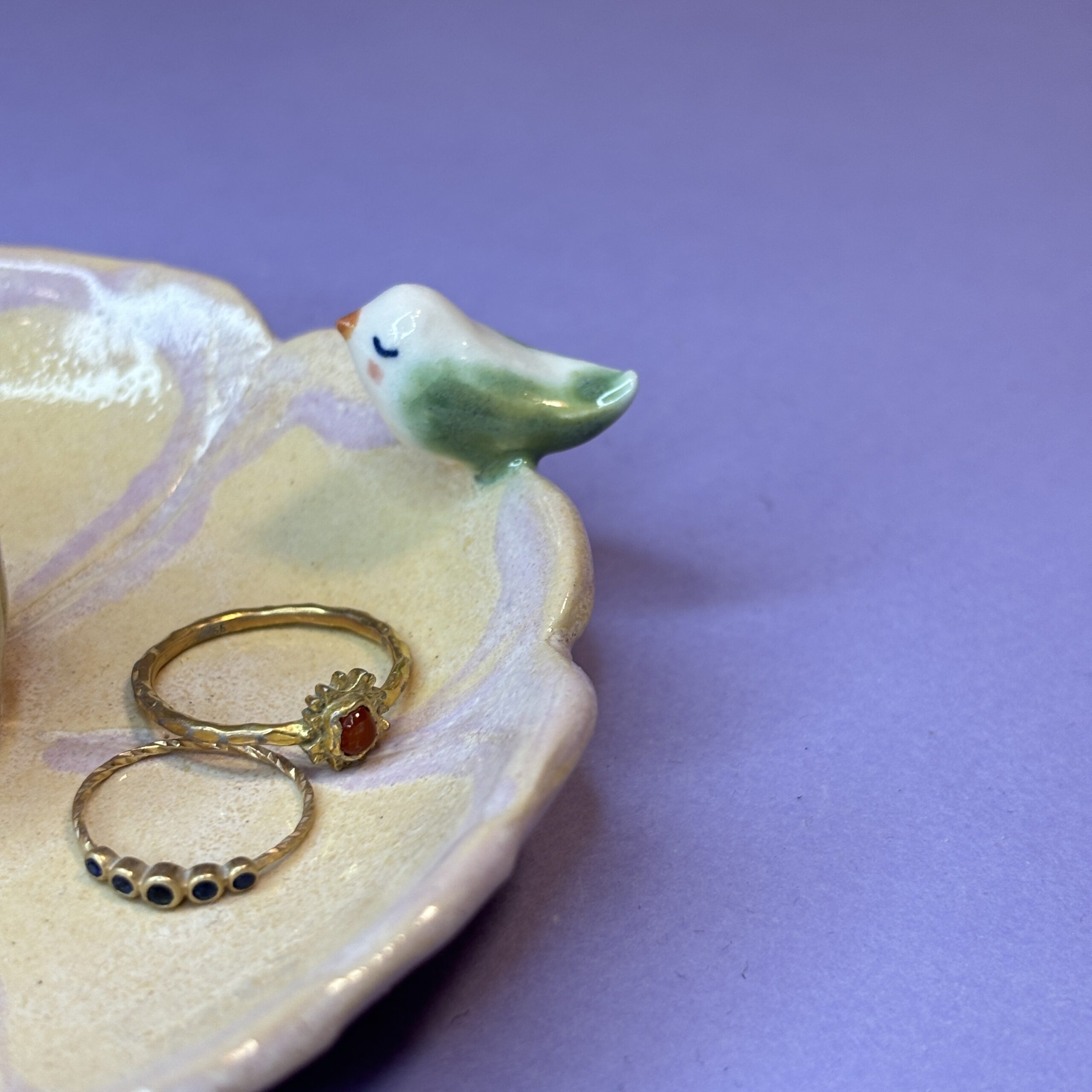 Fin blomsterstage med en lille fugl. Kan samtidig bruges som lille smykkeskål.