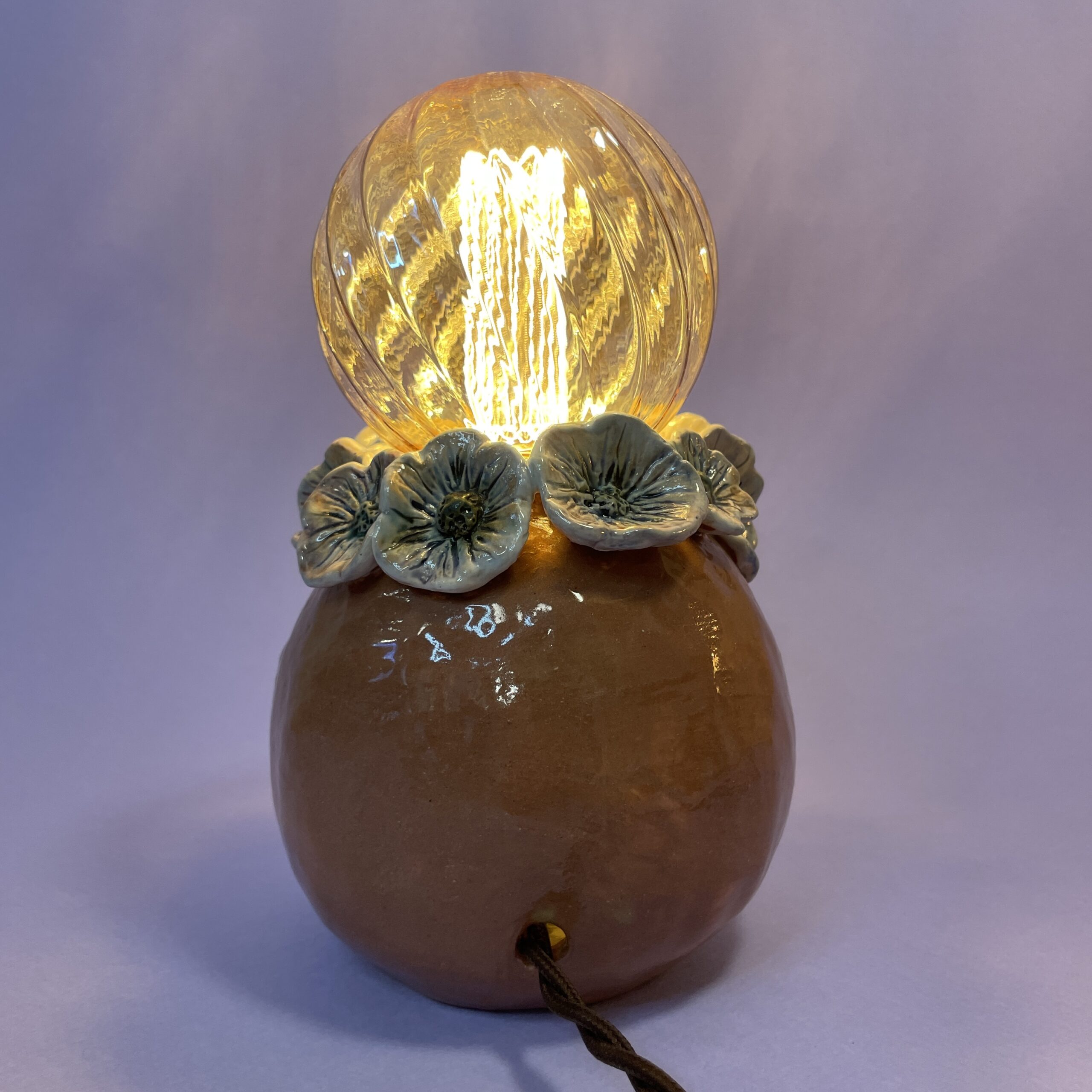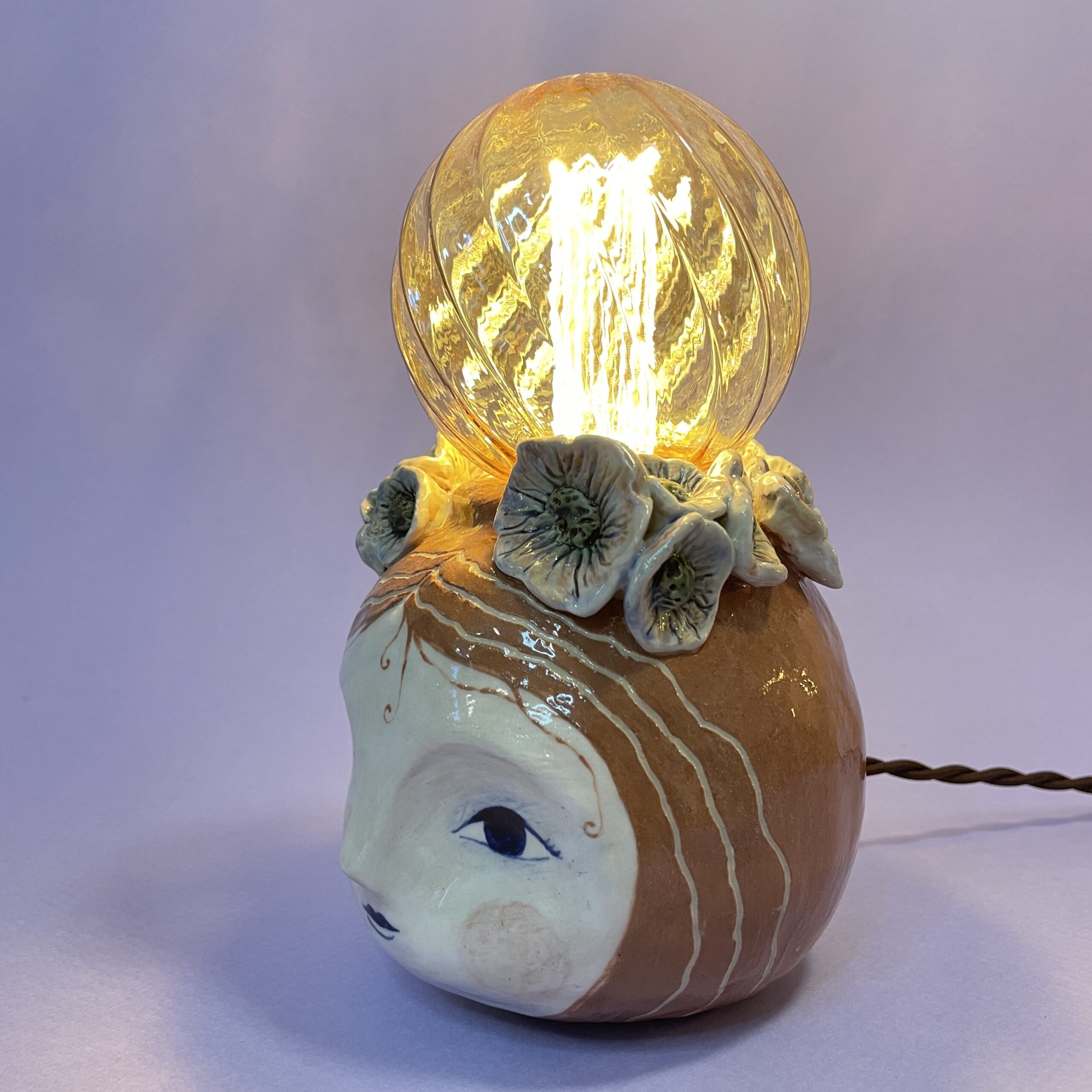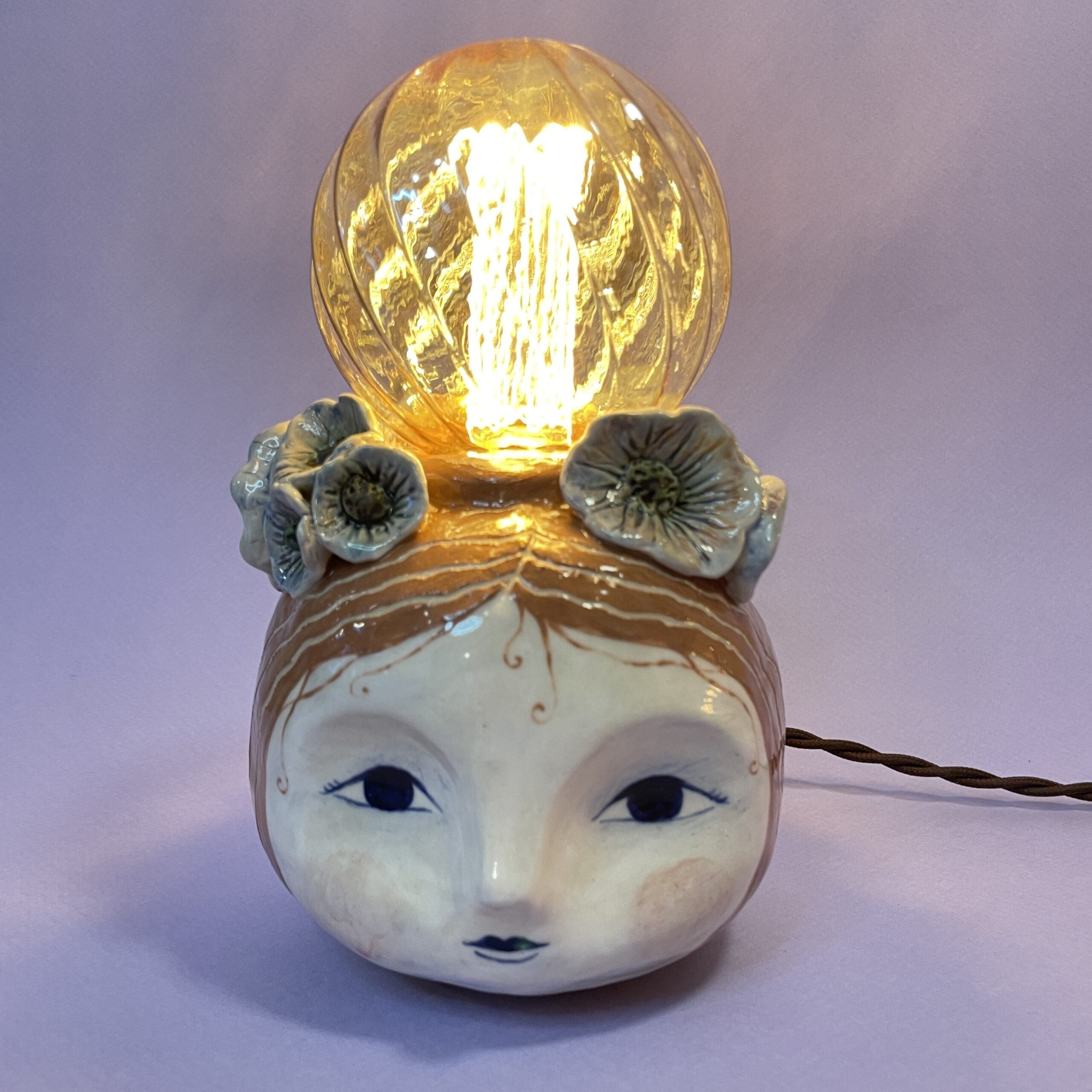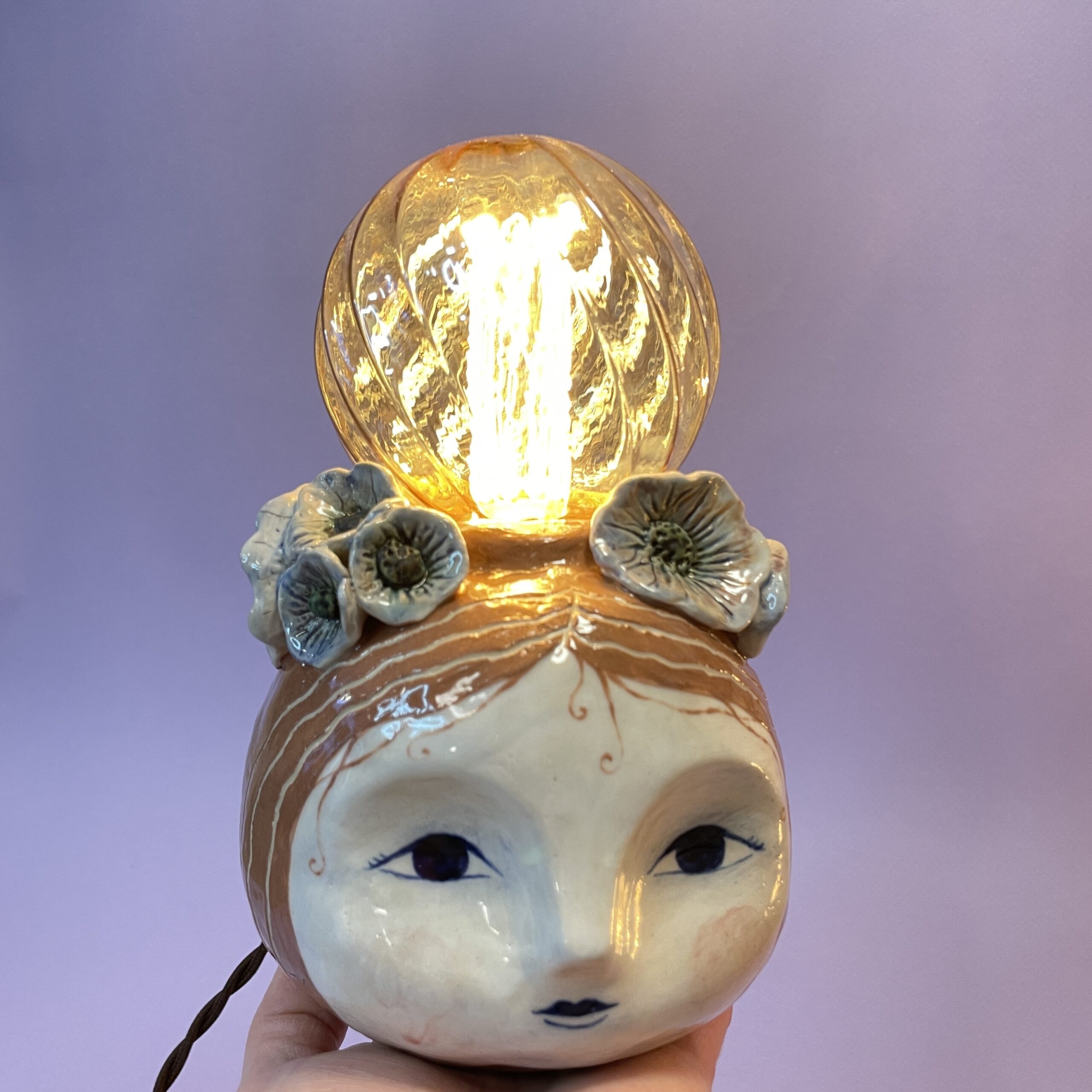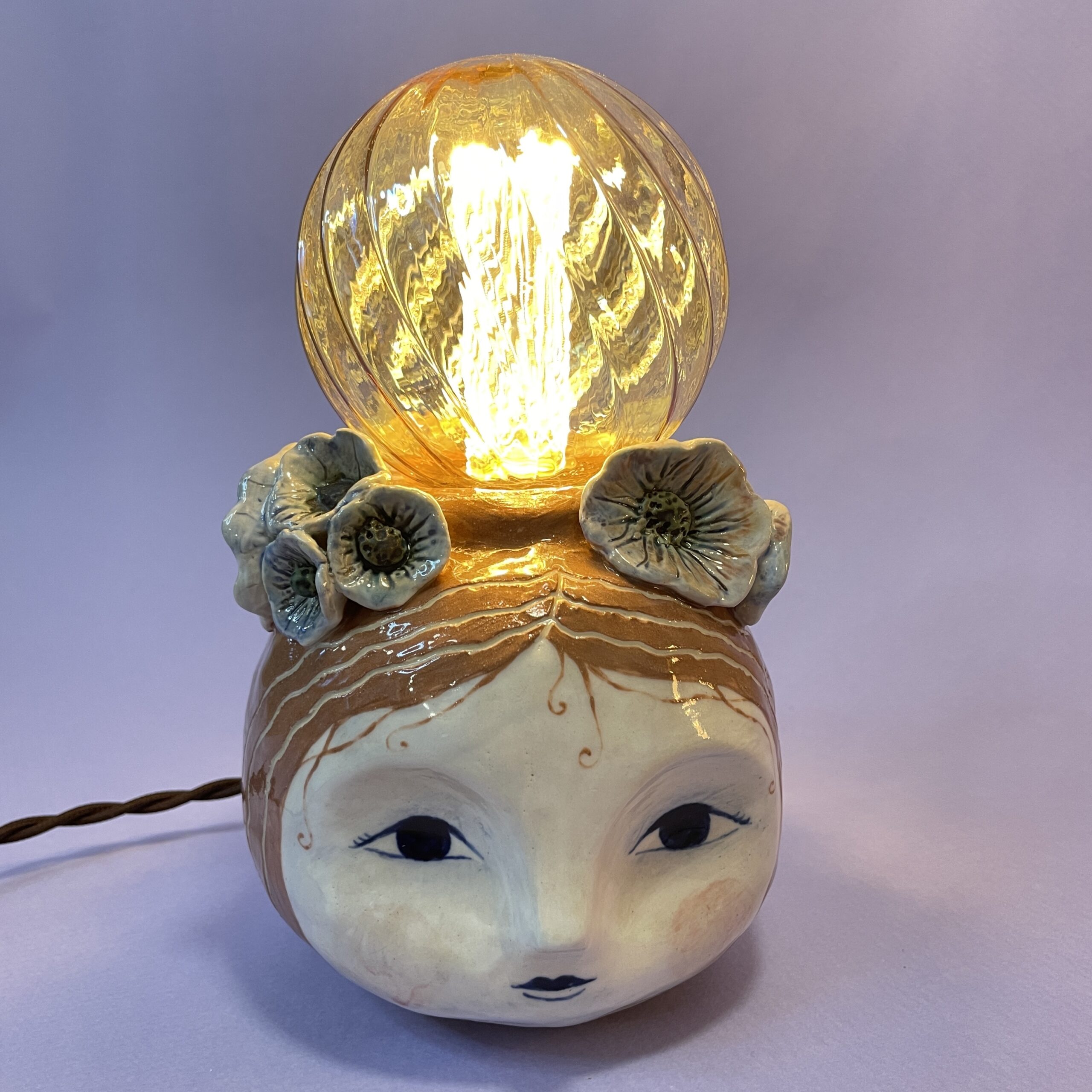 Udtryksfuld bordlampe med fint ansigt og blomsterkrans.