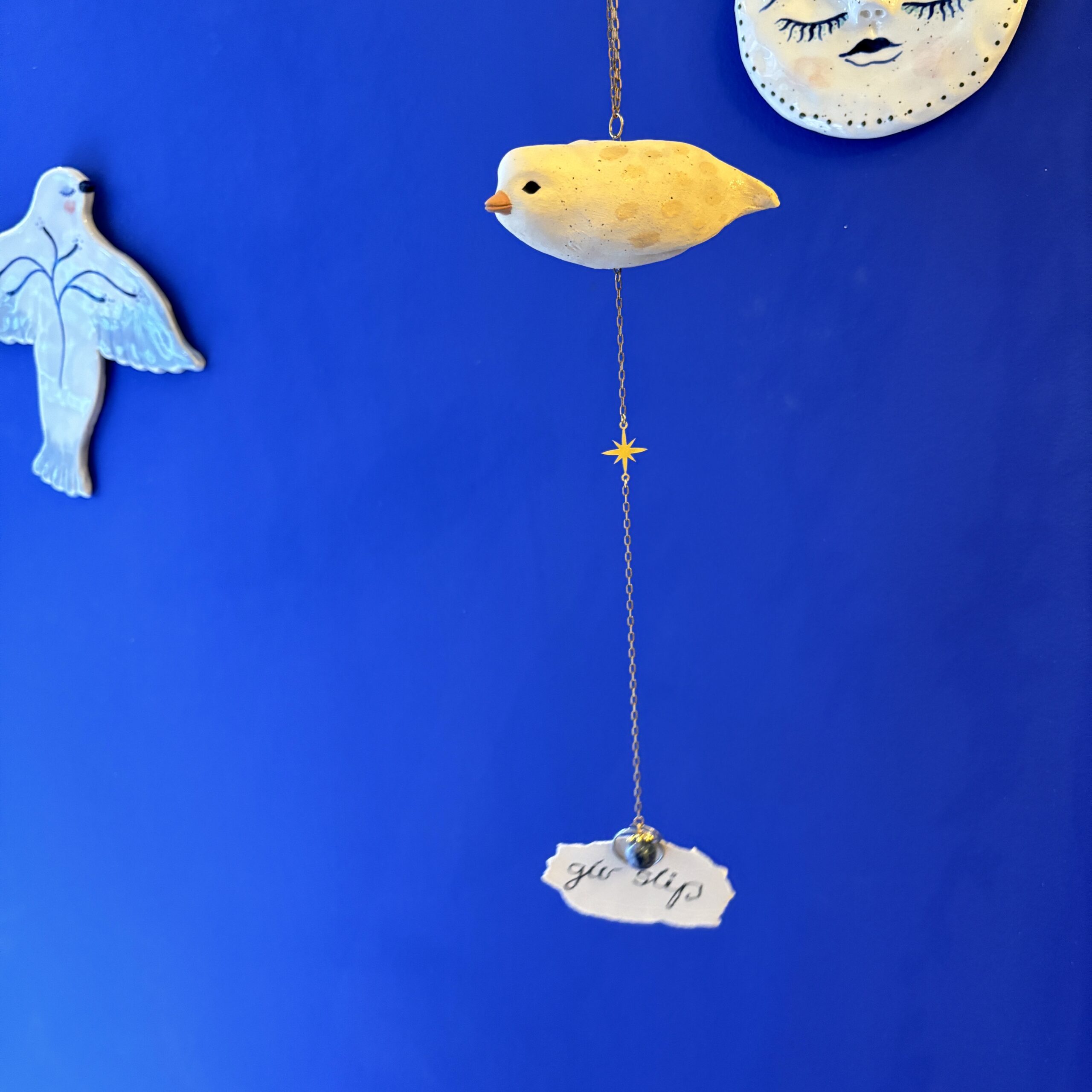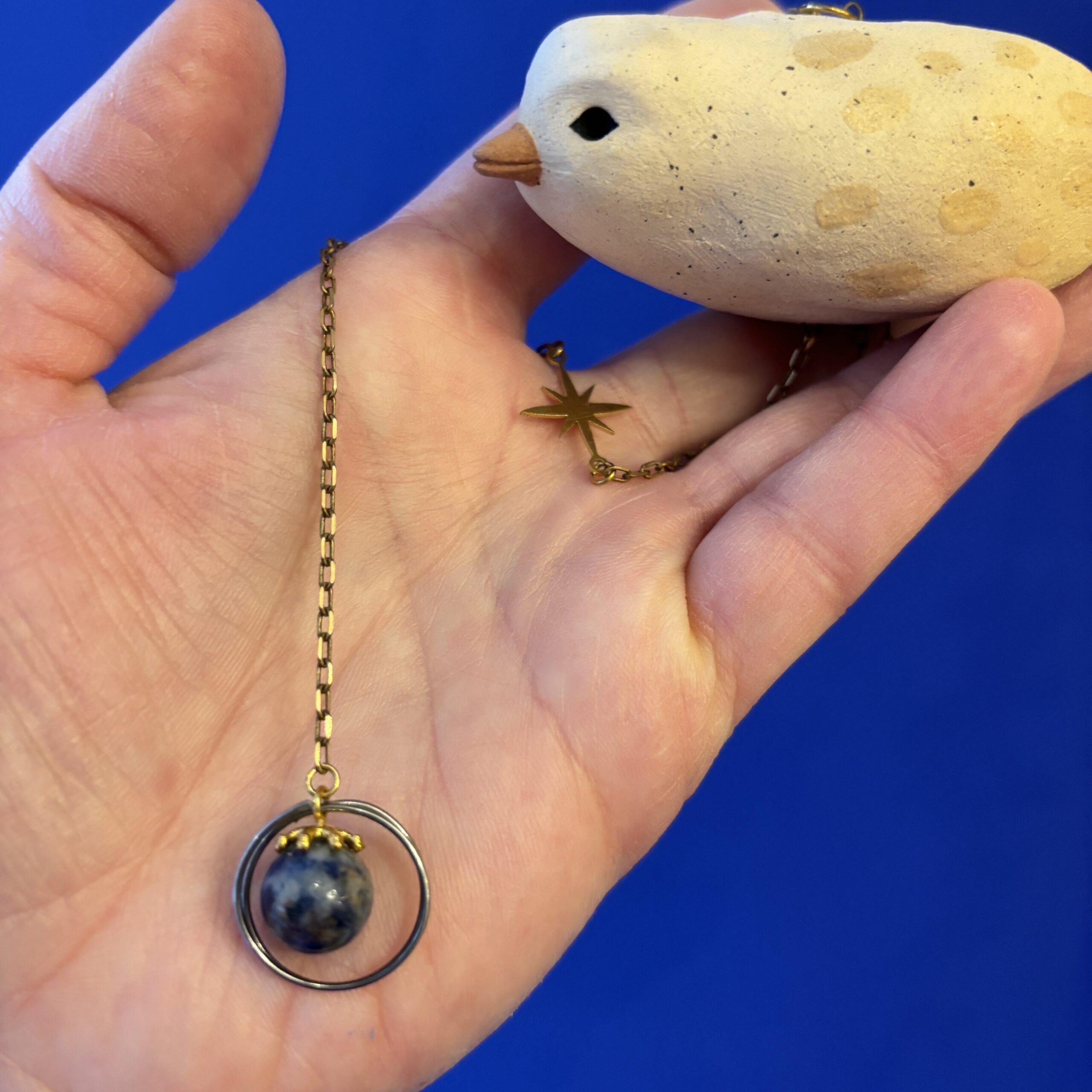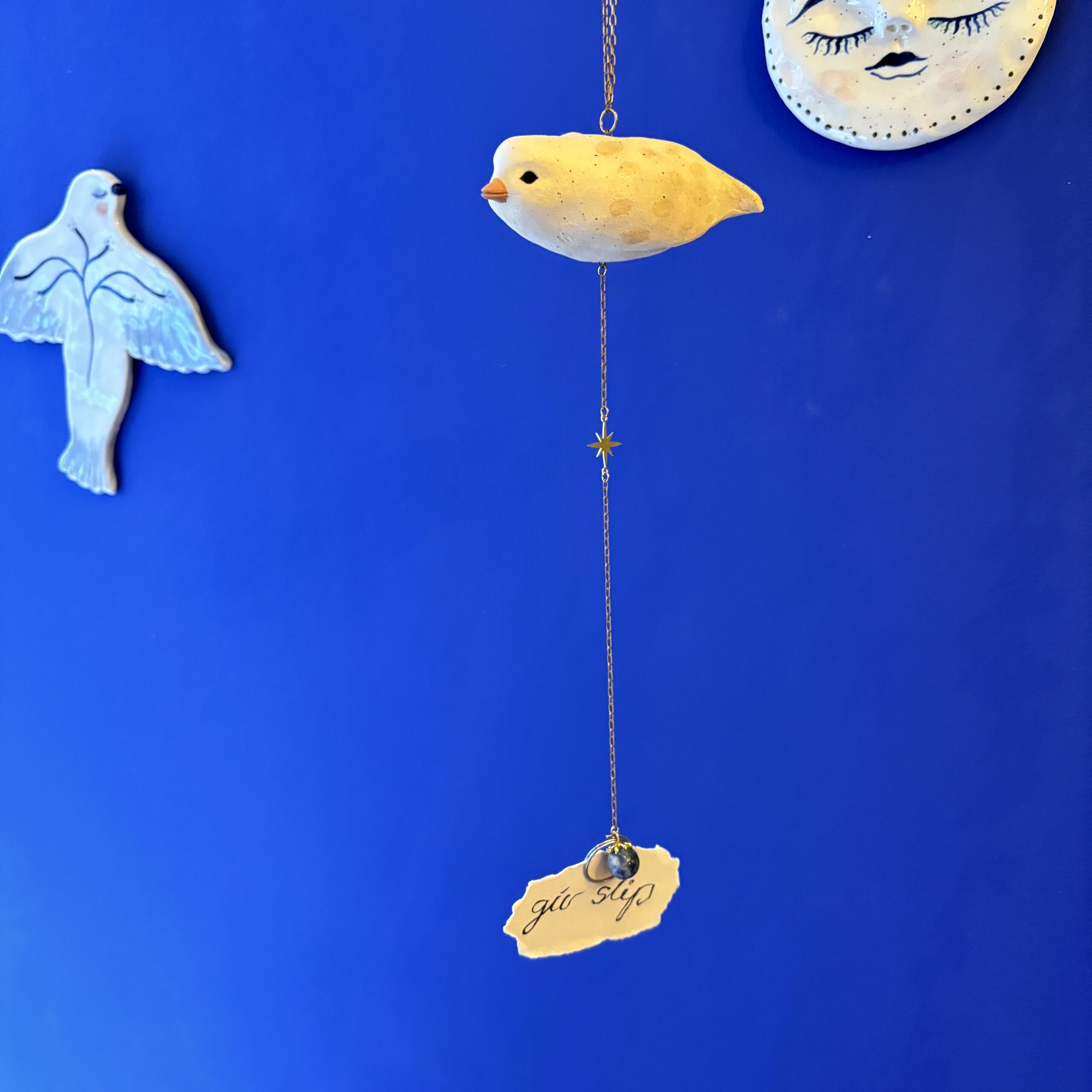 Lille fugl med en blue spot jaspis og med mulighed for at hænge f.eks. et lille budskab, foto, postkort eller lign. Kan hænge fra loftet, i vinduet eller på væggen.