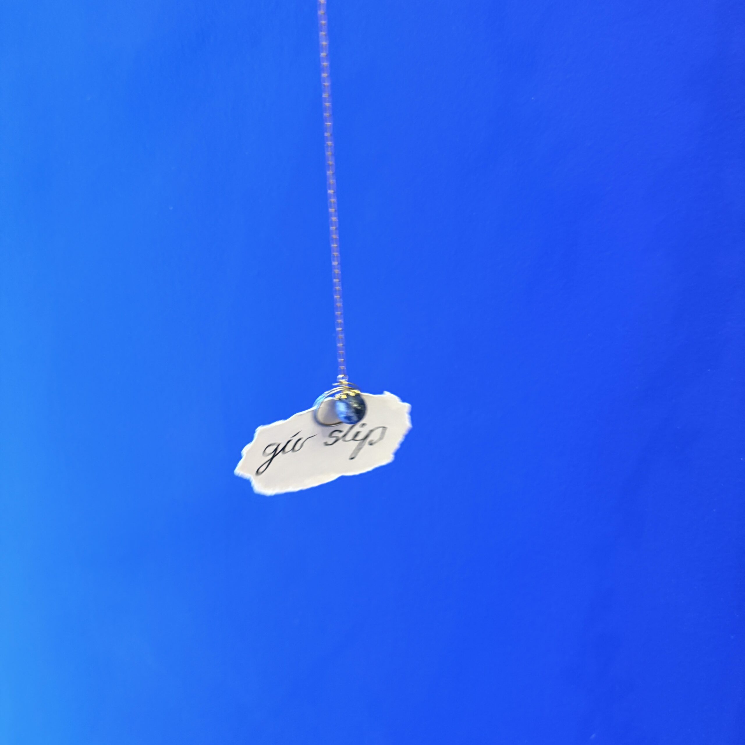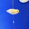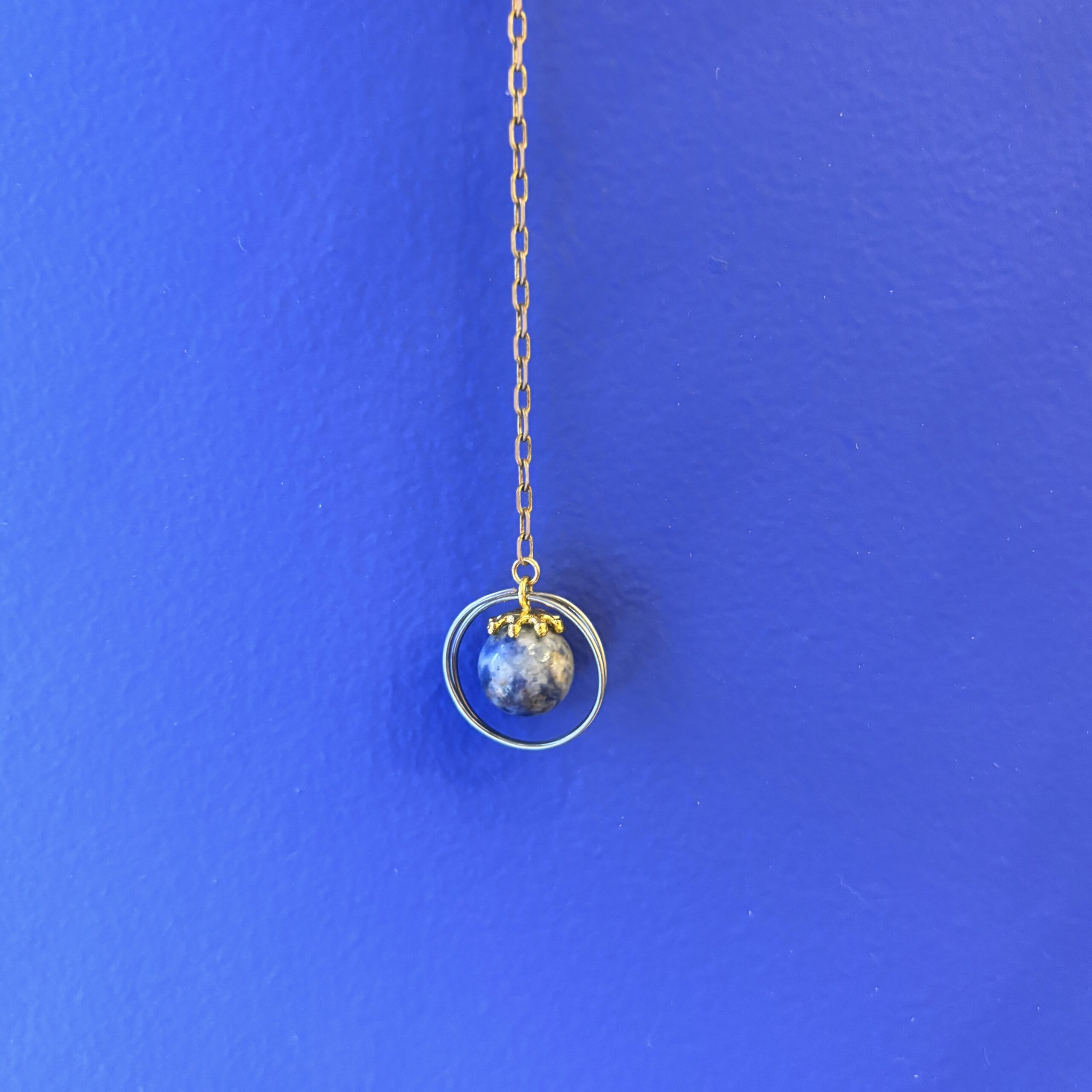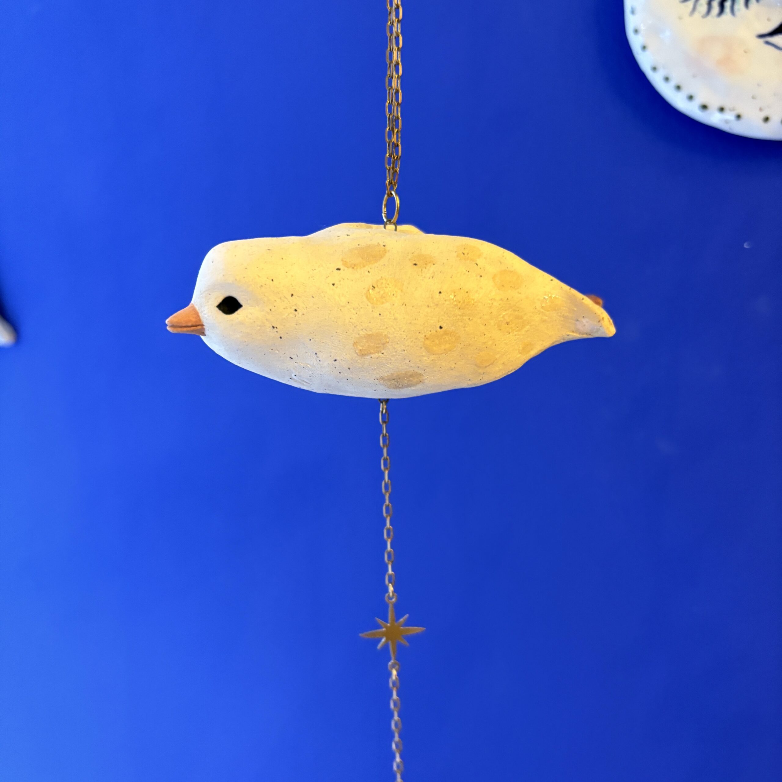Lille fugl med en blue spot jaspis og med mulighed for at hænge f.eks. et lille budskab, foto, postkort eller lign. Kan hænge fra loftet, i vinduet eller på væggen.