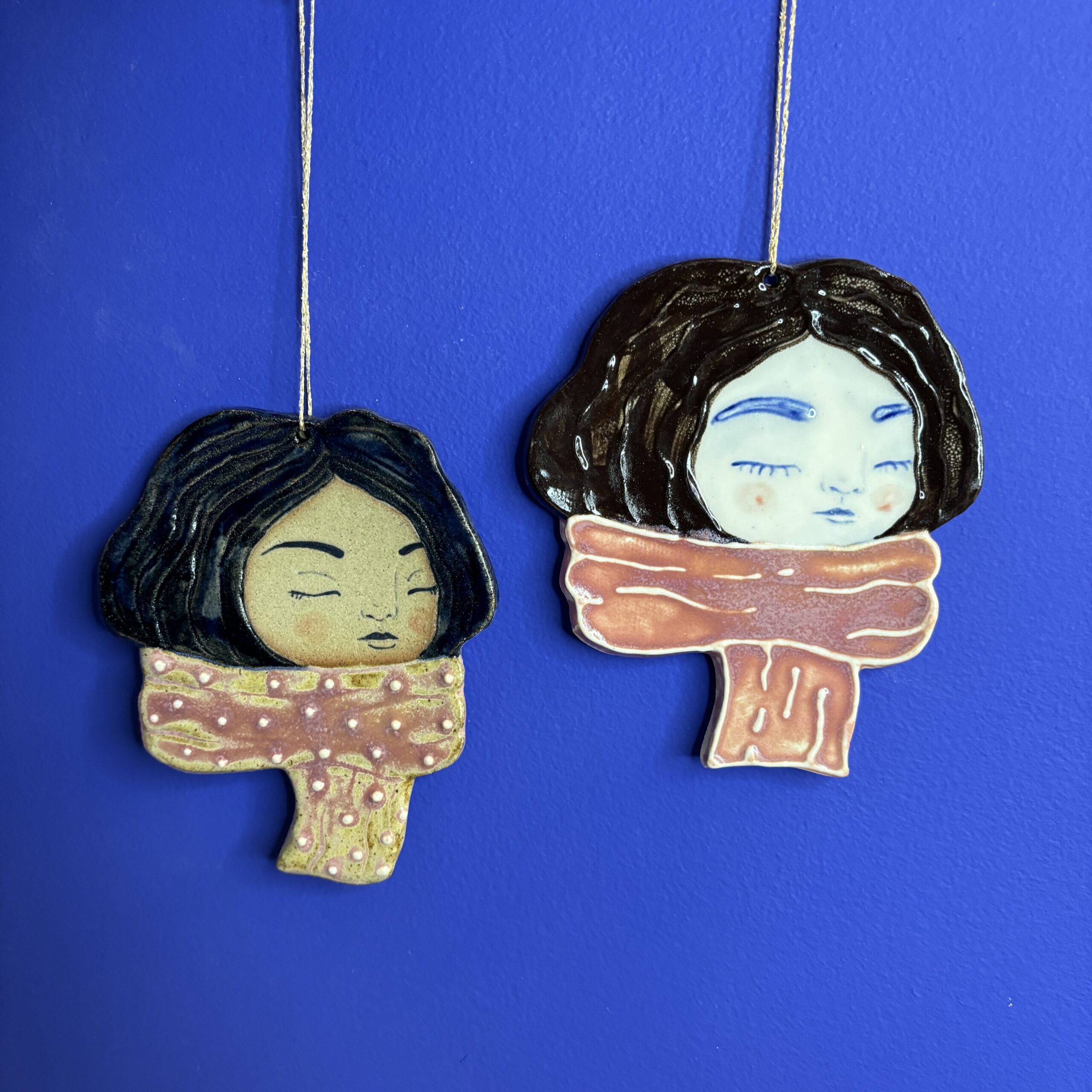 Ophængene er lavet af lyst stentøjsler og dekoreret med glasur. Kan hænge på væggen med eller uden snor med et lille søm.