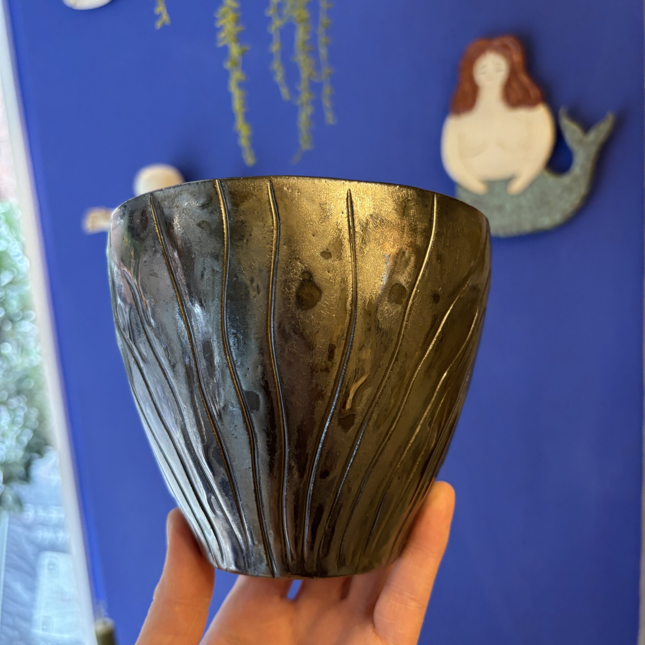 Potten er håndlavet i stentøjsler og dekoreret med glasur.