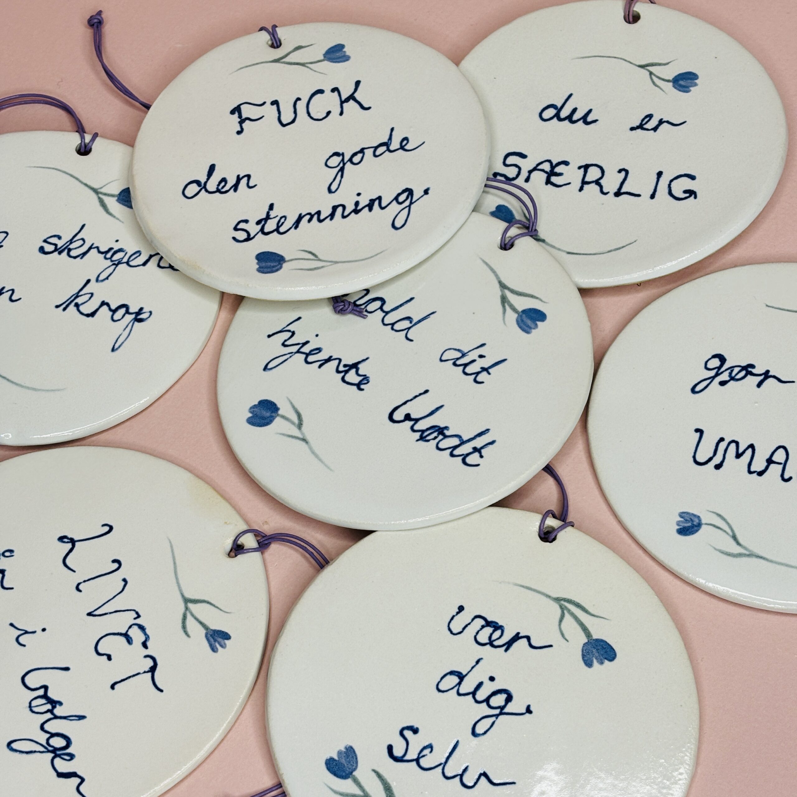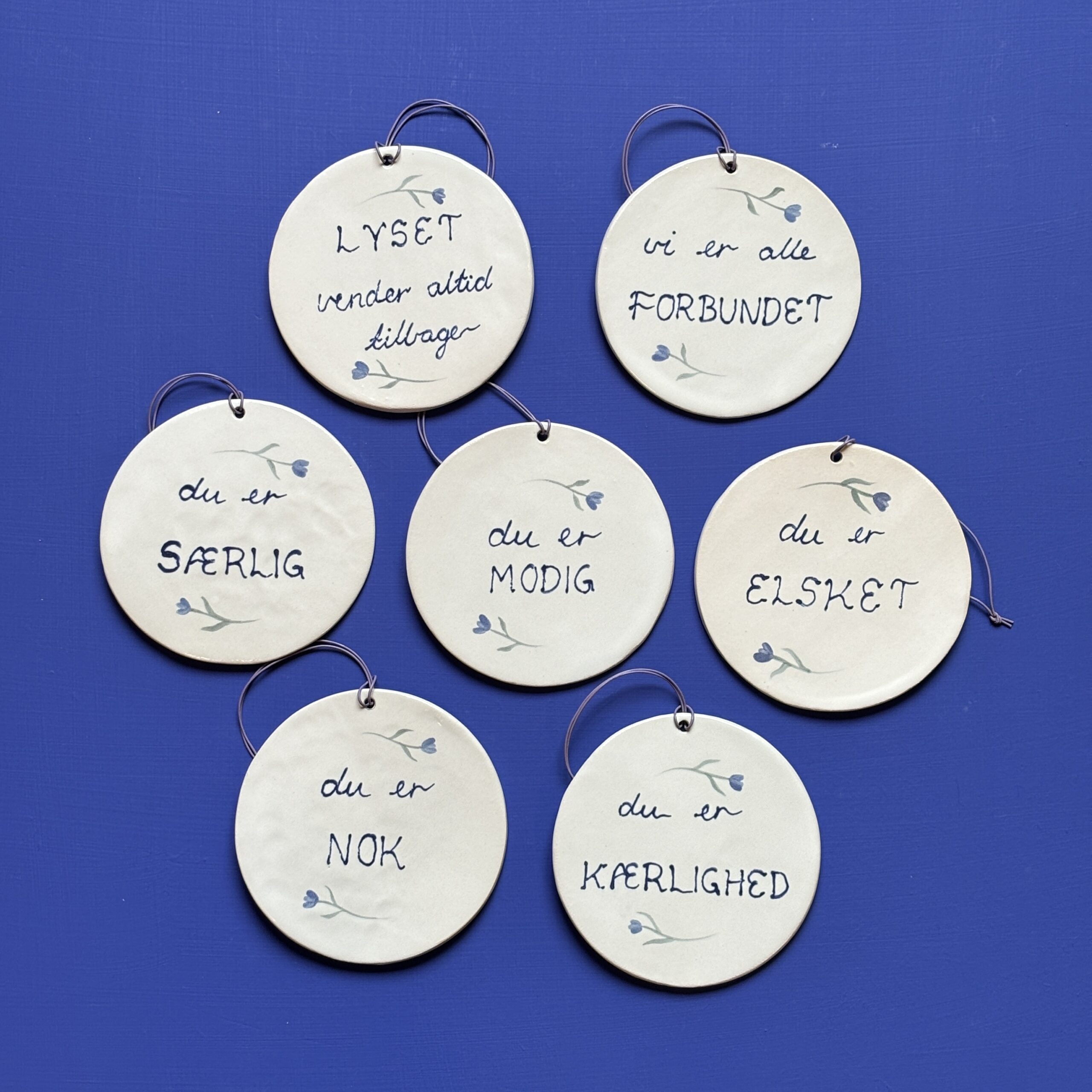 Små keramikophæng med store budskaber – en kærlig påmindelse om det, der virkelig betyder noget. Hæng dem på væggen eller i vinduet, hvor du ser dem ofte, eller giv dem som en meningsfuld gave til en af dine kære. En kærlig hilsen fra universet, der minder dig om, at du er præcis, hvor du skal være.