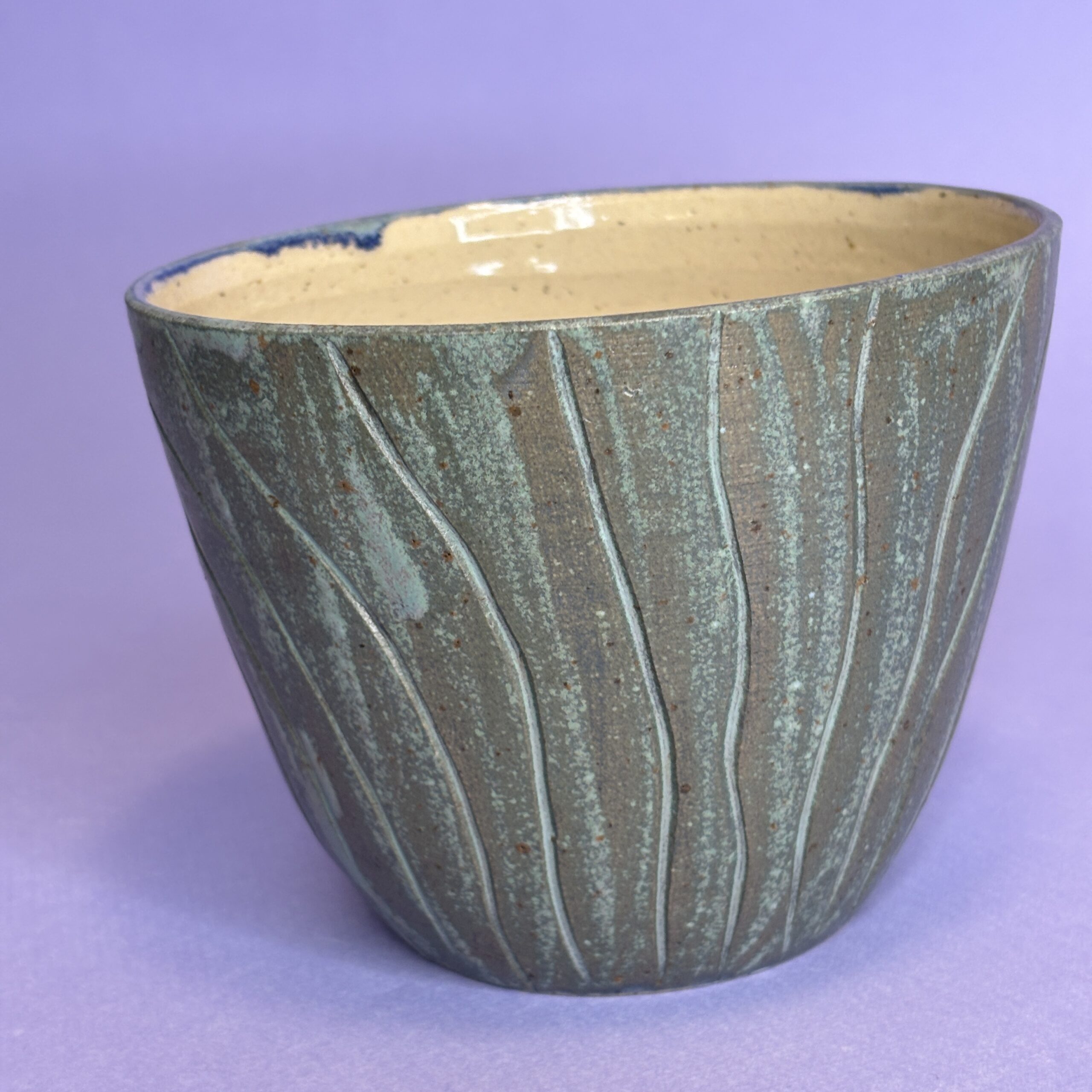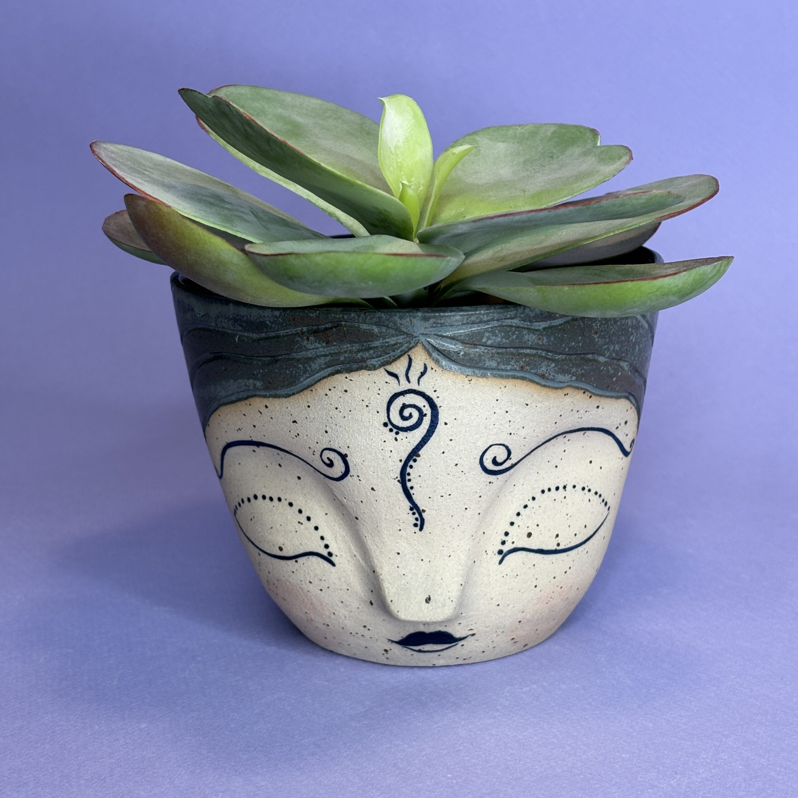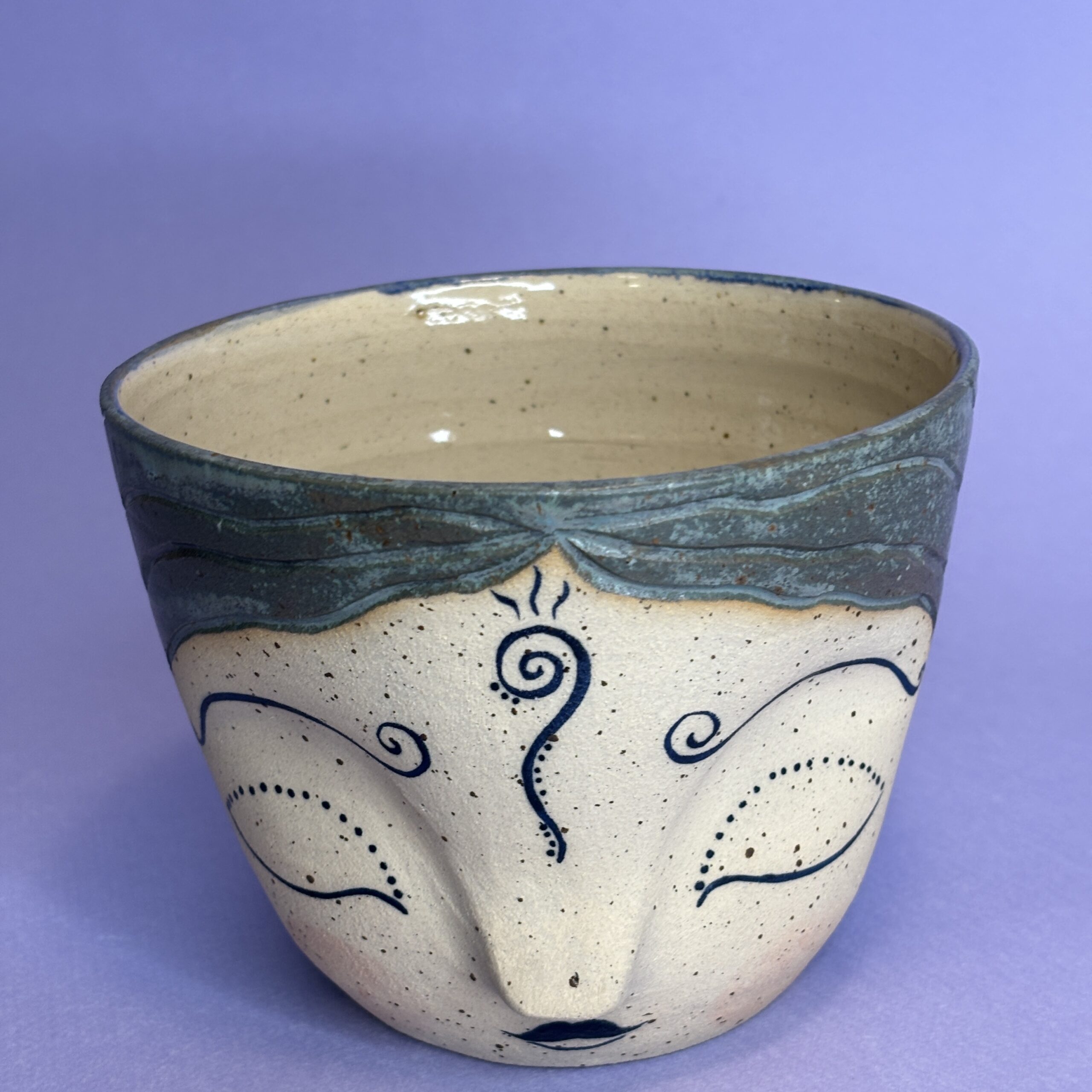 Hånddrejet ansigtspotte i stentøjsler og dekoreret med glasur.