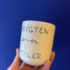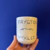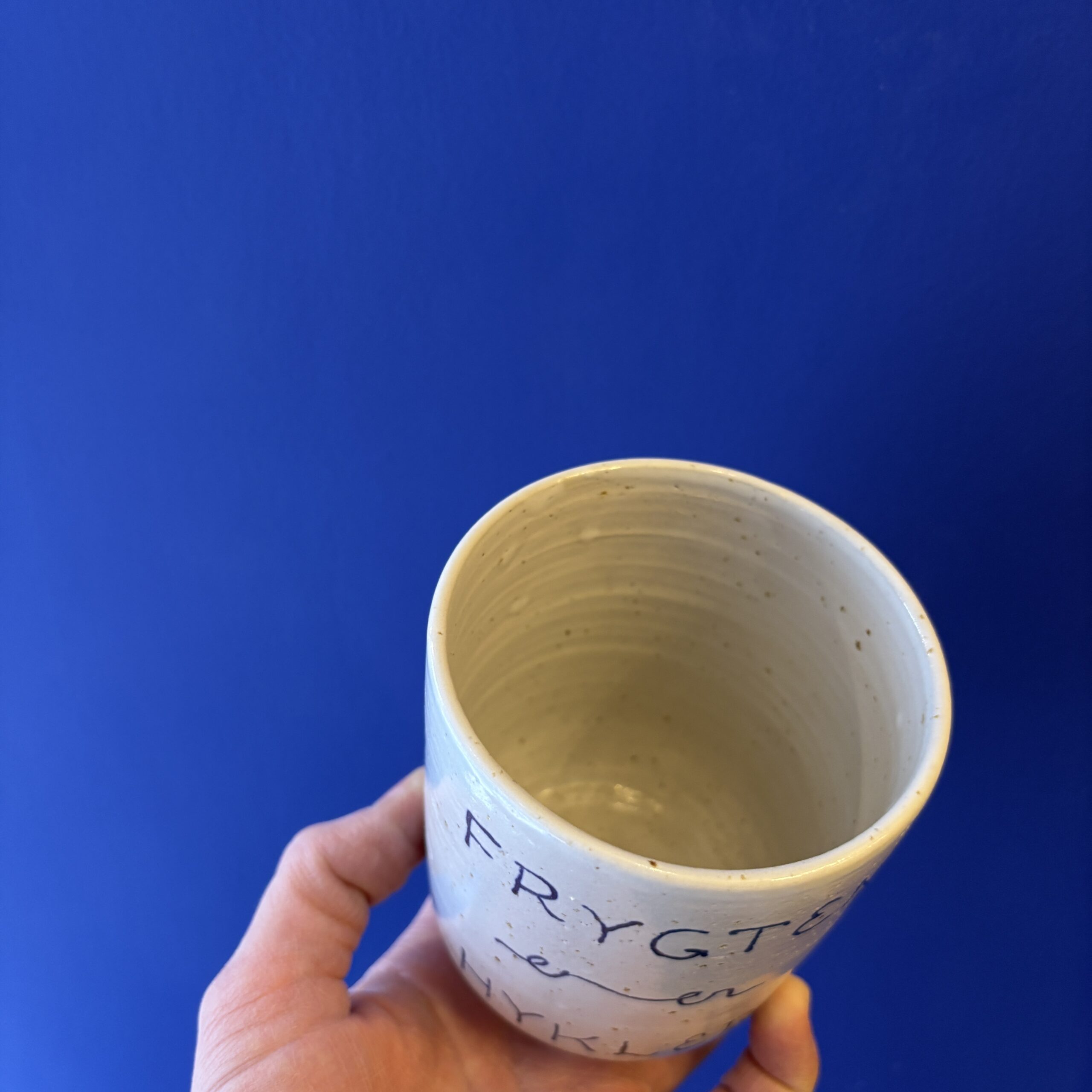 Koppen er drejet i stentøjsler og dekoreret med glasur.