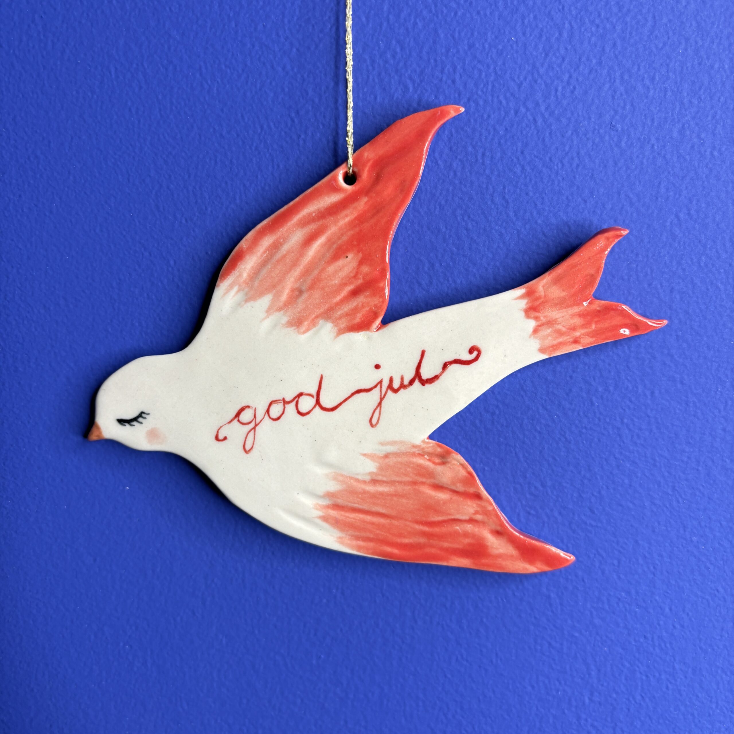 Nuttet keramikfugl med ønsket om en god jul.