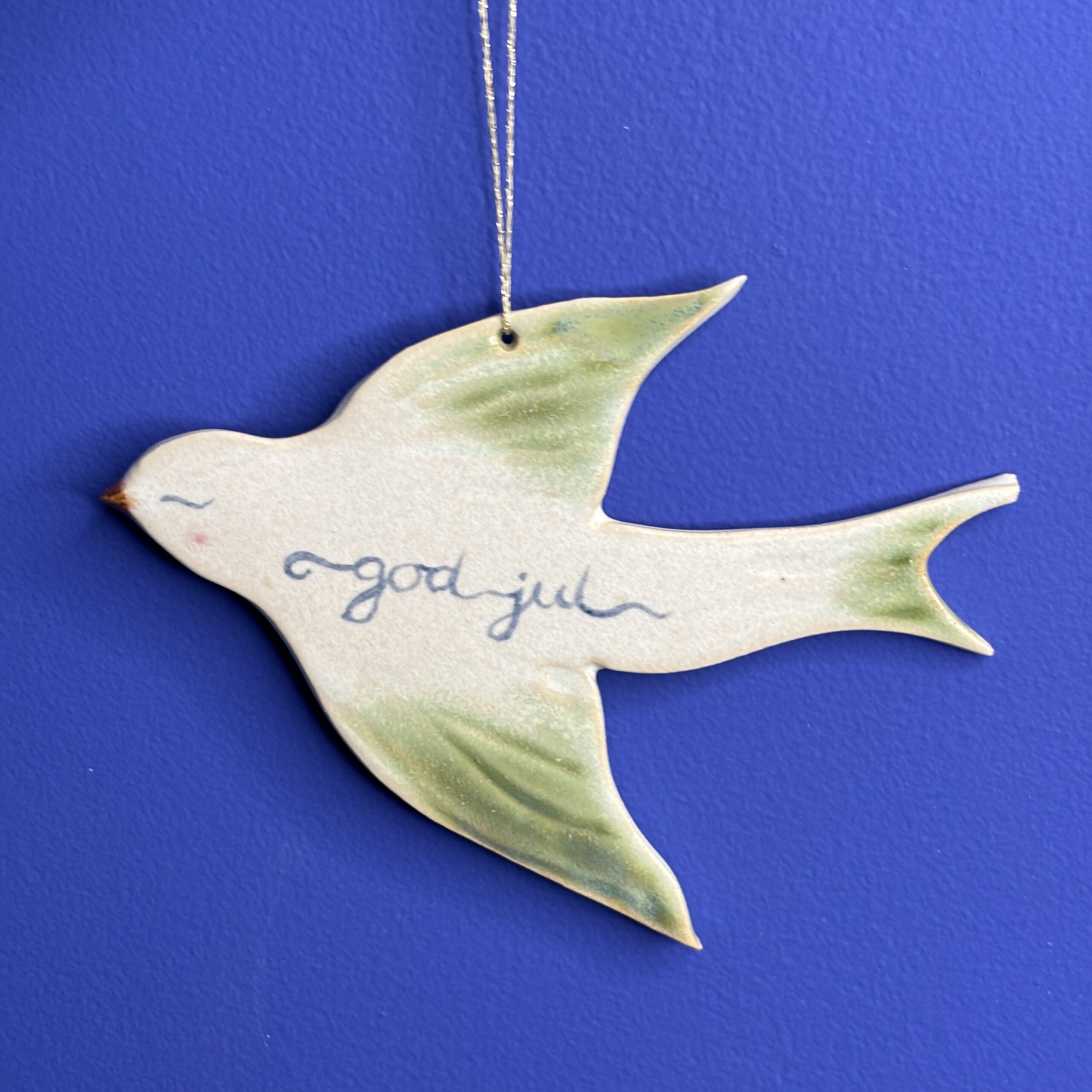 Nuttet keramikfugl med ønsket om en god jul.