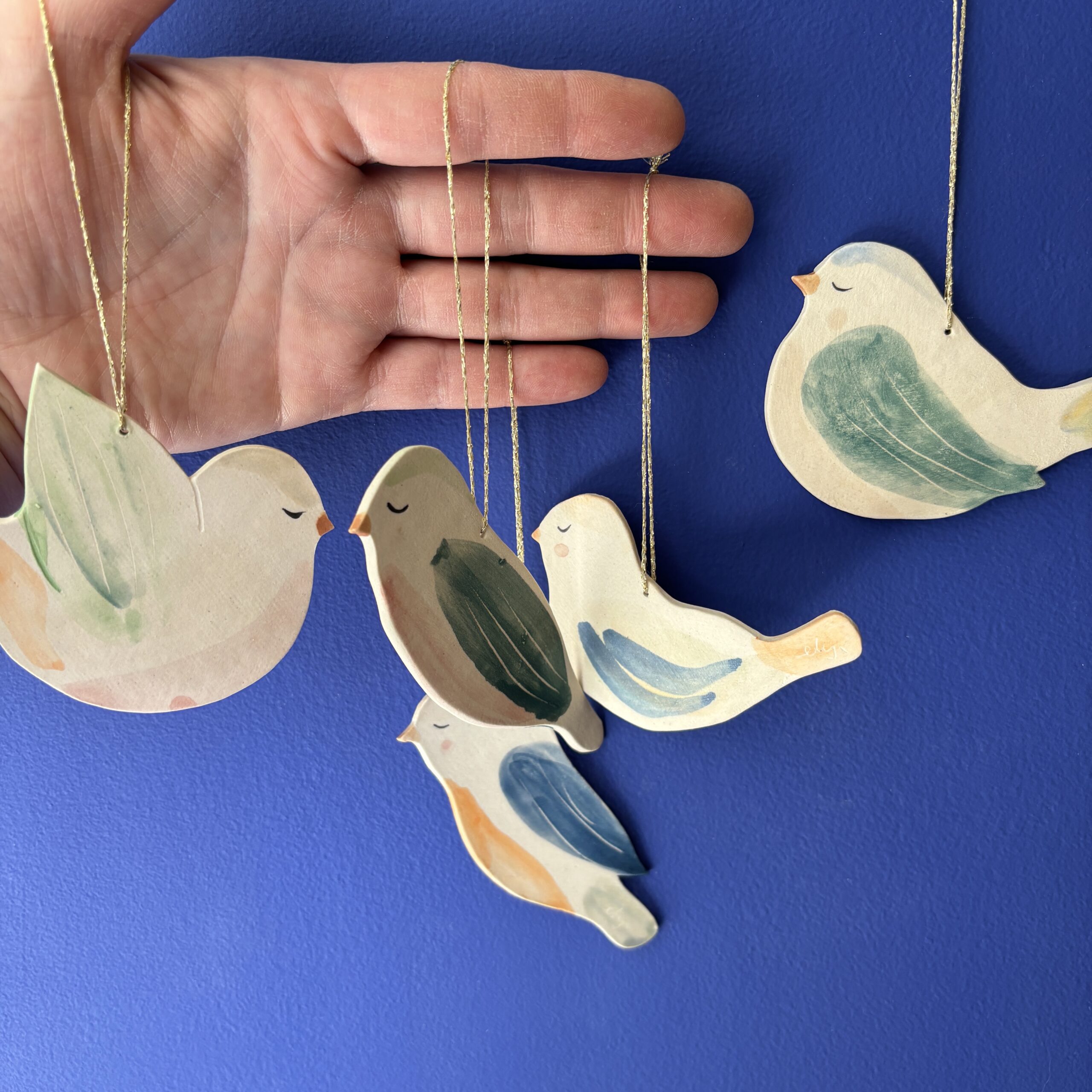 En fugleflok på fem dekorative fugle, der pynter flot i vinduet eller på en gren. Fuglene er alle forskellige og dekoreret på begge sider.