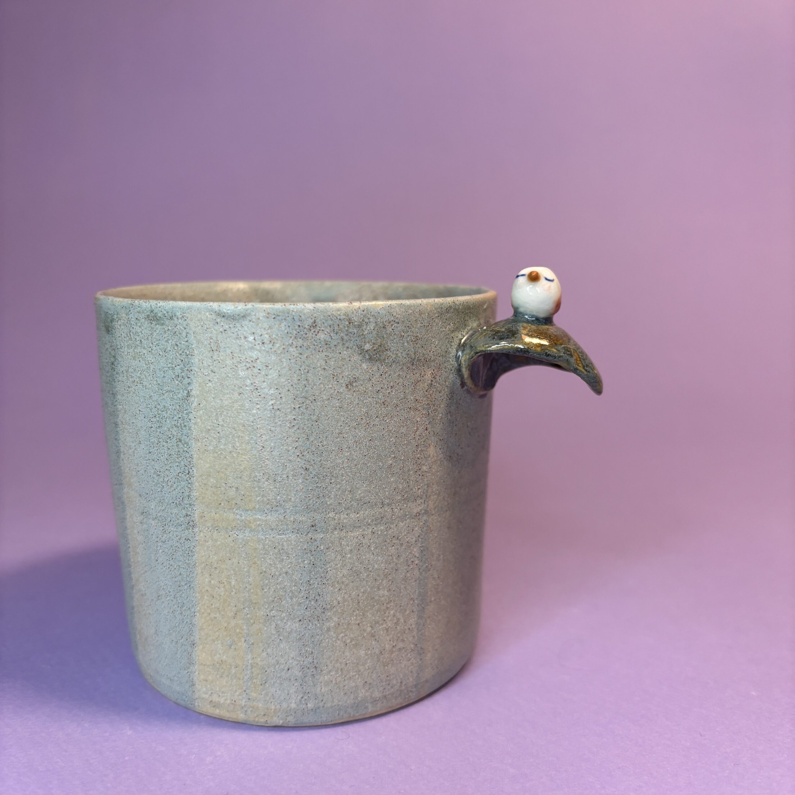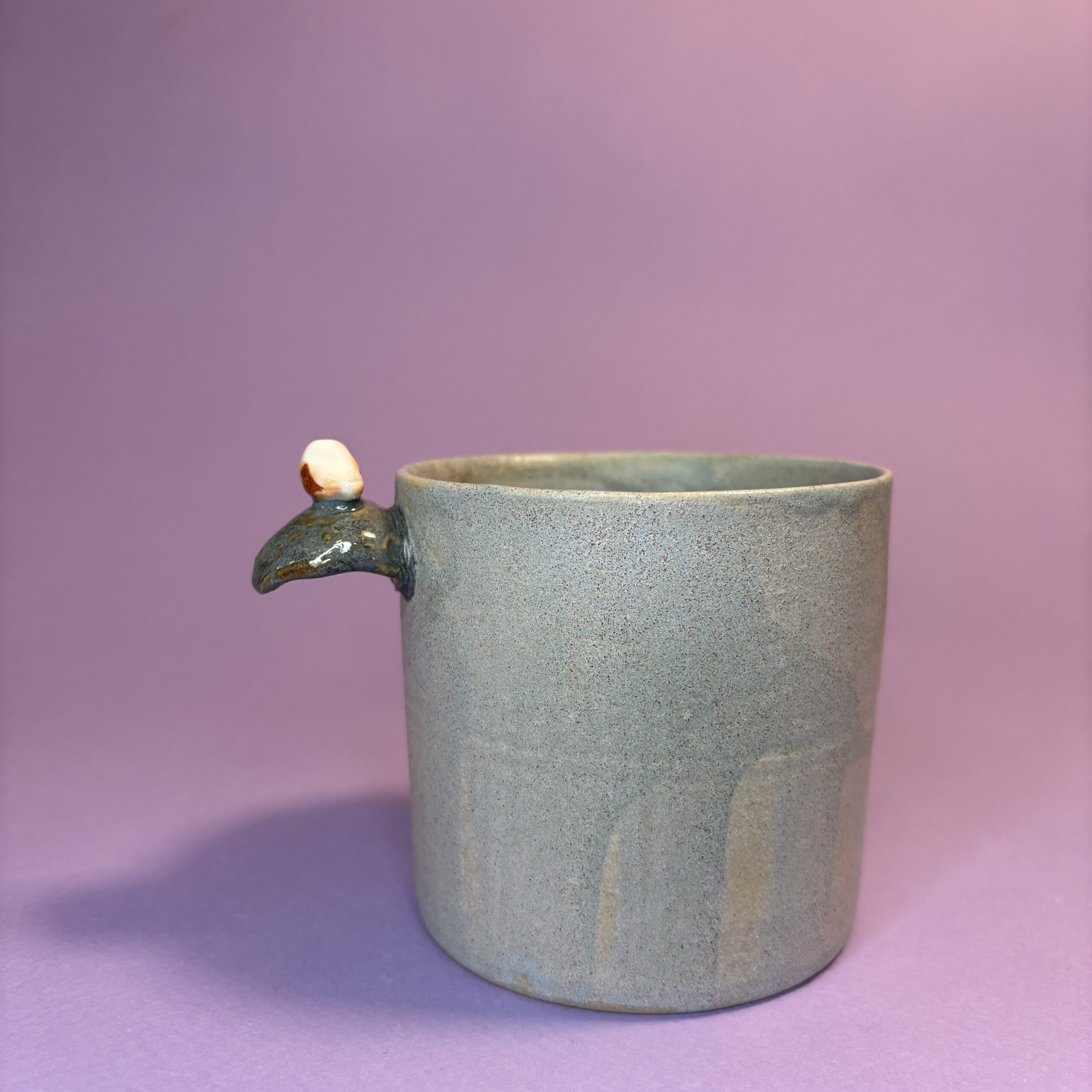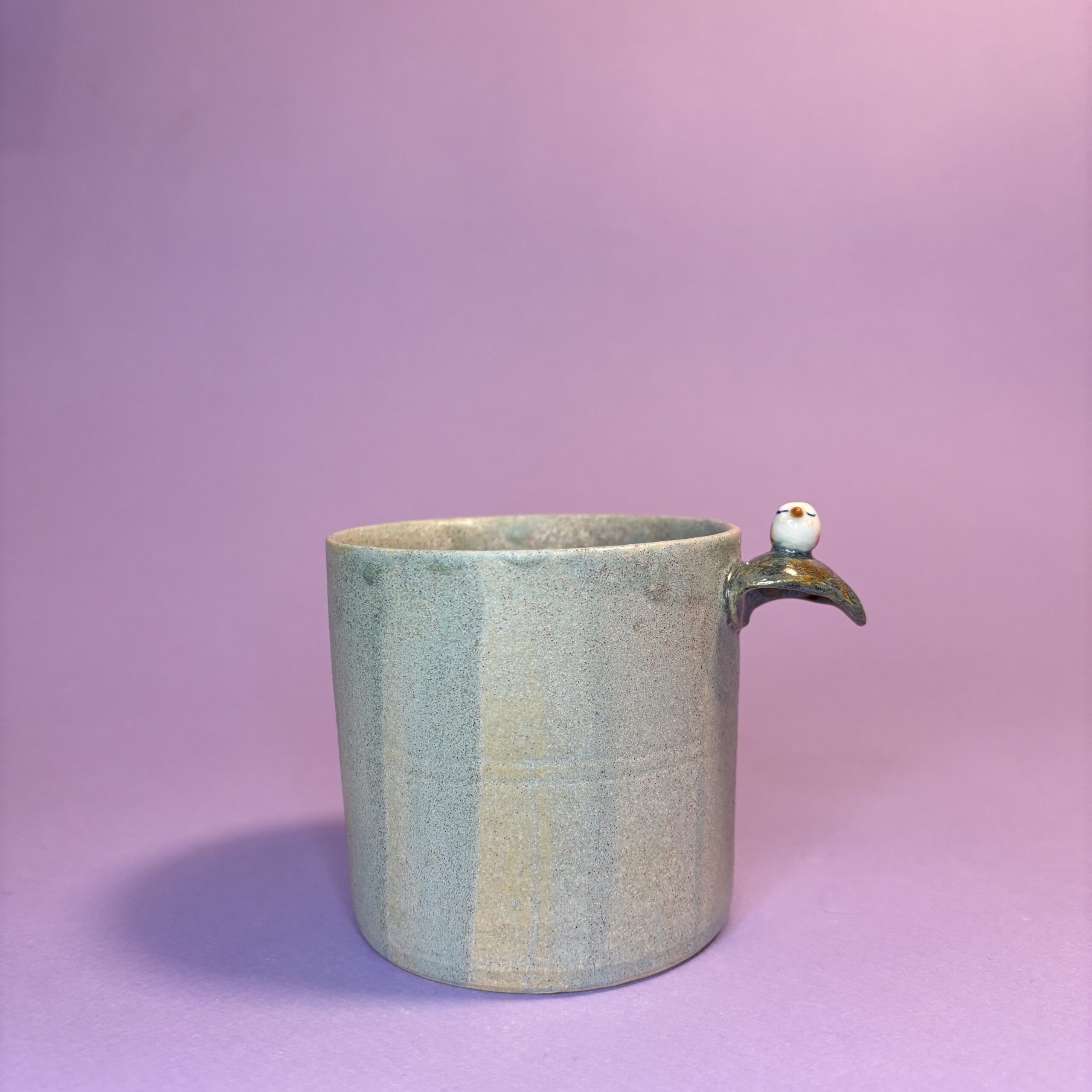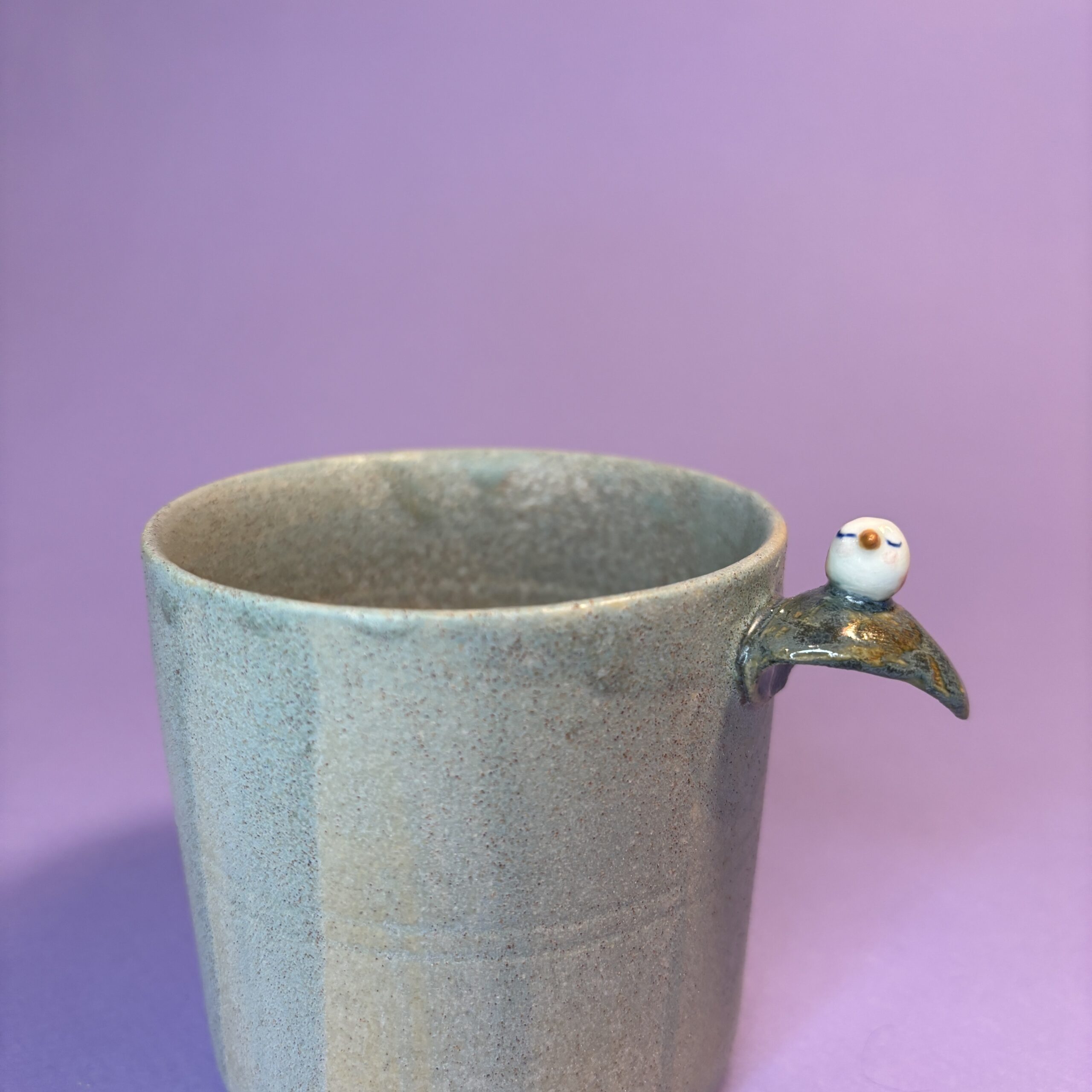 Kop med sød lille pipfugl på blad. Bladet fungerer som hank – den hviler på pegefingeren, når du griber om koppen.