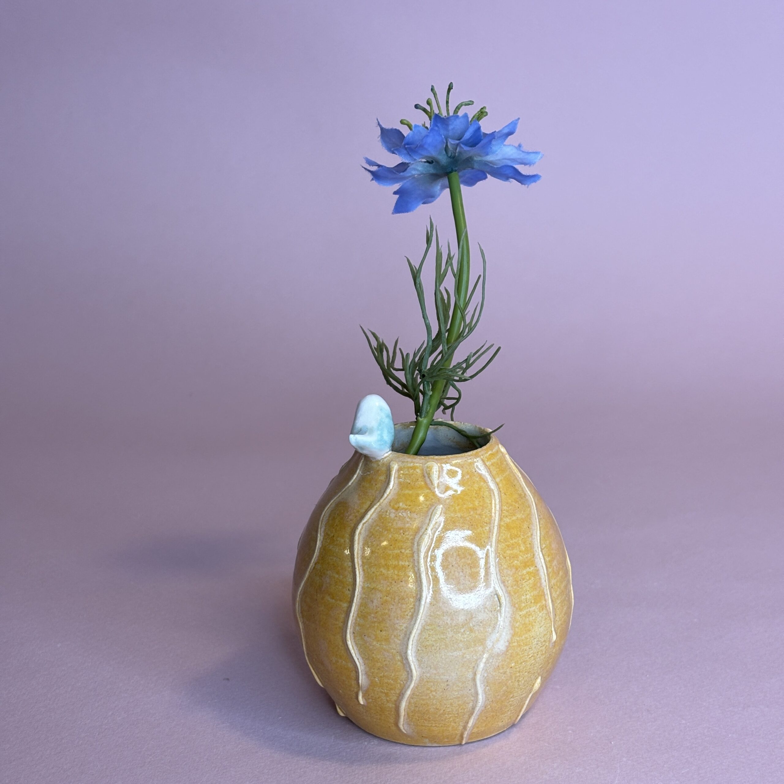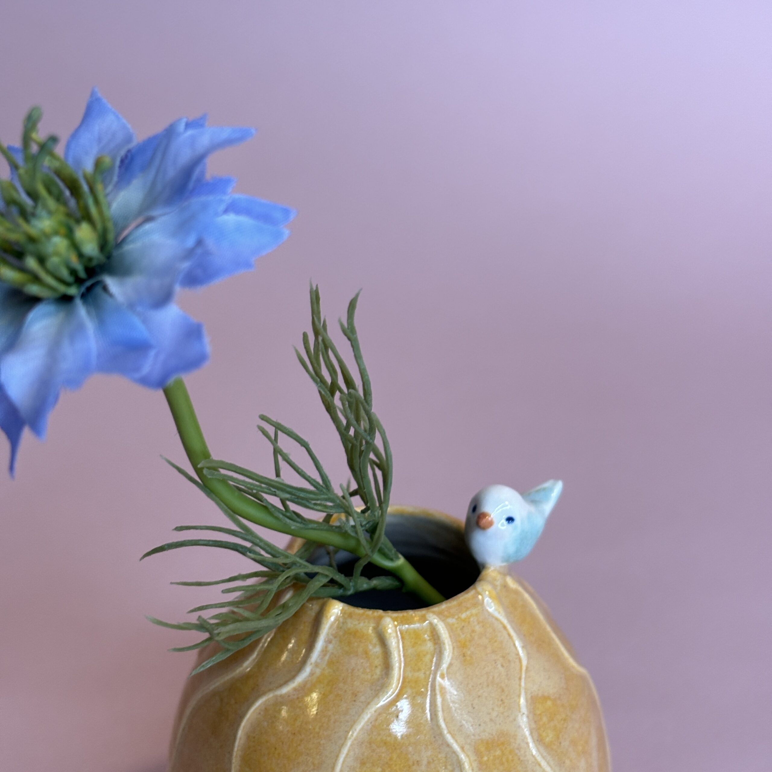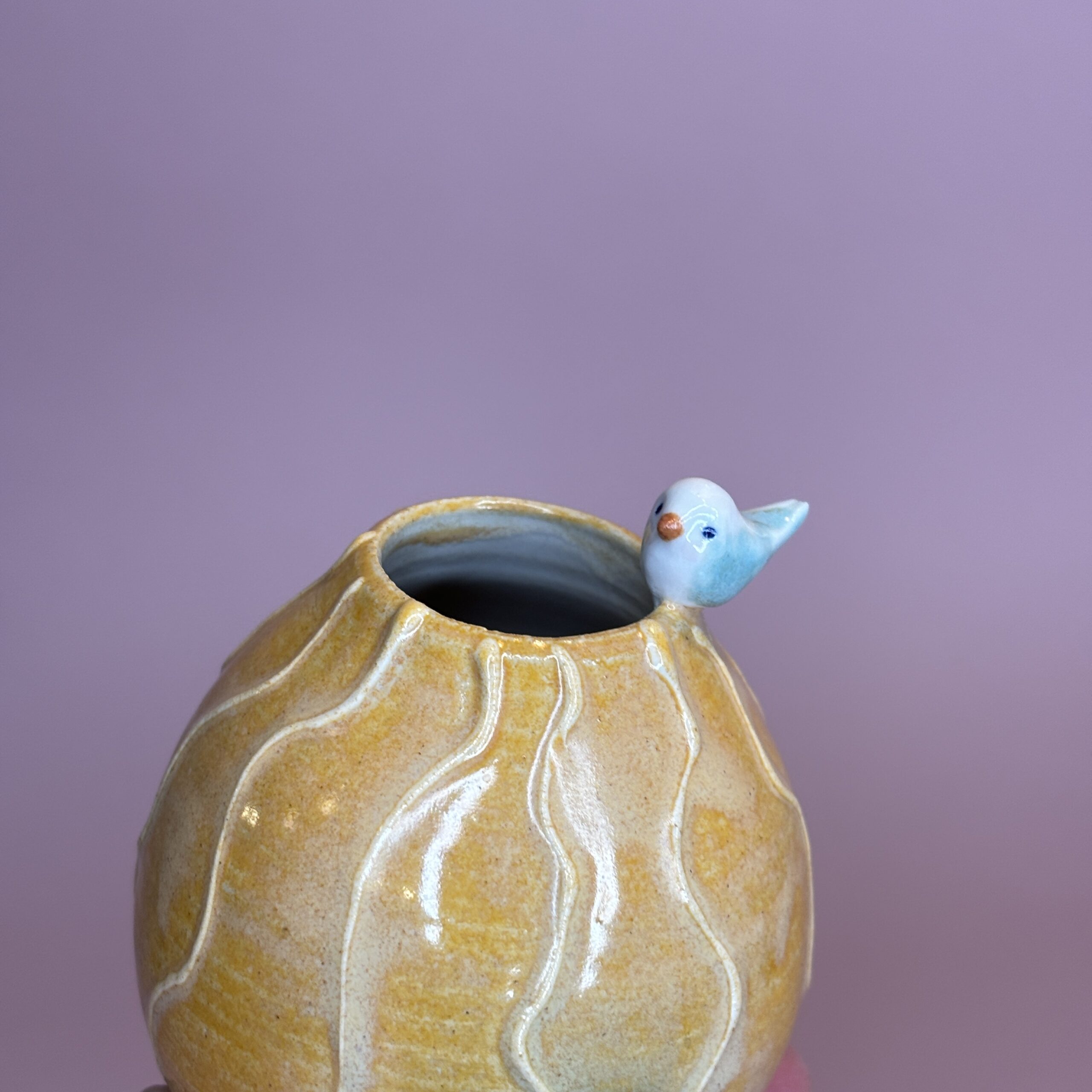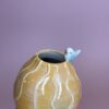Vasen er håndlavet i stentøjsler med porcelænsfugl – og dekoreret med fine glasurer.