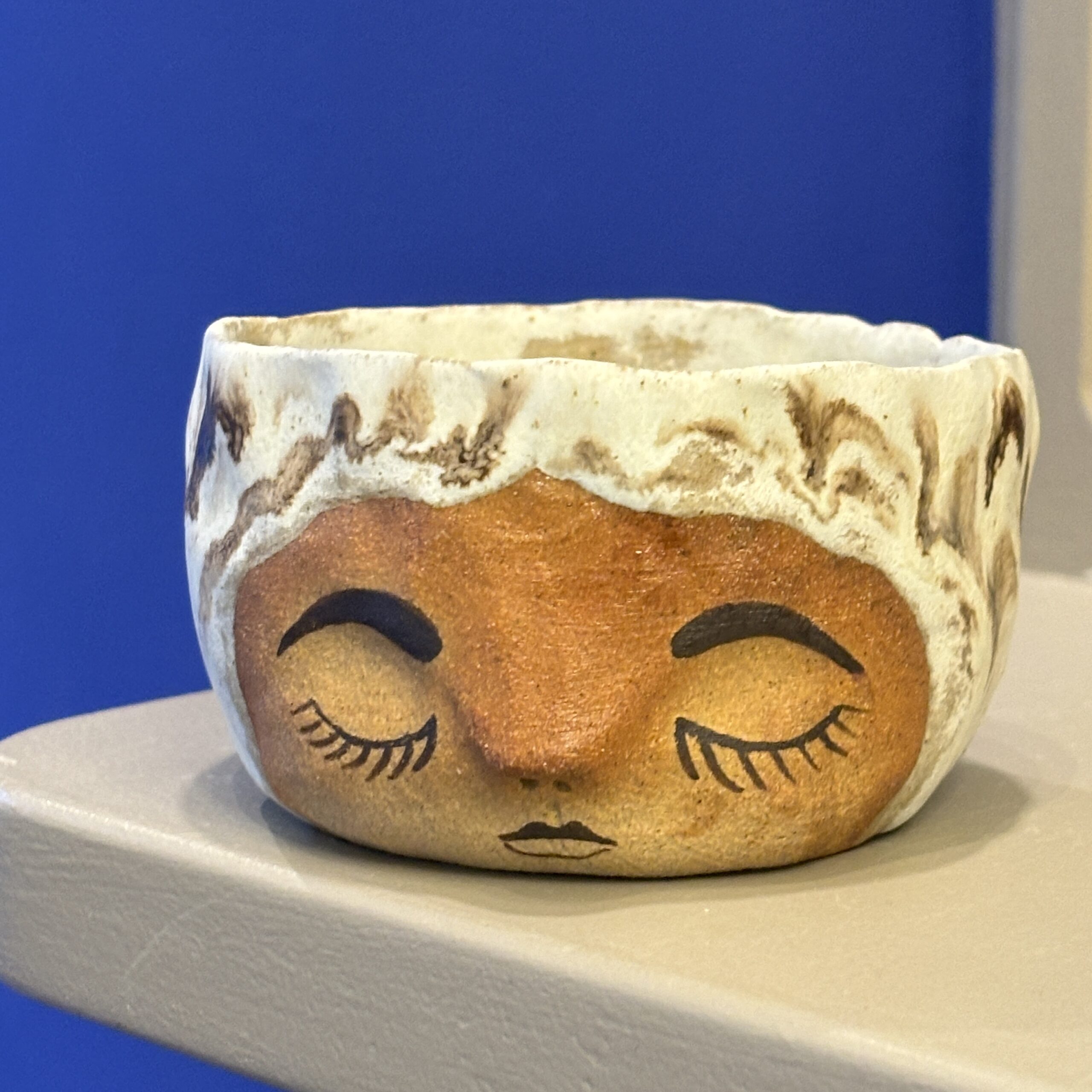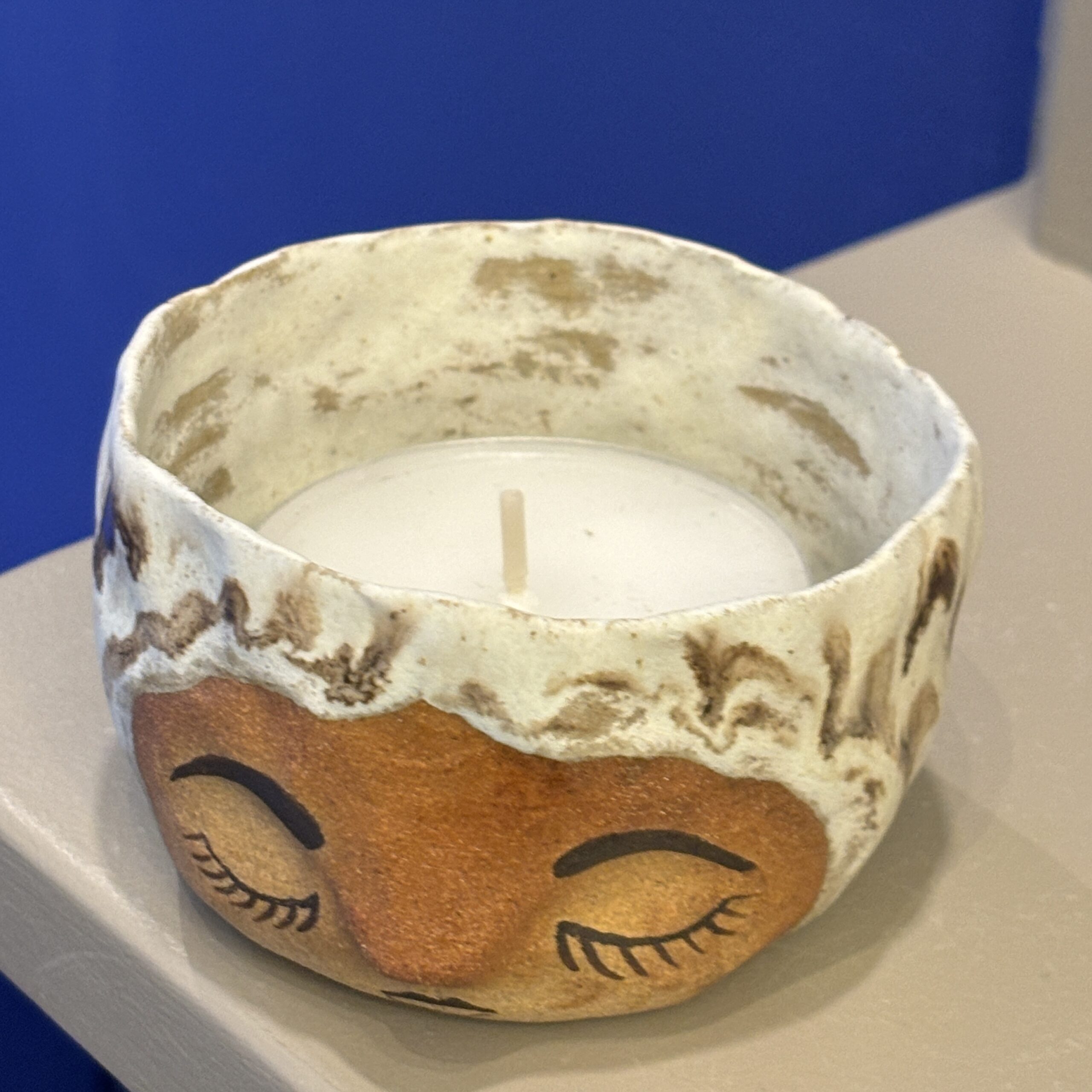 Keramik fyrfadsstage med udtryksfuldt ansigt – kan også anvendes som saltkar, til smykker eller andet nips.