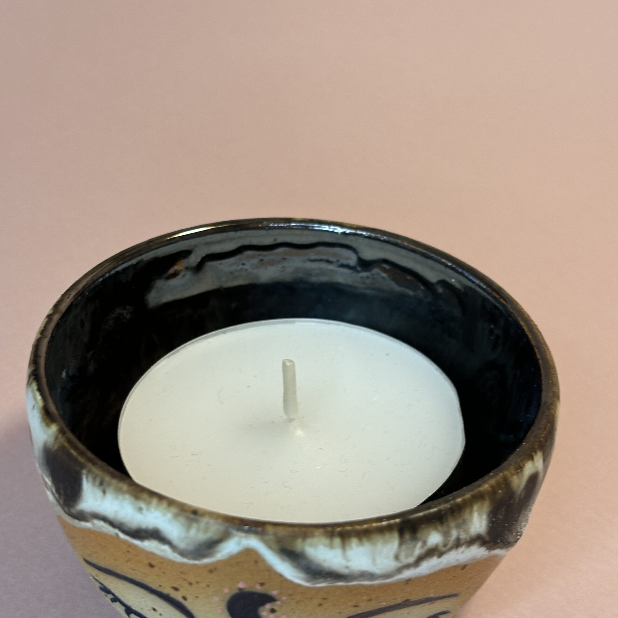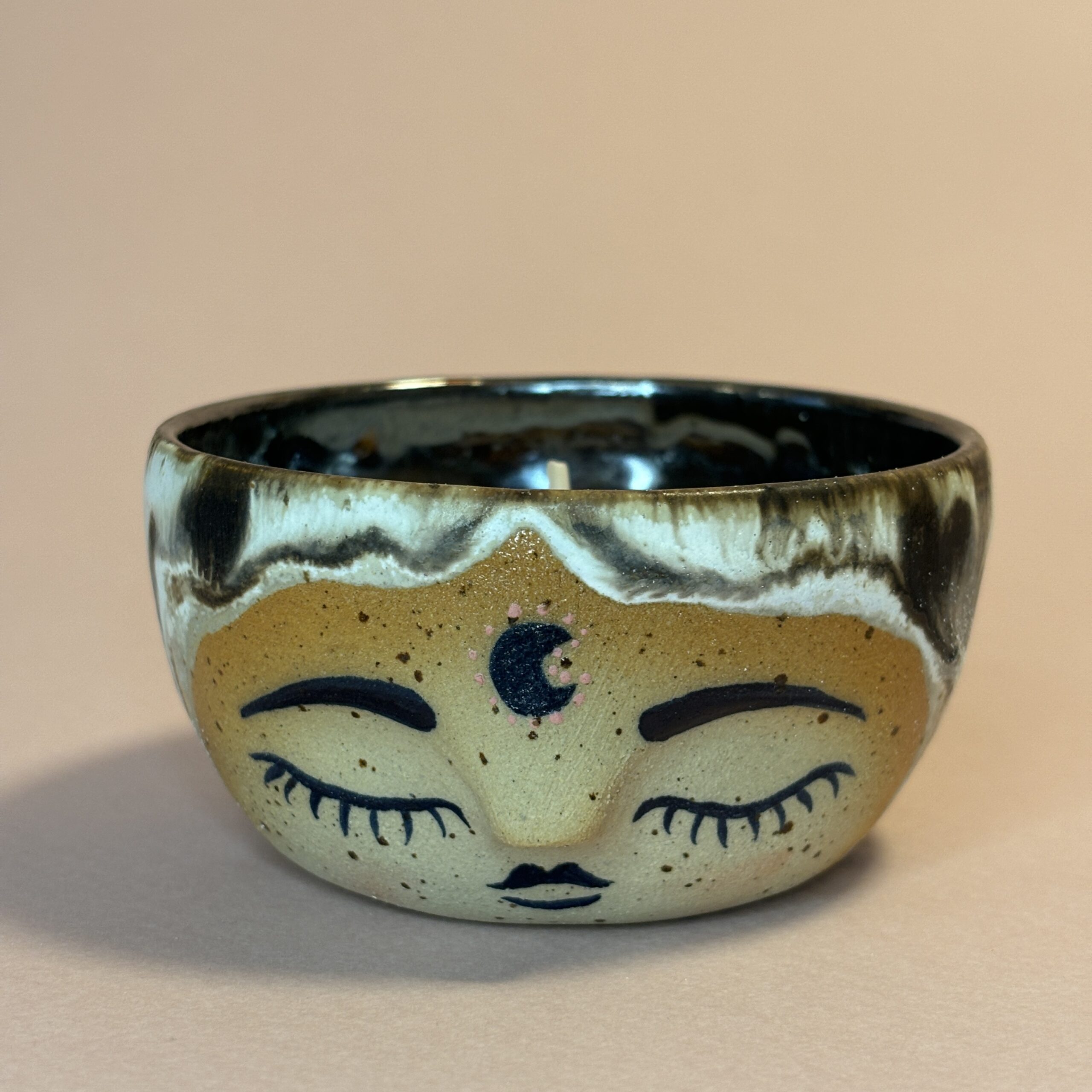 Keramik fyrfadsskål med udtryksfuldt ansigt – kan også anvendes som saltkar, til smykker eller andet nips.