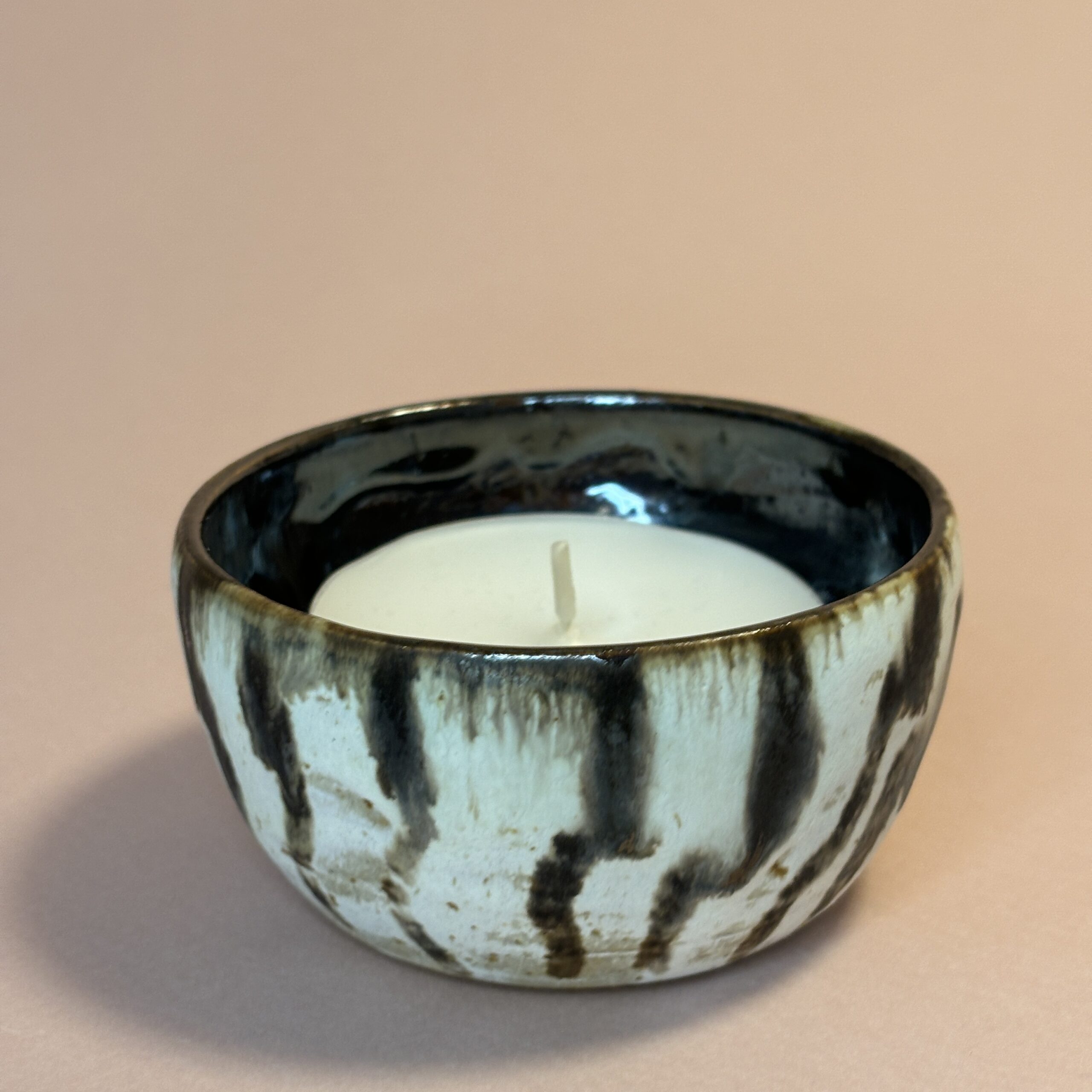 Fyrfadsstagen er håndlavet i stentøjsler og dekoreret med glasur. Der er plads til et stort fyrfadslys.
