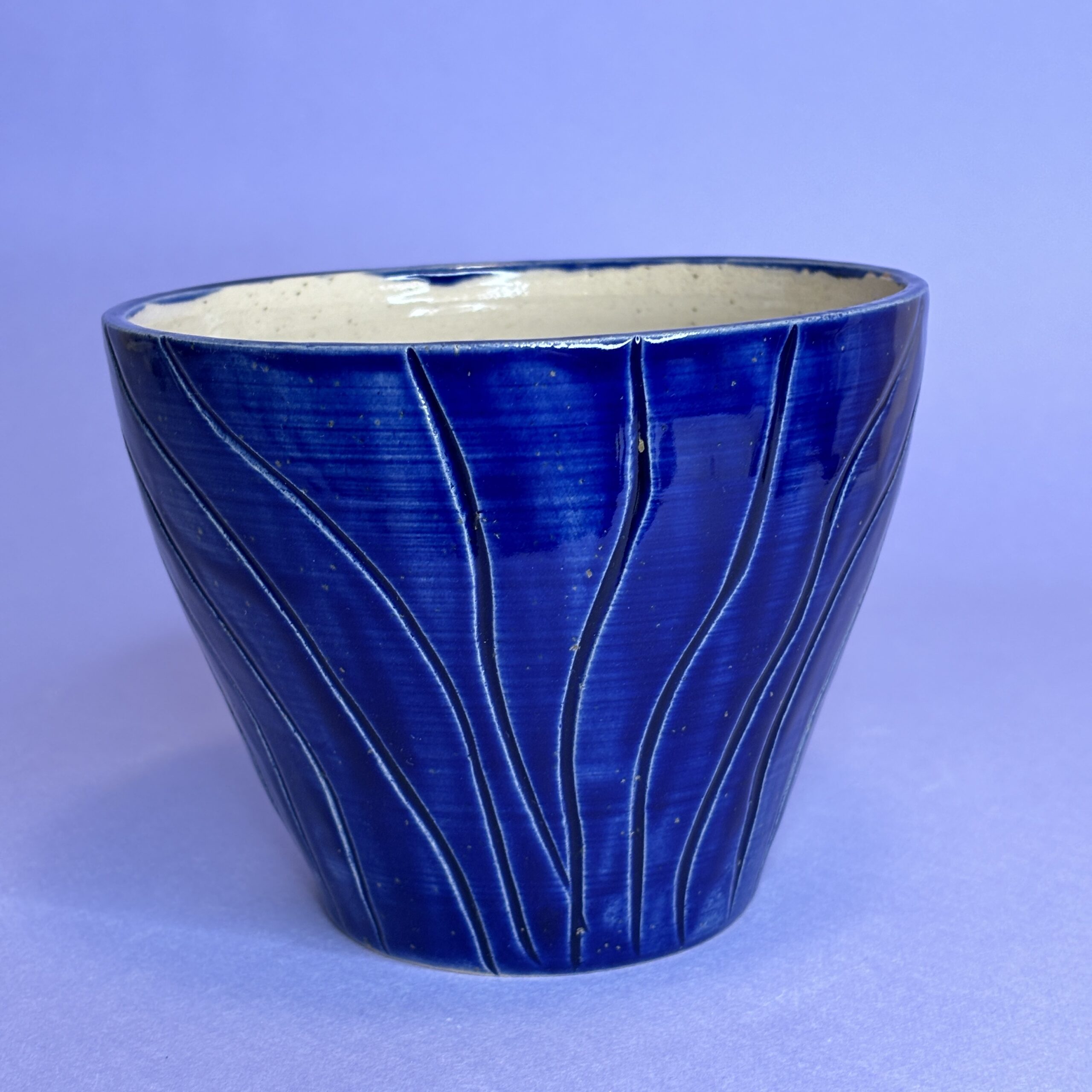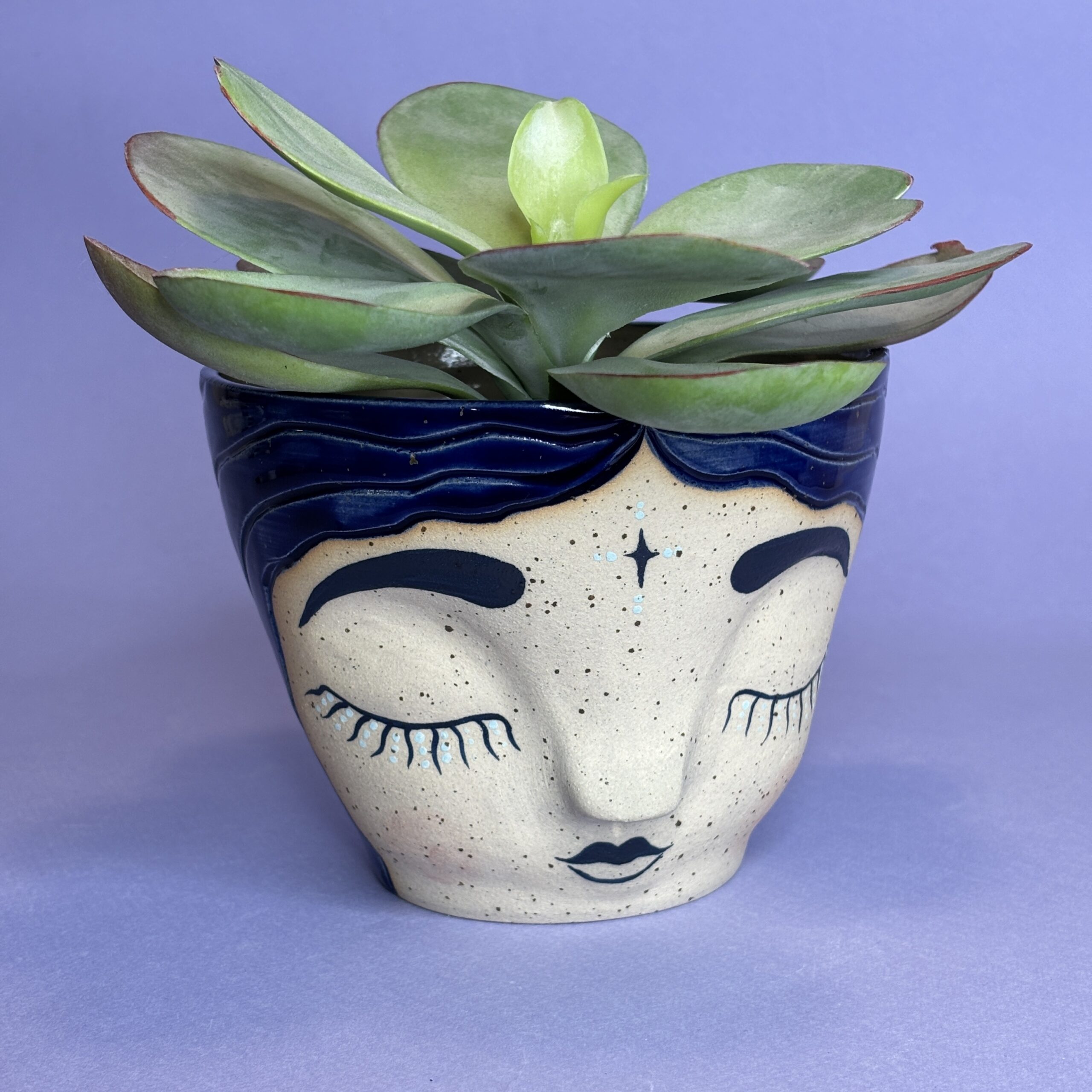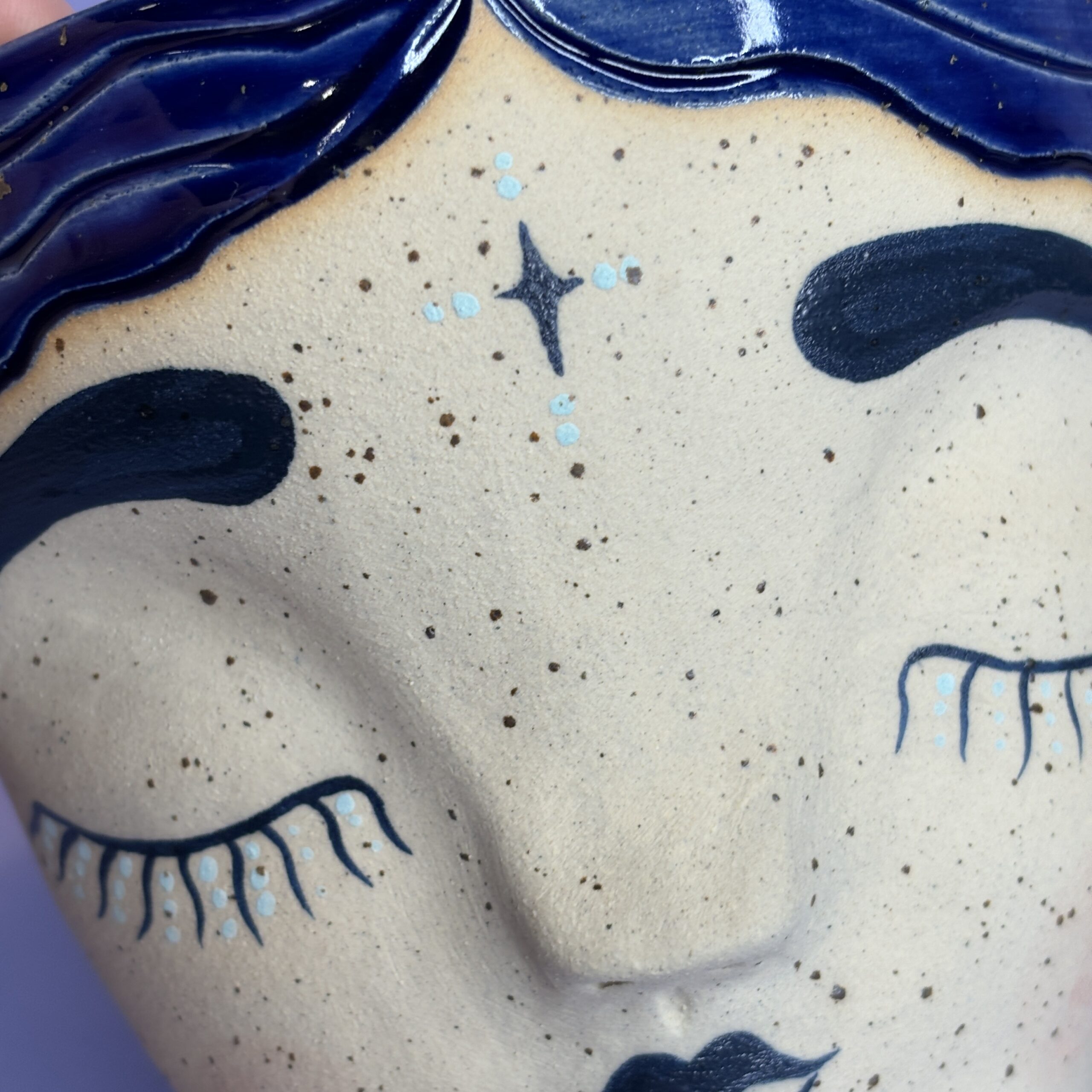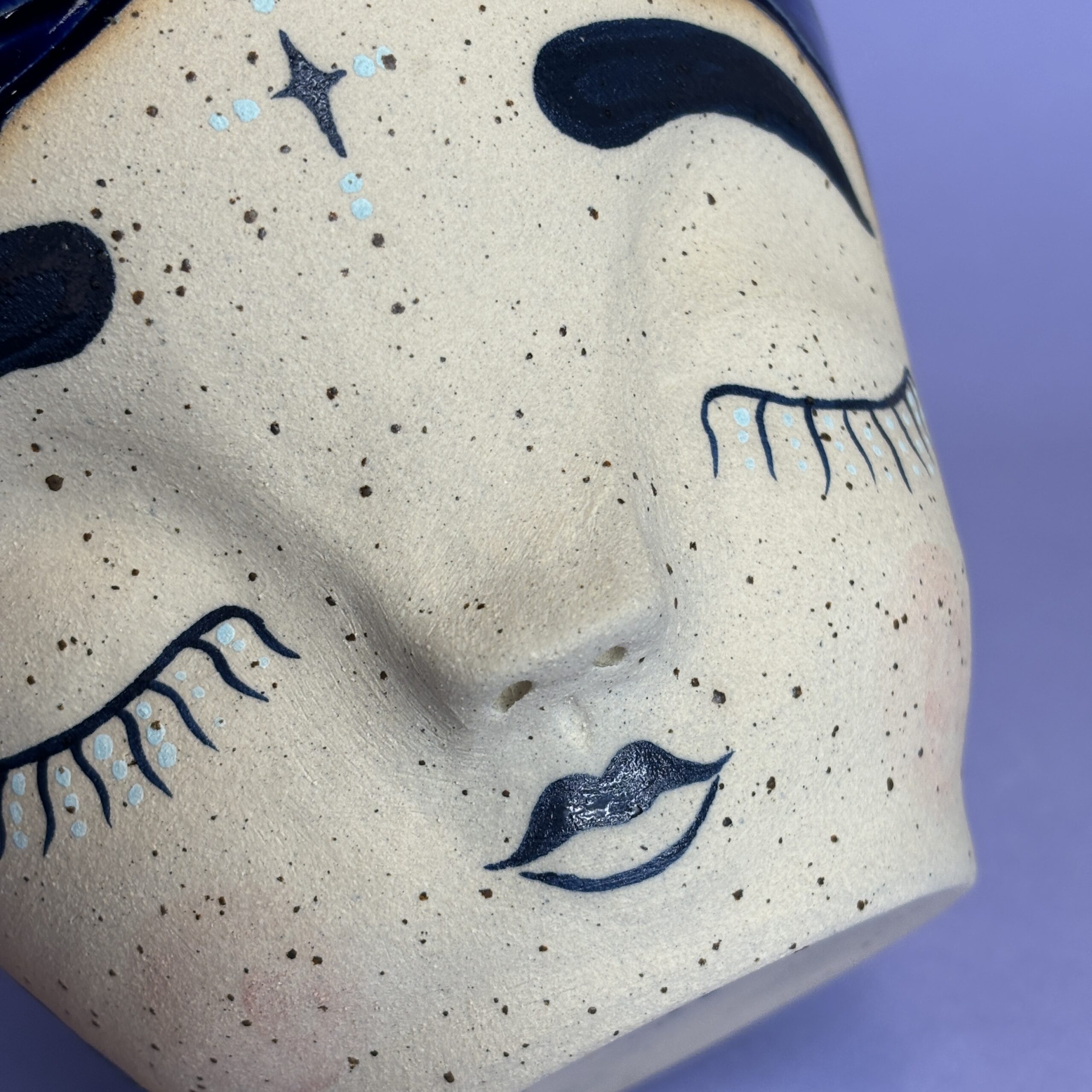 Hånddrejet ansigtspotte i stentøjsler og dekoreret med glasur.