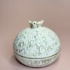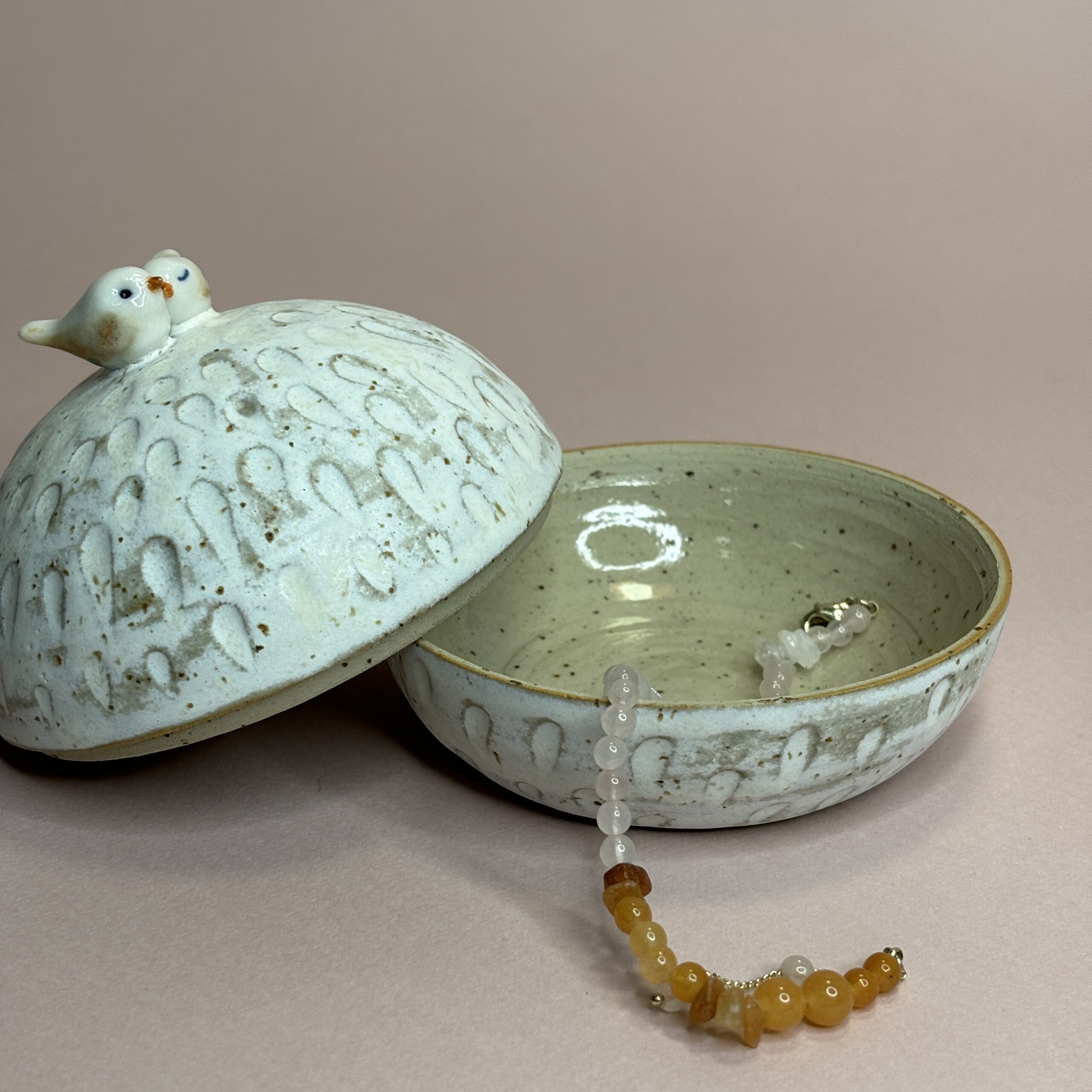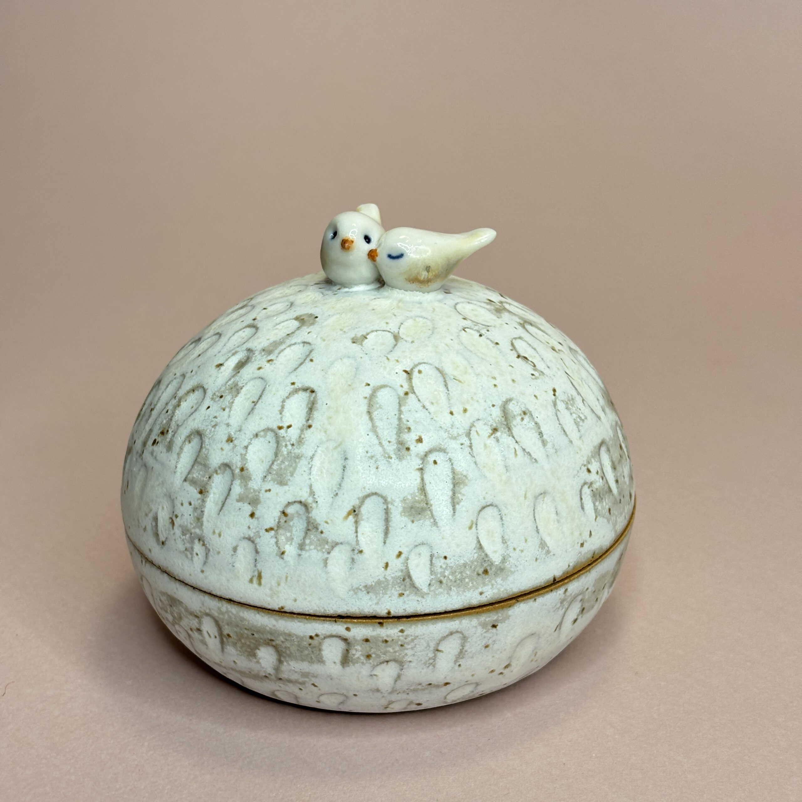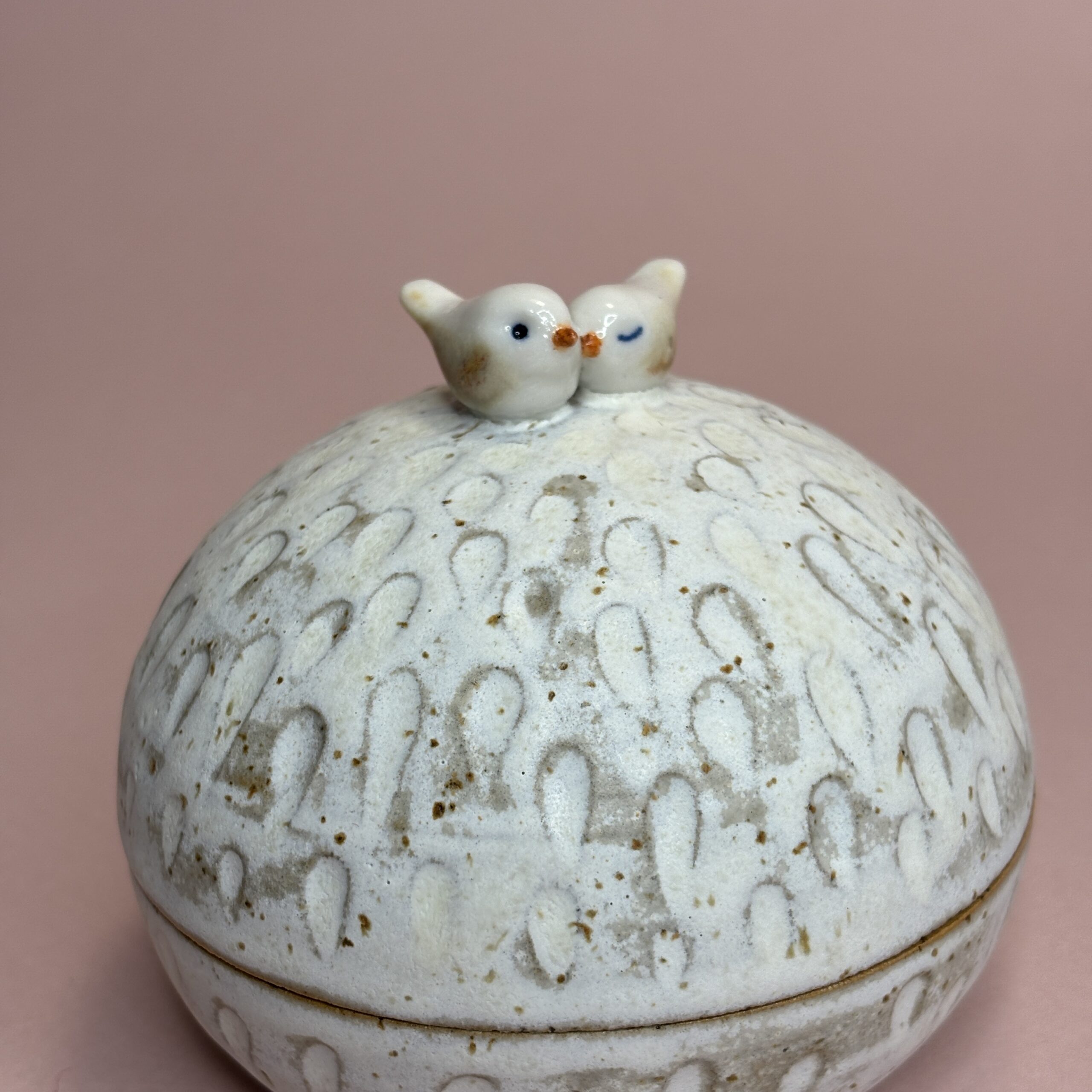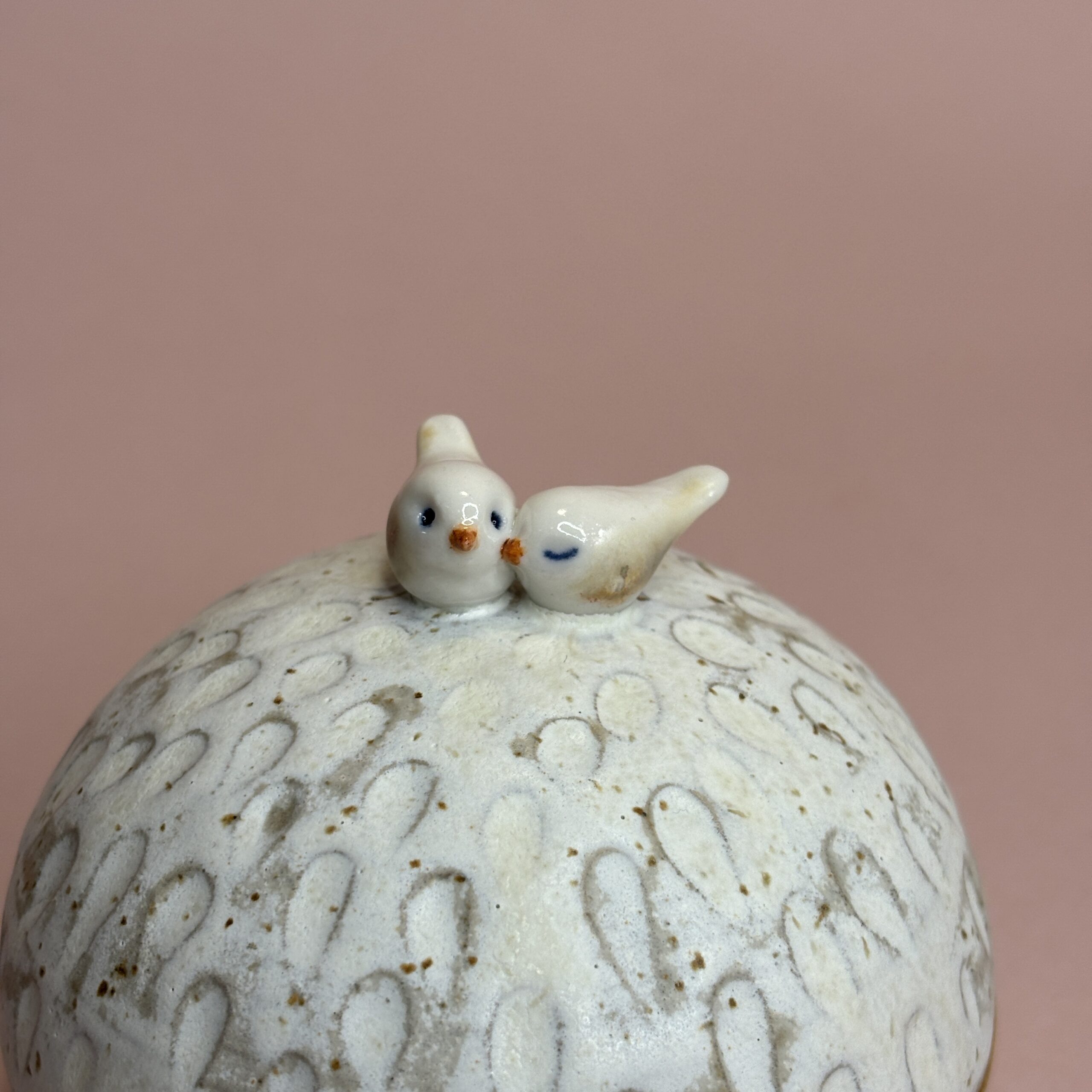 Fin lågkrukke med to fugle, der nyder en kærlig stund. Brug den til smykker, krystaller et fyrfadslys eller andet nips.