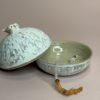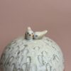 Hånddrejet lågkrukke i stentøjsler med porcelænsfugle.