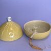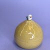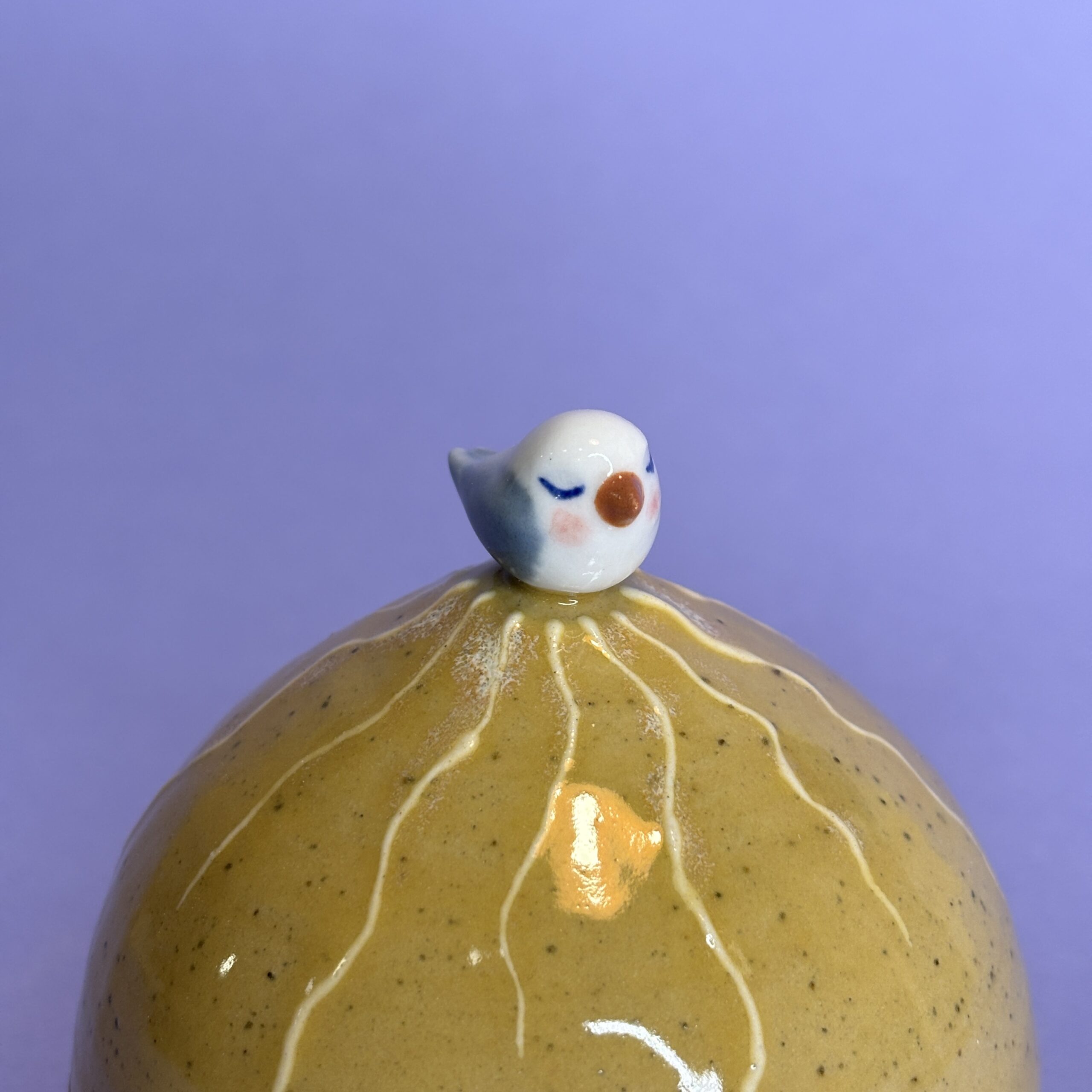 Hånddrejet lågkrukke i stentøjsler med porcelænsfugl.