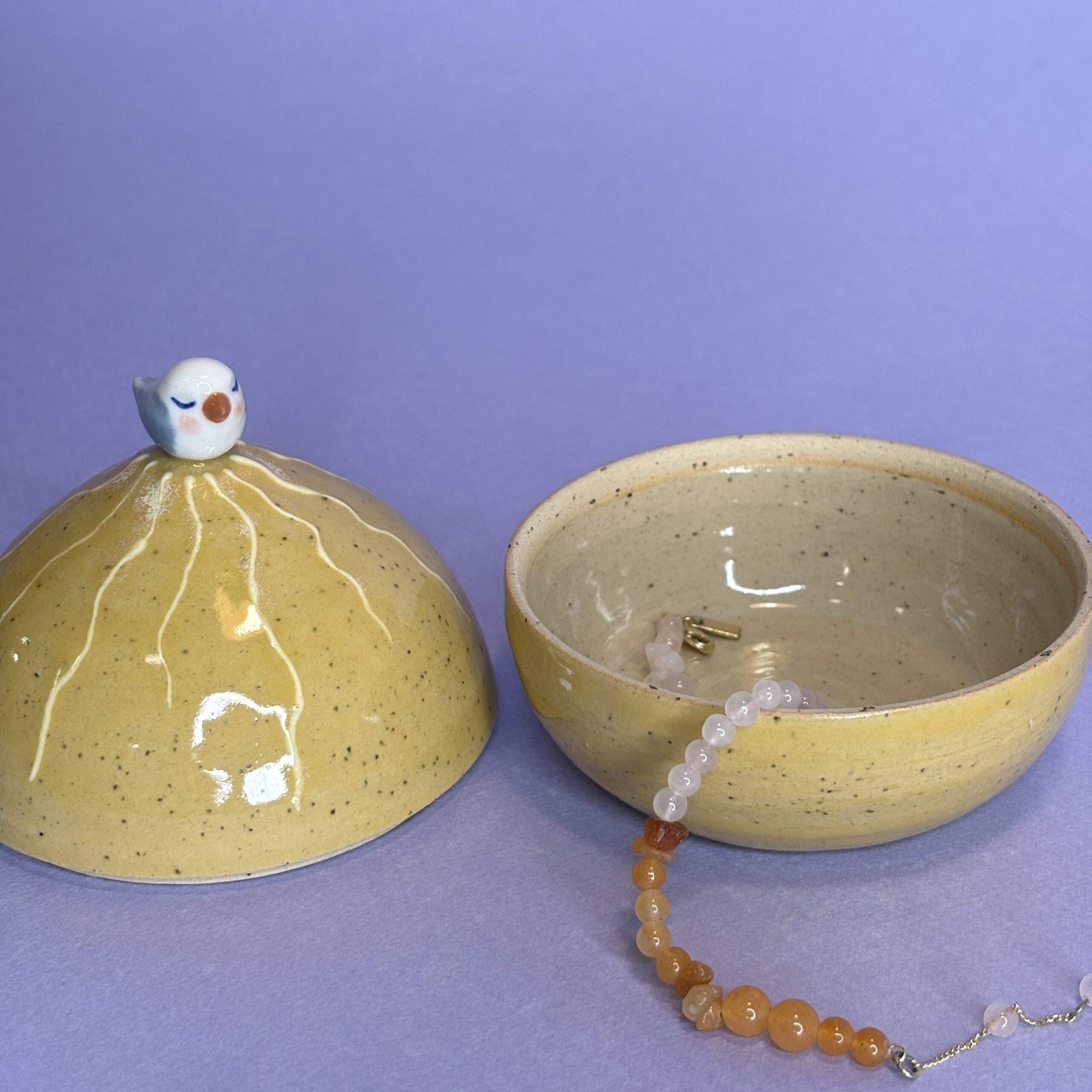 Fin lågkrukke med fugl på toppen. Brug den til smykker, krystaller et fyrfadslys eller andet nips.