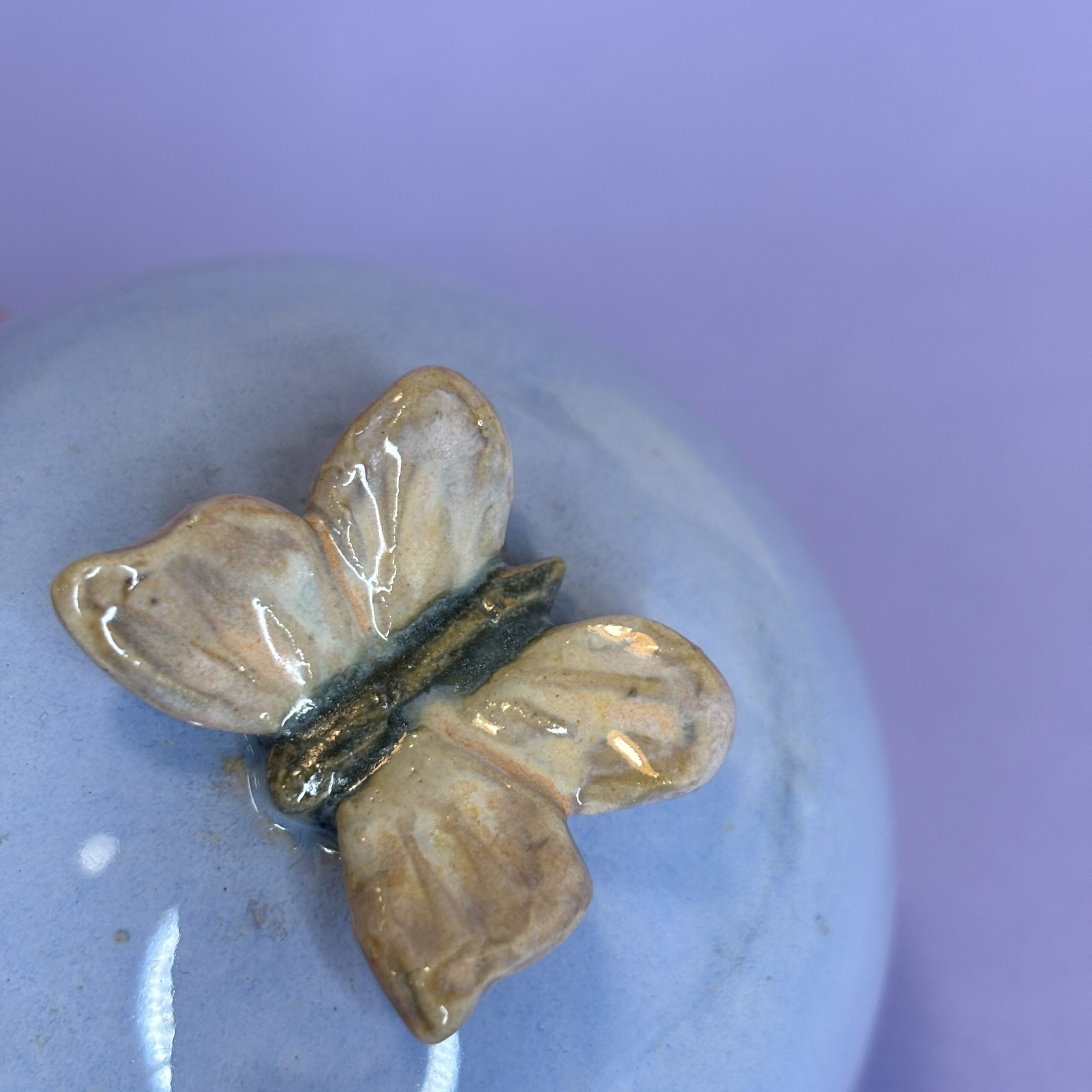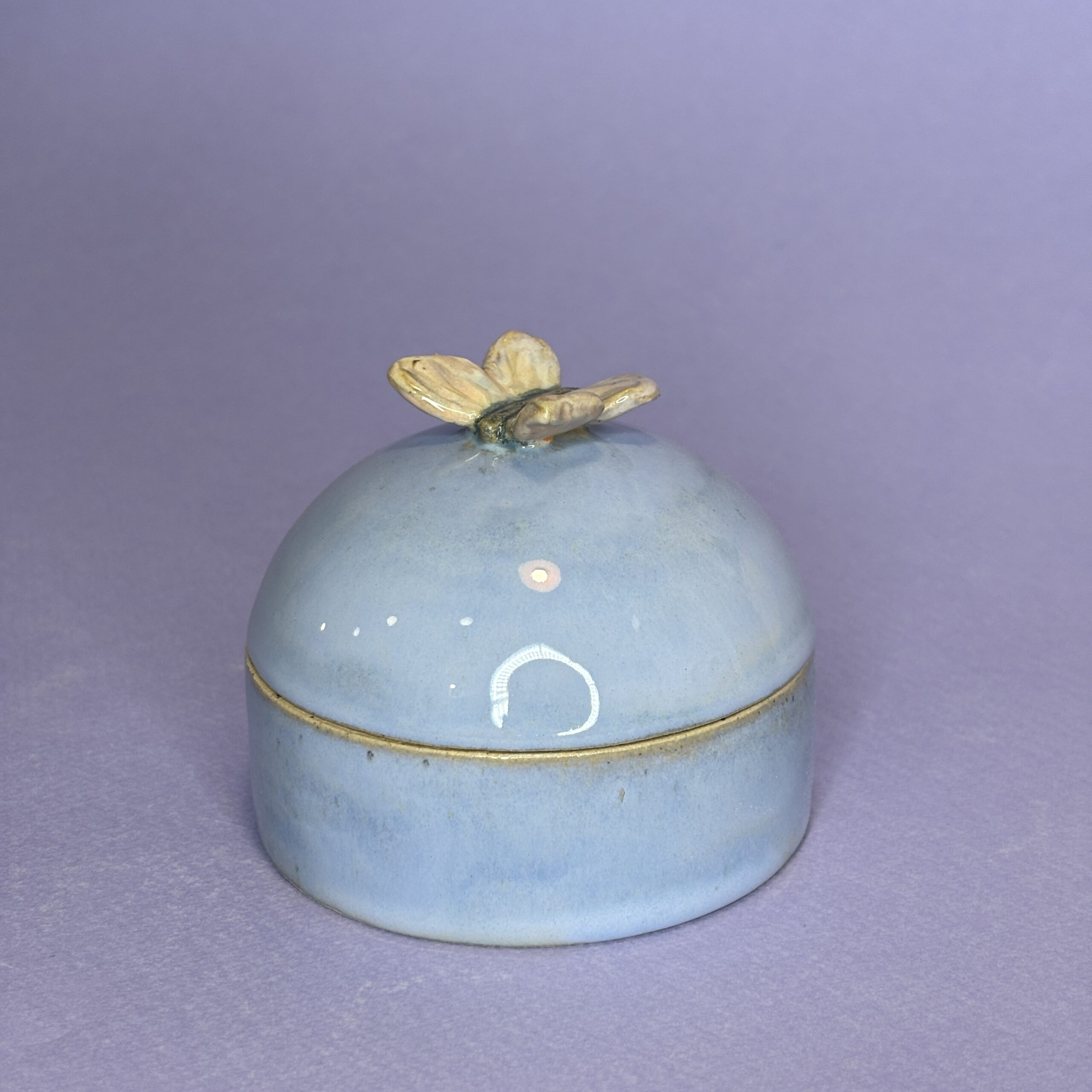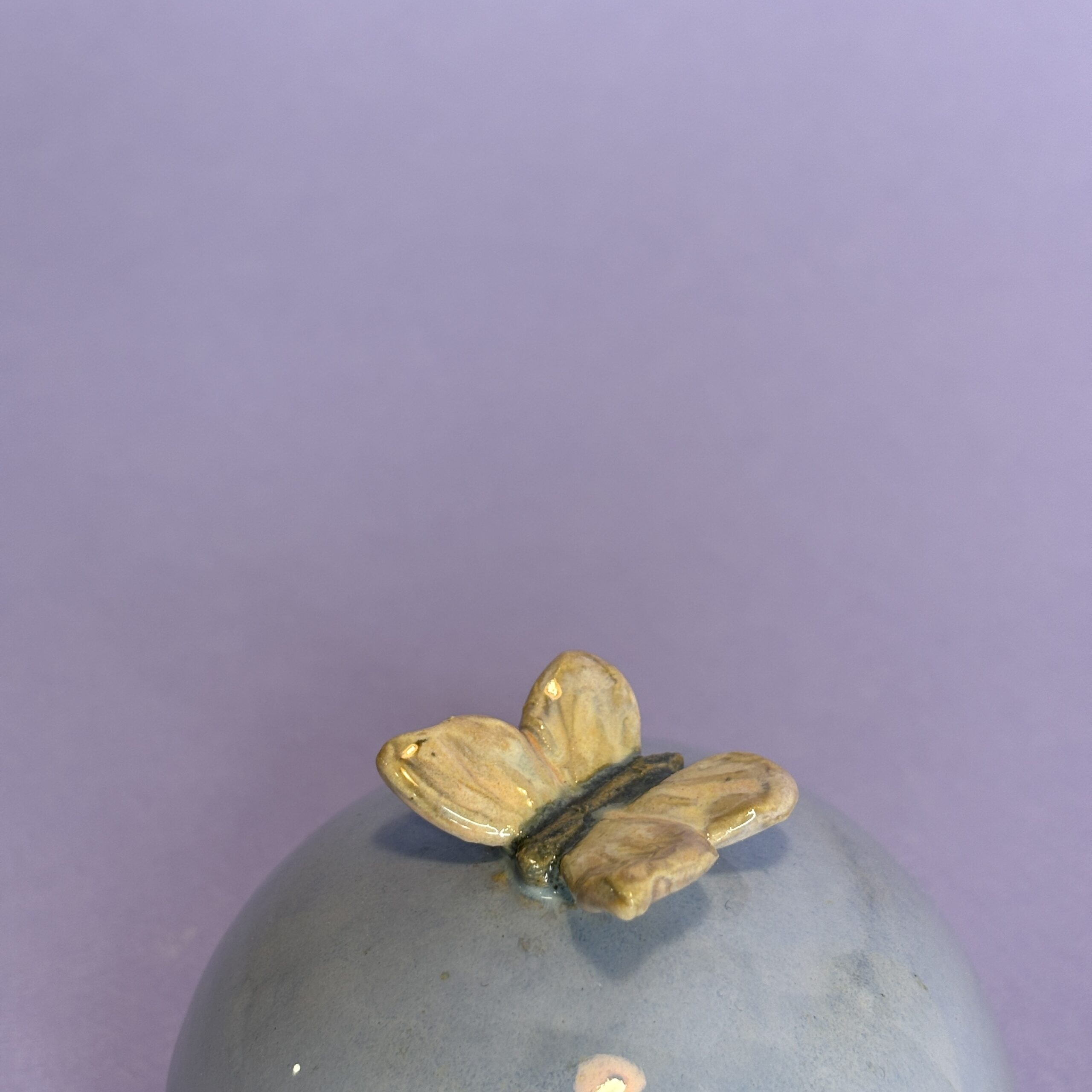 Hånddrejet lågkrukke i stentøjsler og porcelænssommerfugl på toppen.