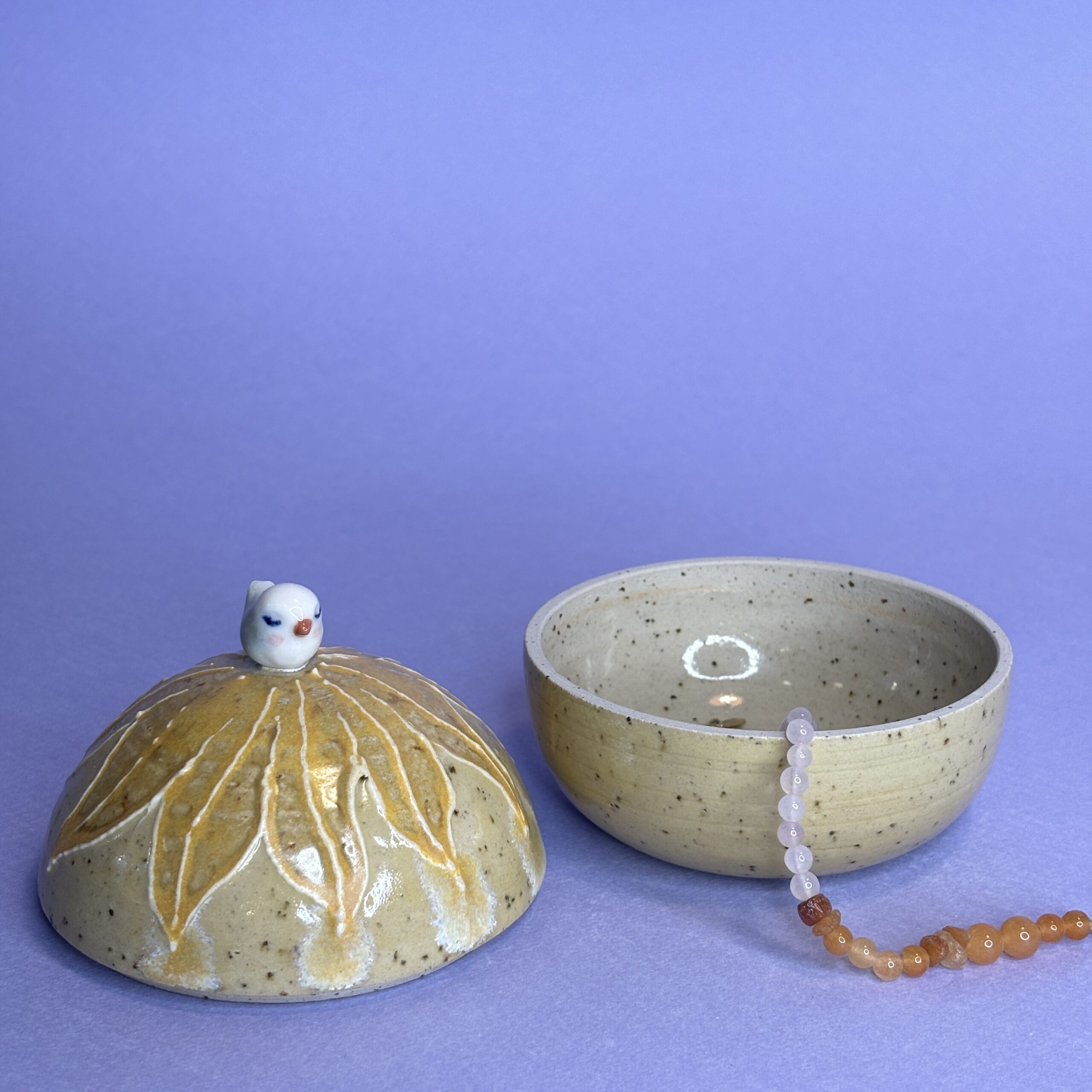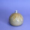 Hånddrejet lågkrukke i stentøjsler med porcelænsfugl.