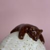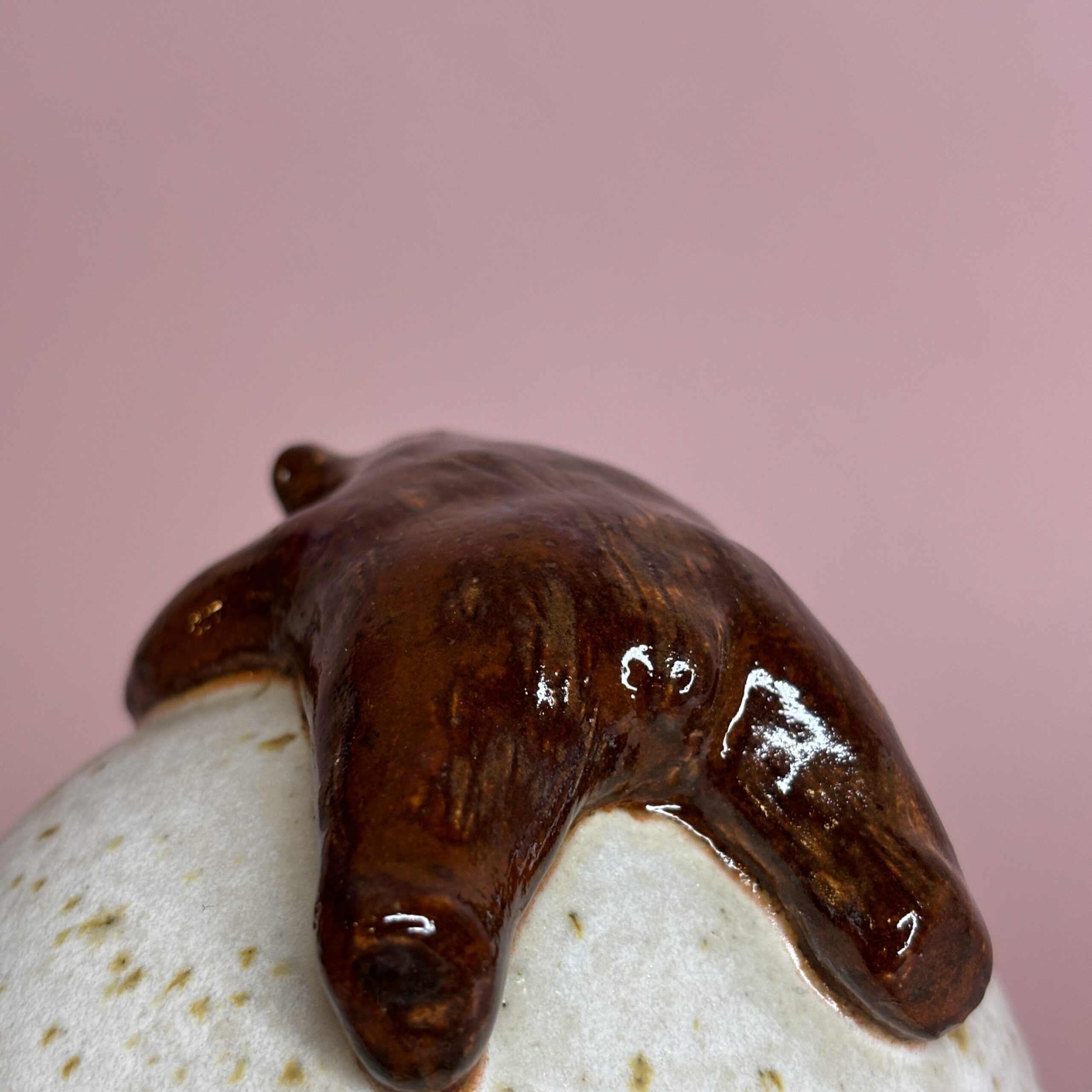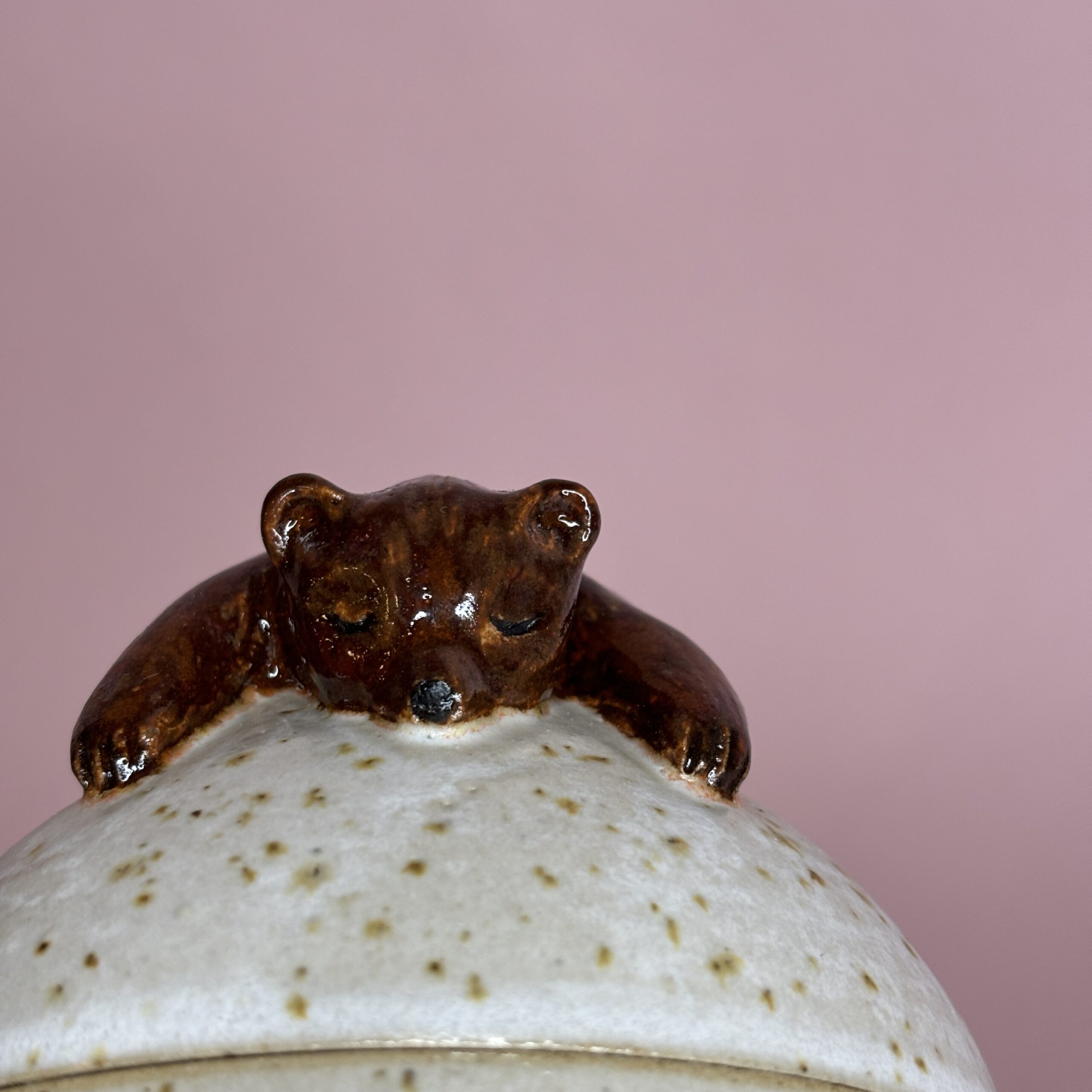 Fin lågkrukke med sovende bjørn på toppen. Brug den til smykker, krystaller et fyrfadslys eller andet nips.