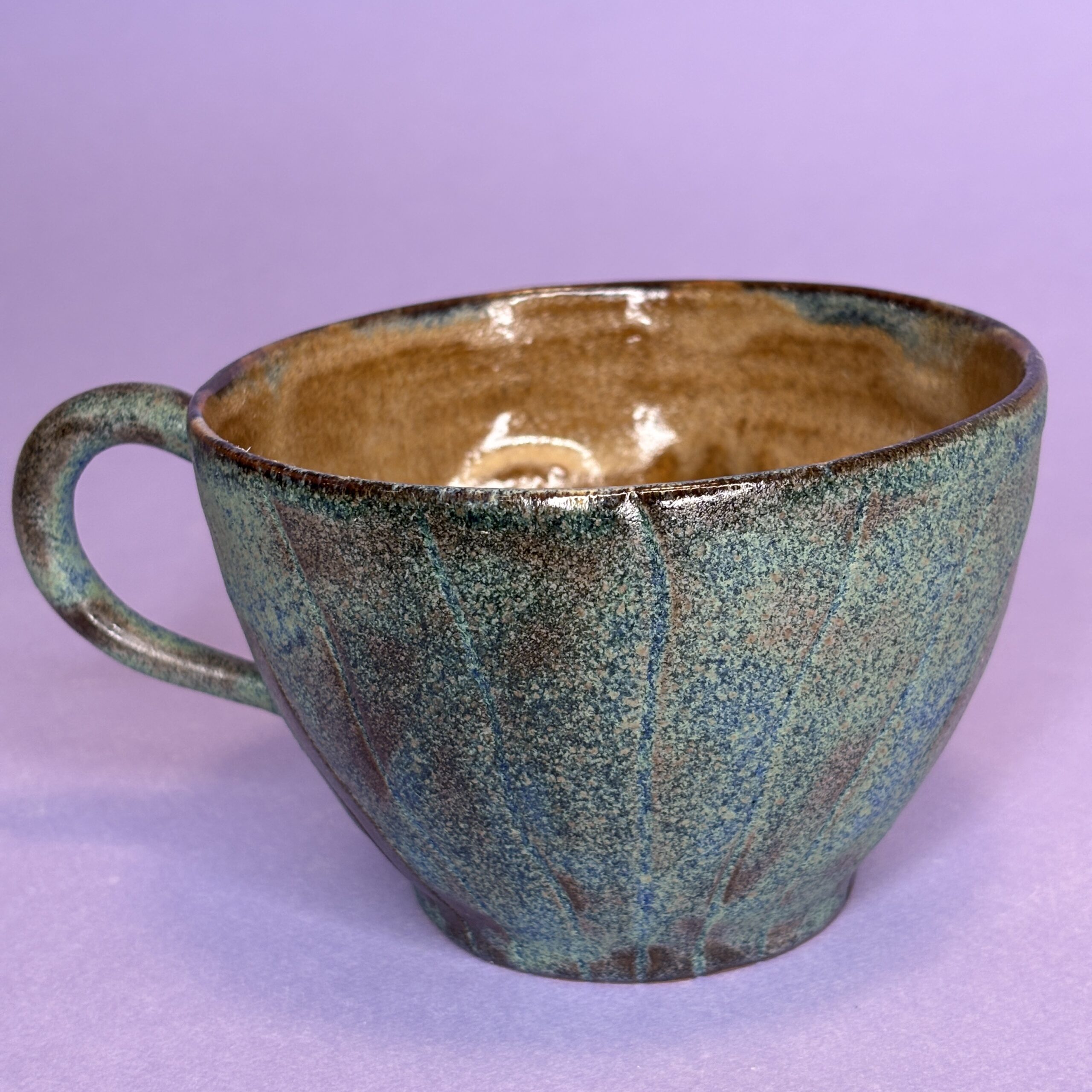 Koppen er håndlavet i stentøjsler og dekoreret med glasur.