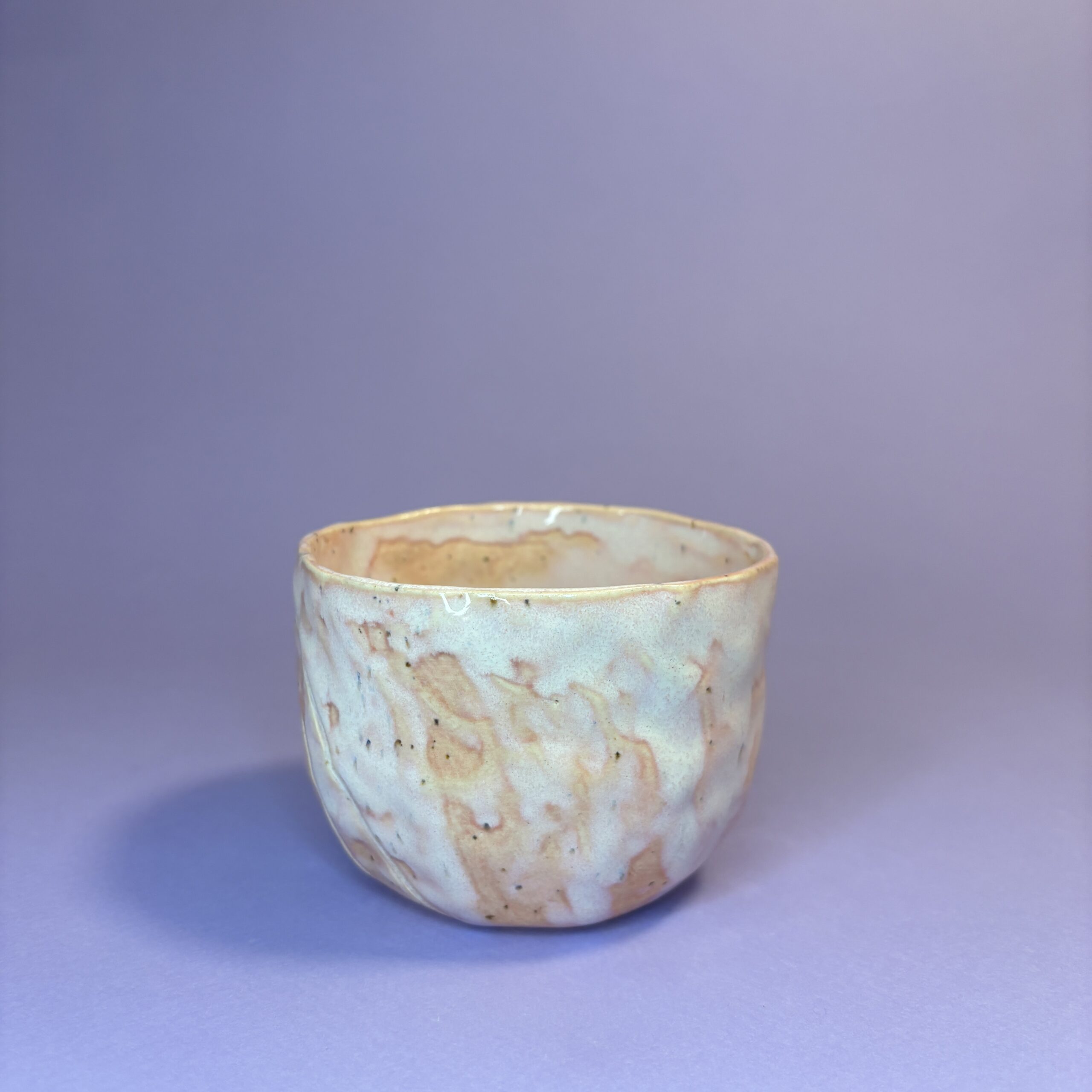 Koppen er håndlavet i stentøjsler og dekoreret med glasur. Kan også anvendes som potte til en lille plante.