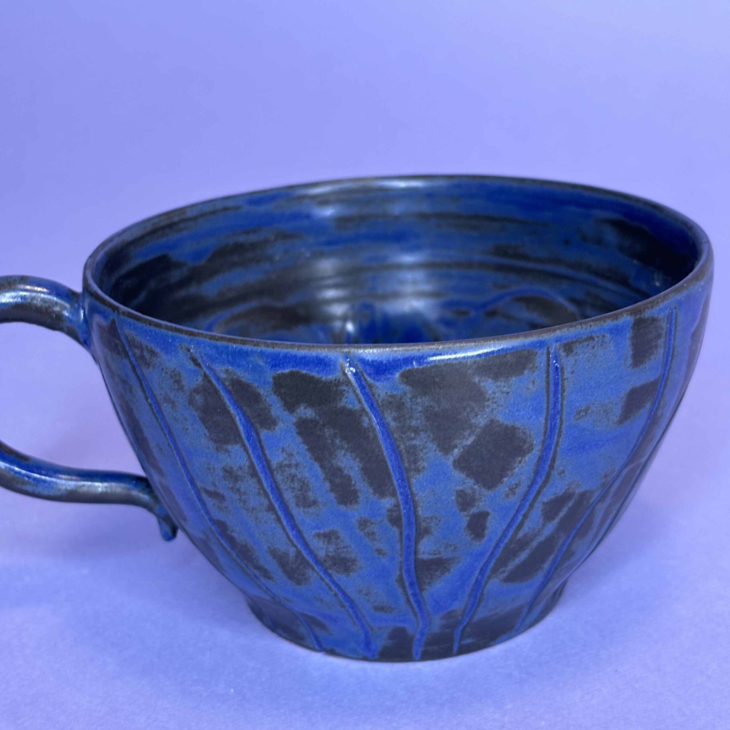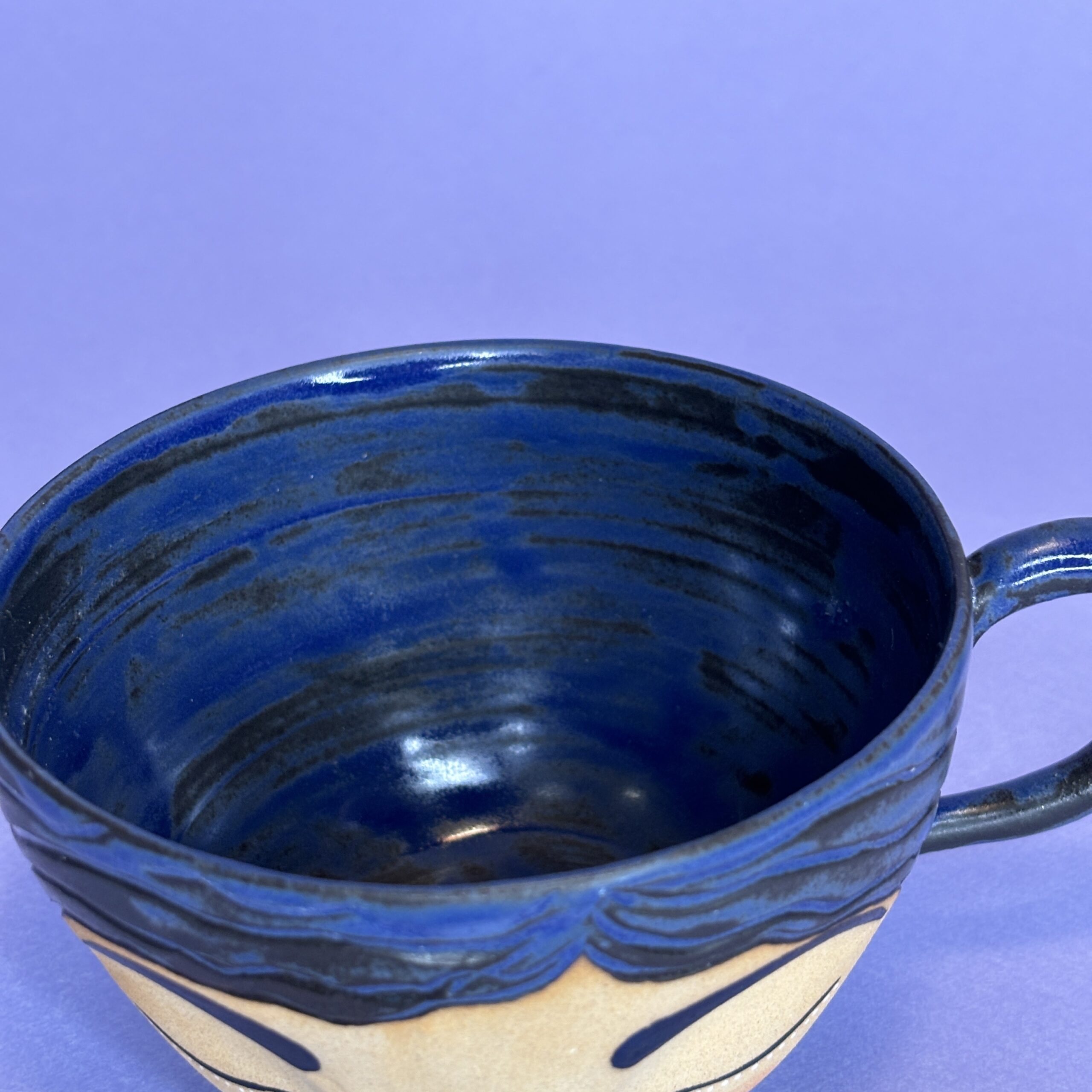 Koppen er håndlavet i stentøjsler og dekoreret med glasur.
