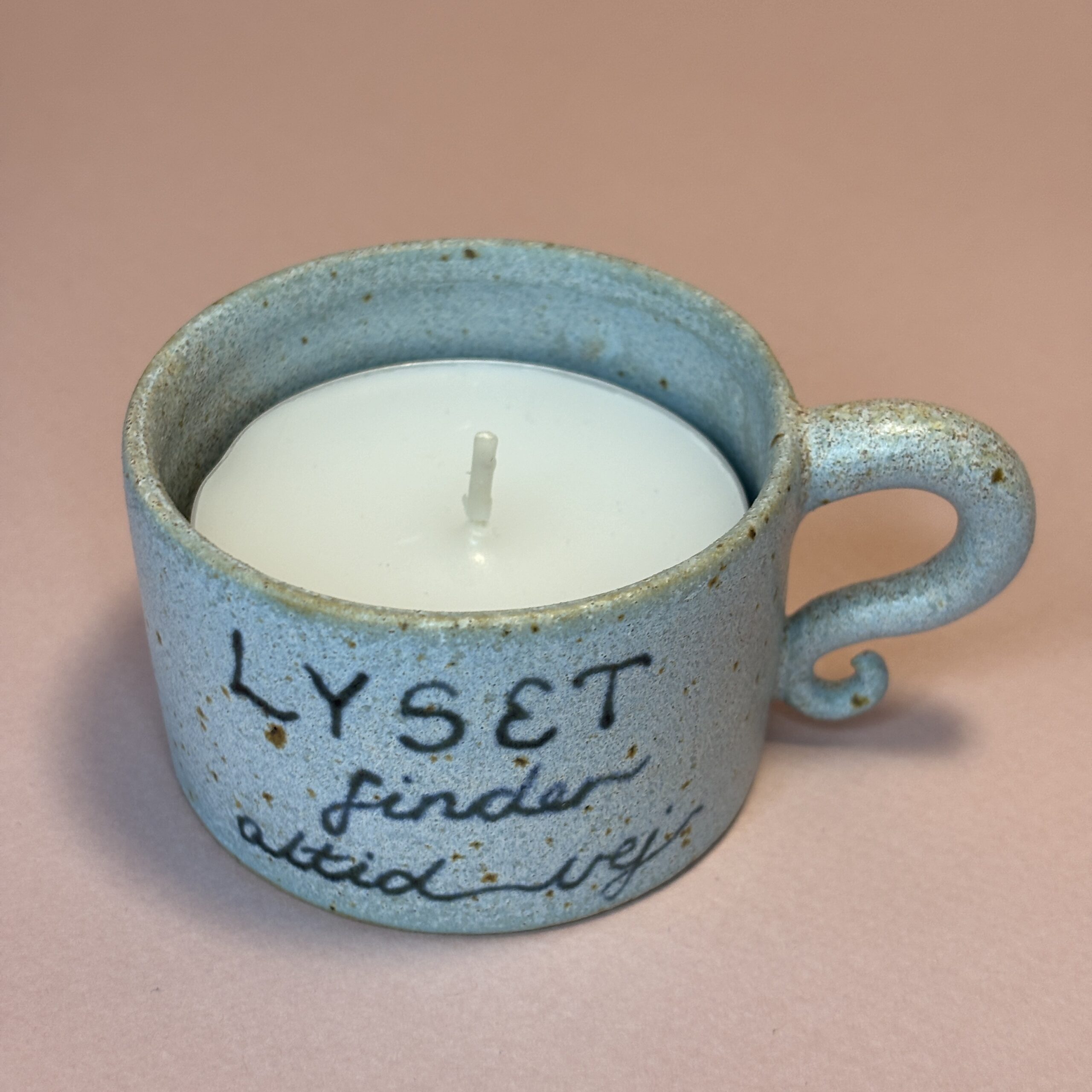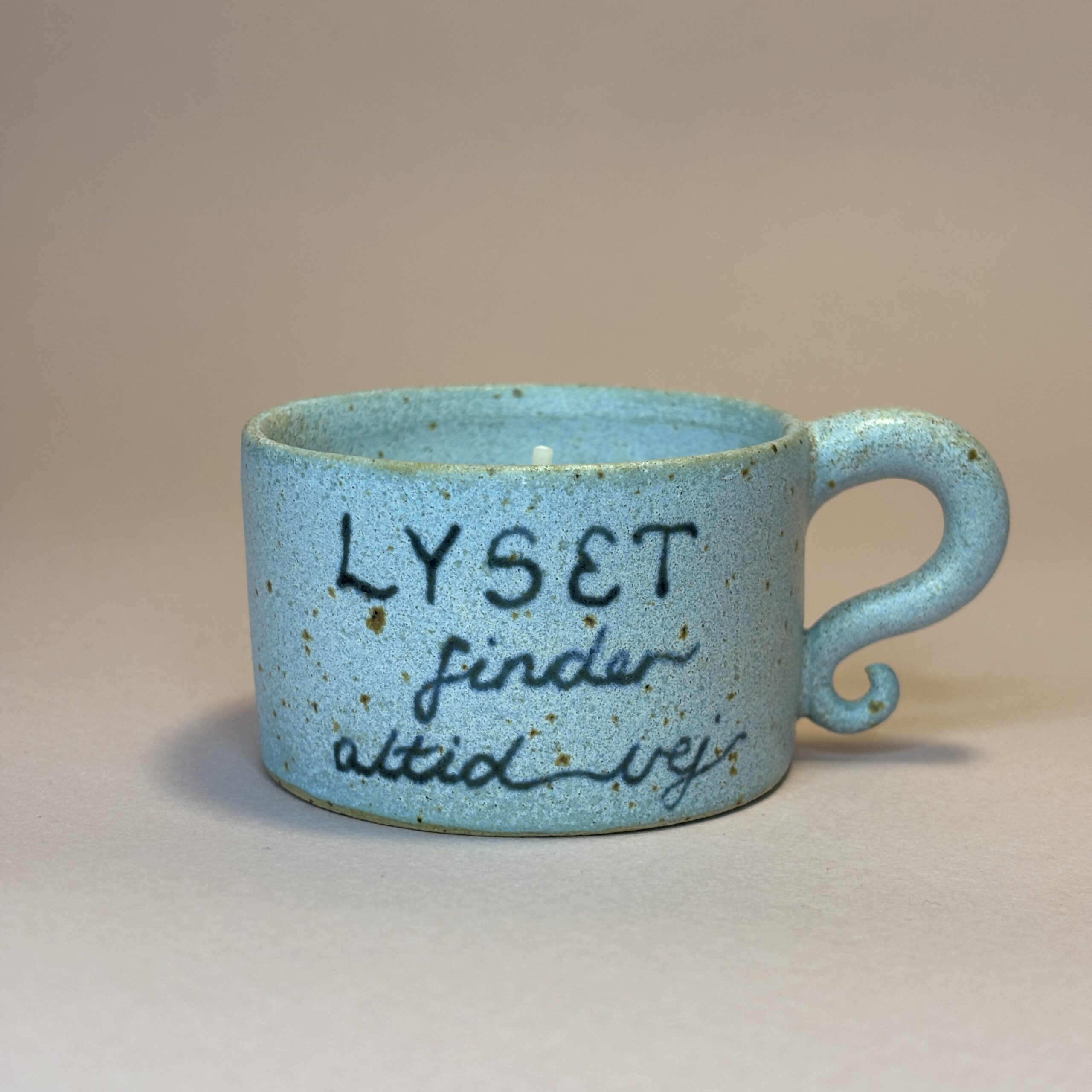Drejet fyrfadsskål med håndskrevet budskab. Rummer et stort fyrfadslys.