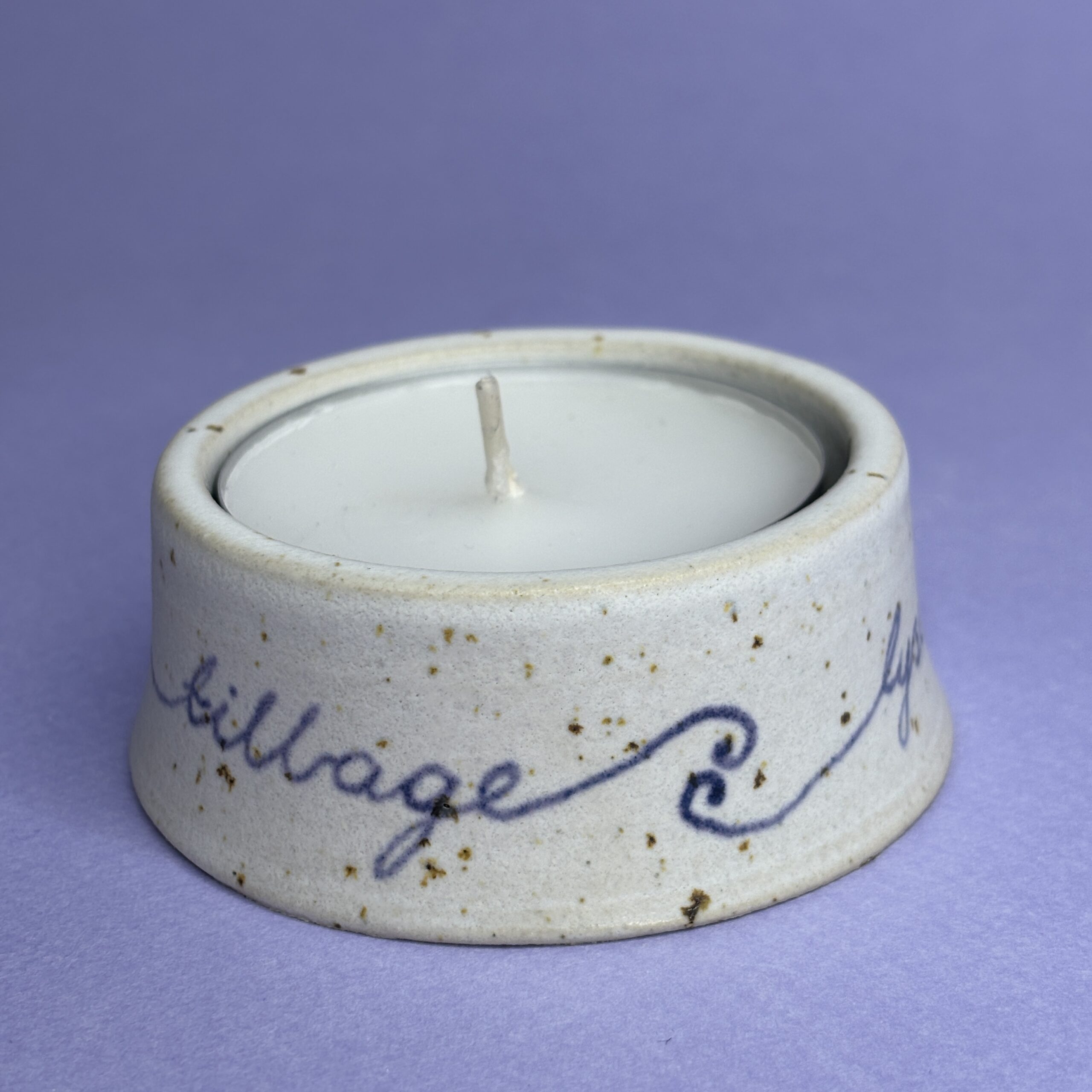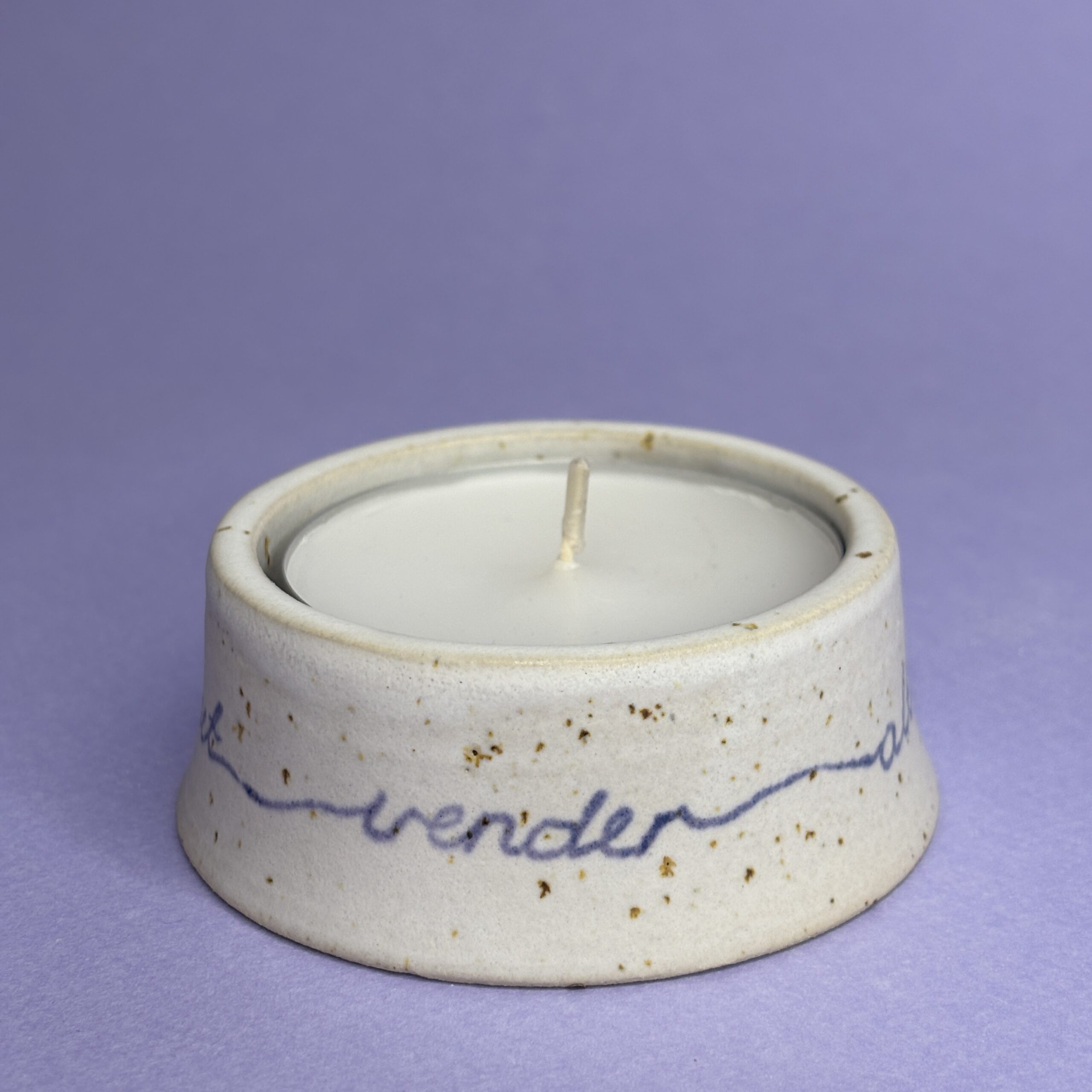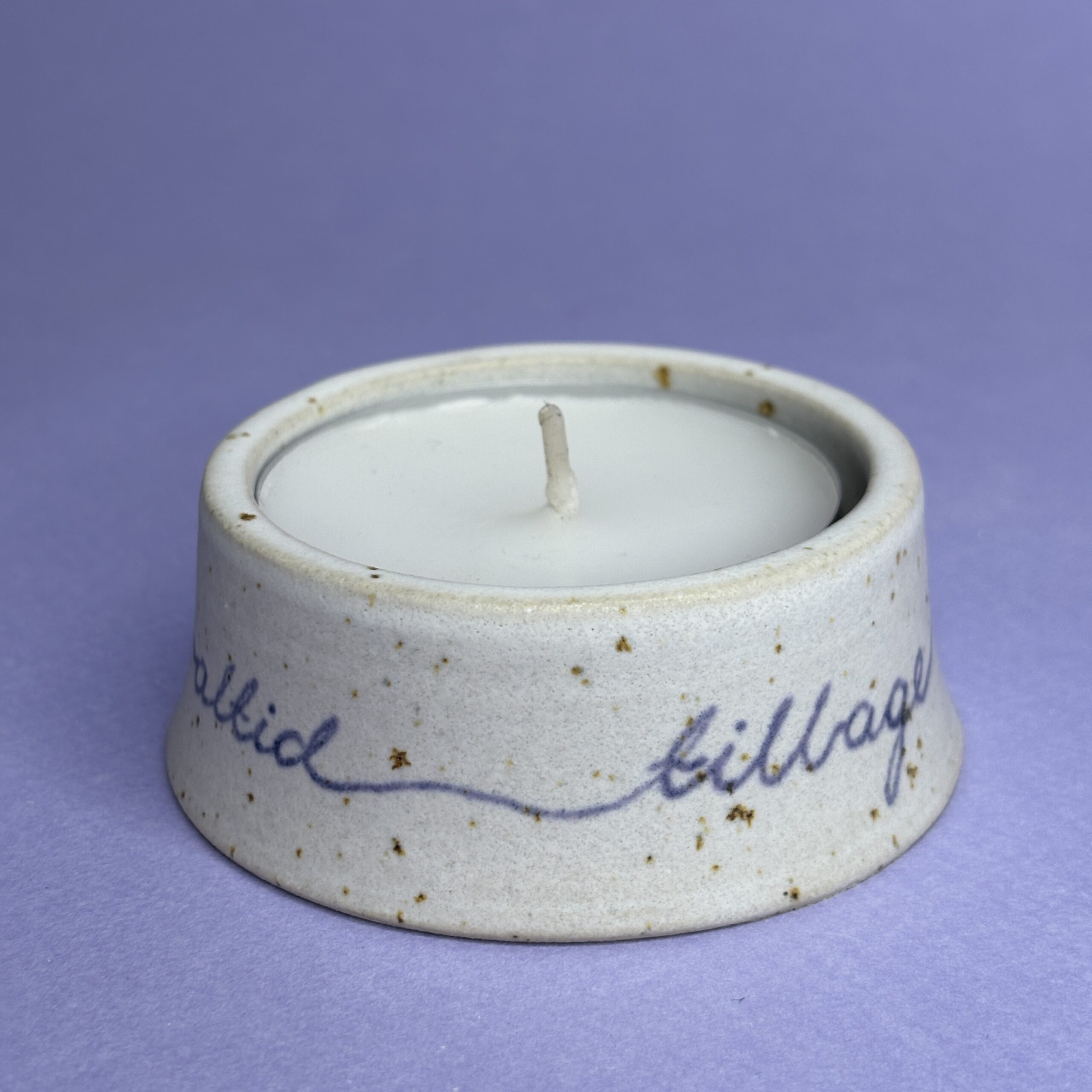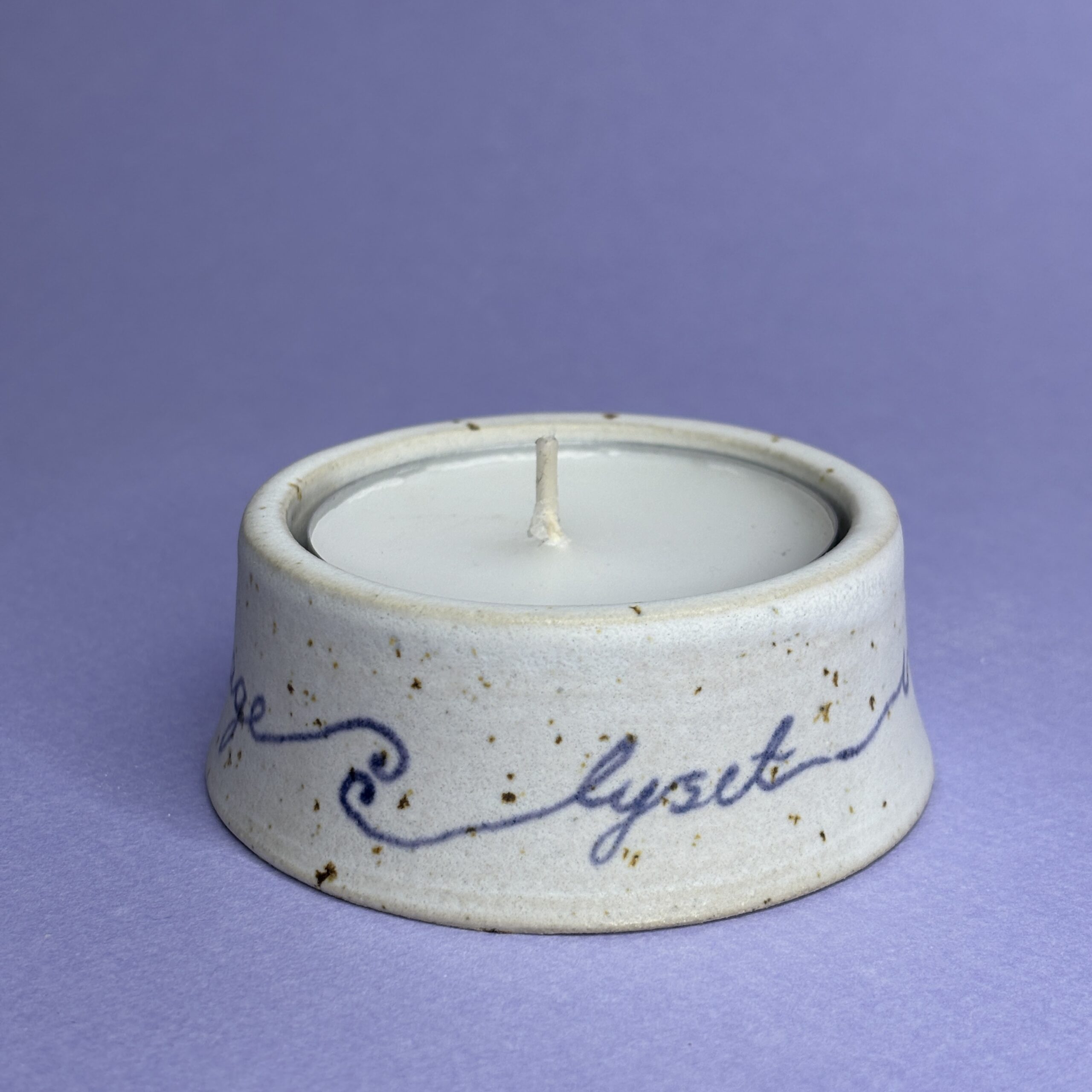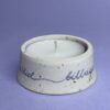 Drejet fyrfadsskål med håndskrevet budskab. Rummer et stort fyrfadslys eller bloklys max Ø5,5 cm.