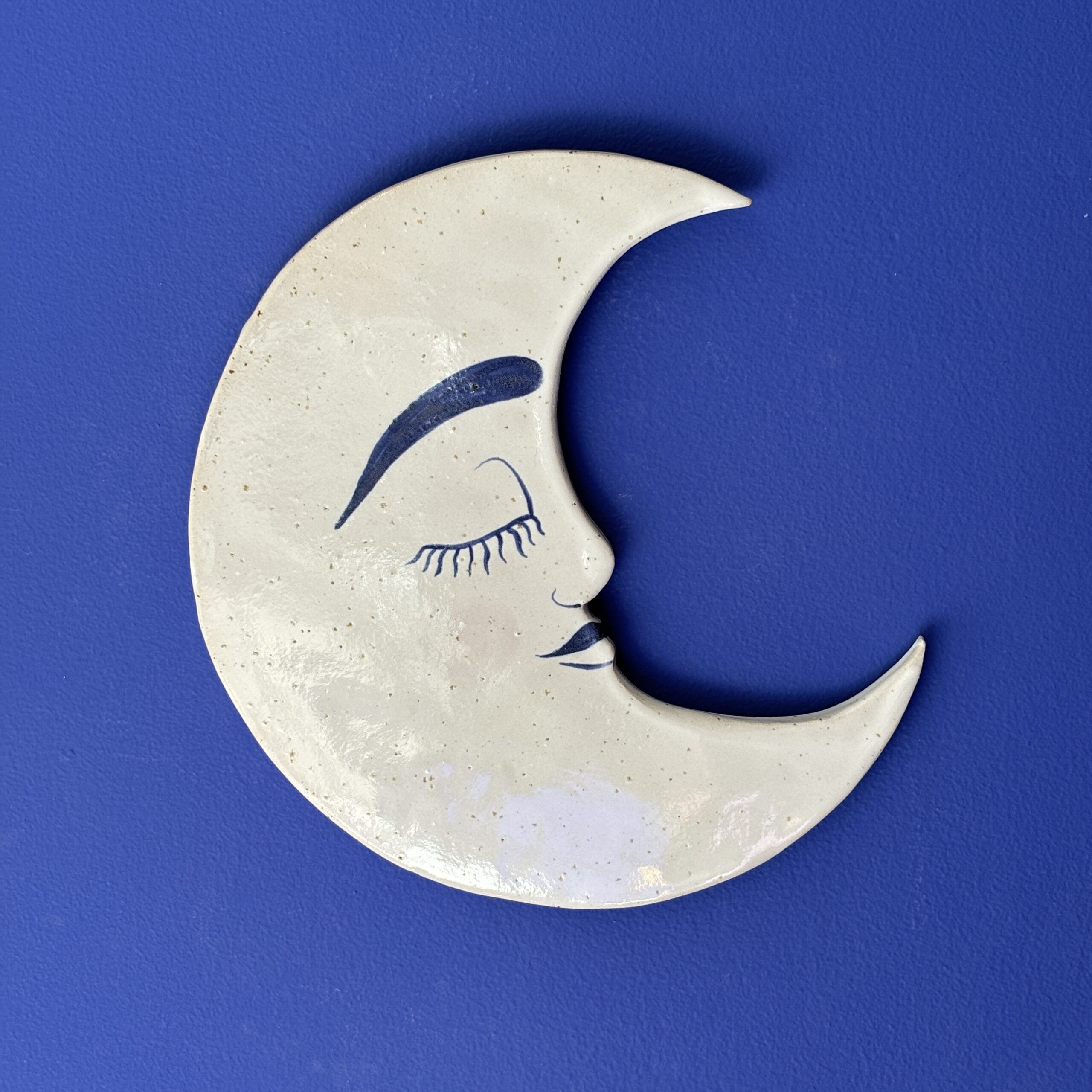 Månen er håndlavet i stentøjsler og dekoreret med glasur. Der er ophæng på bagsiden.