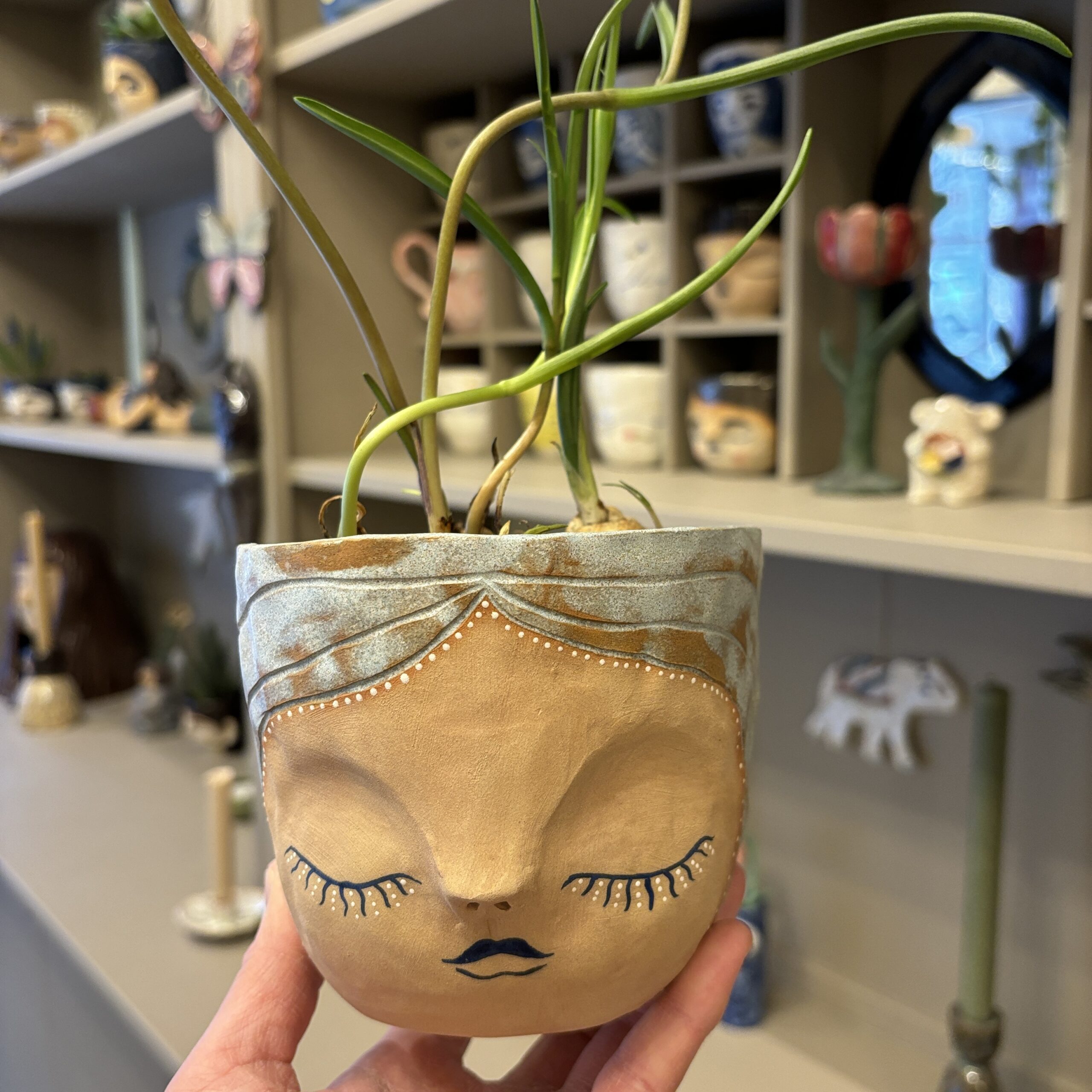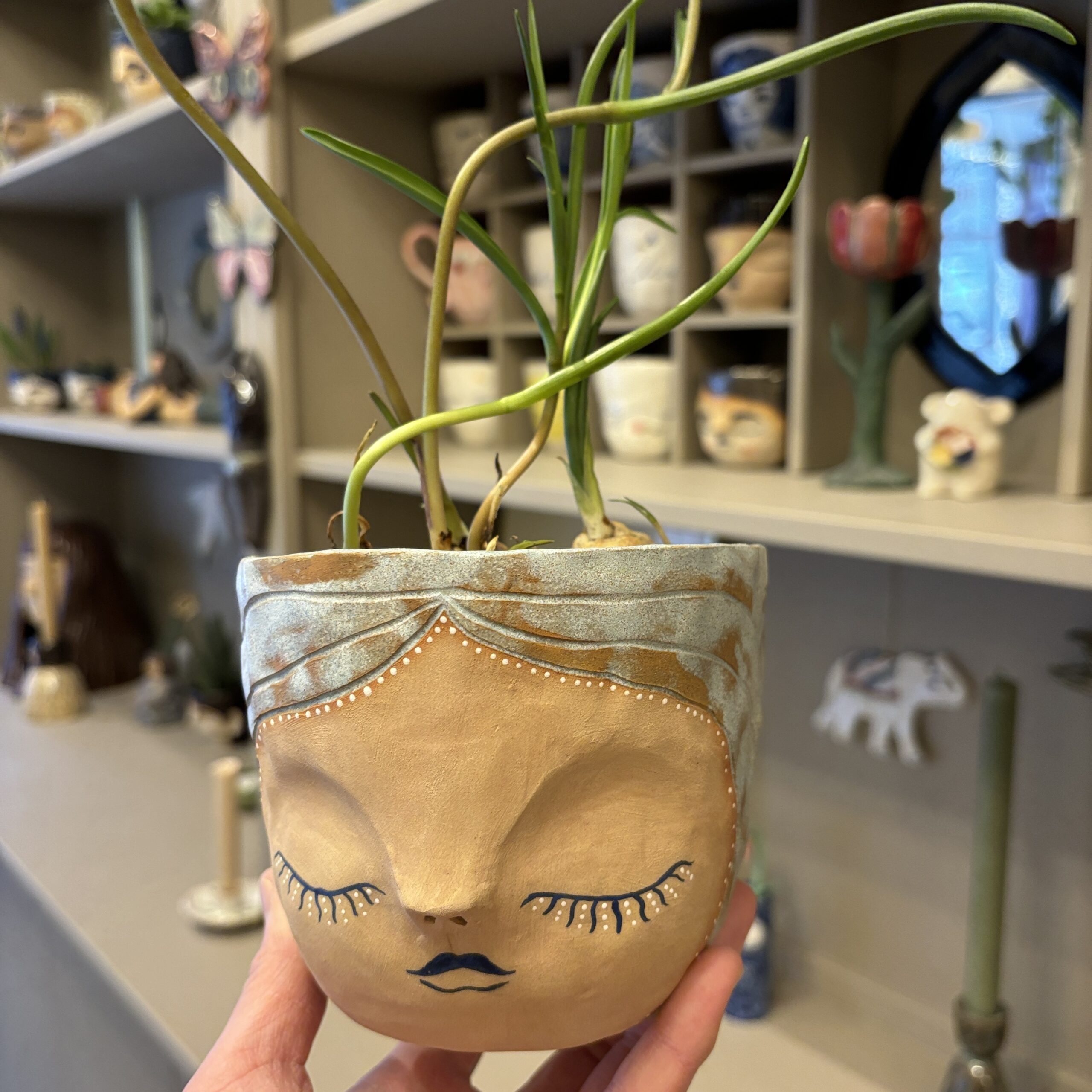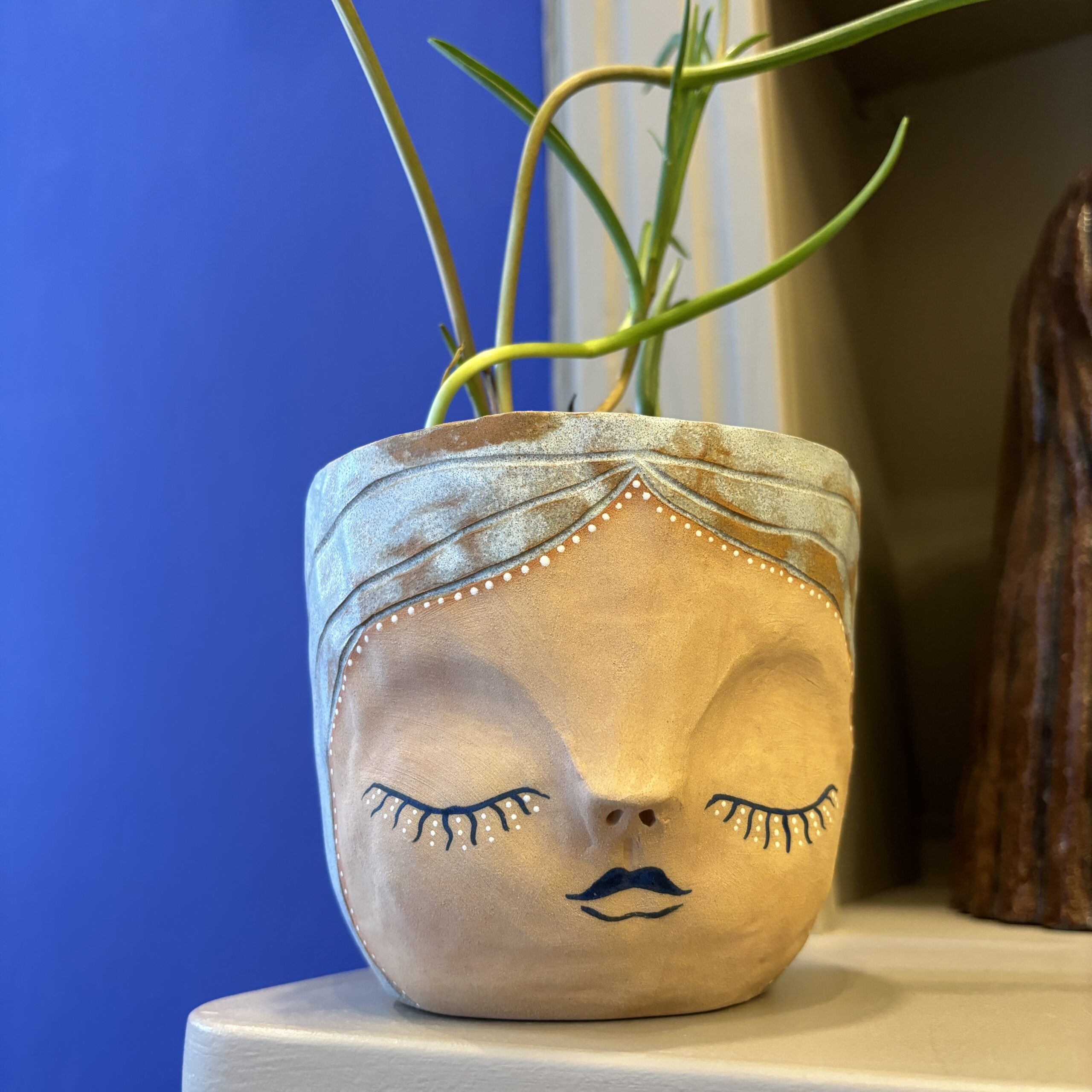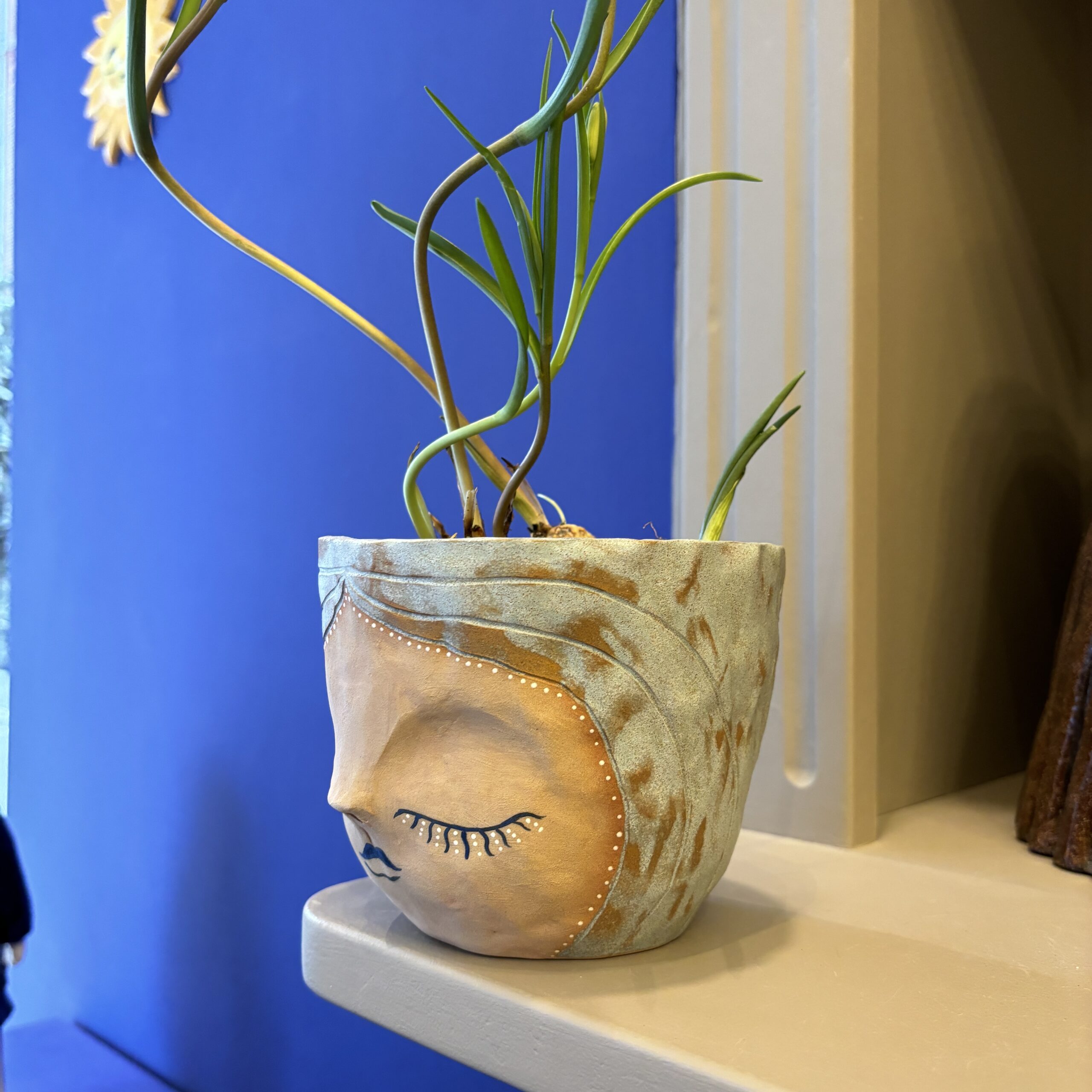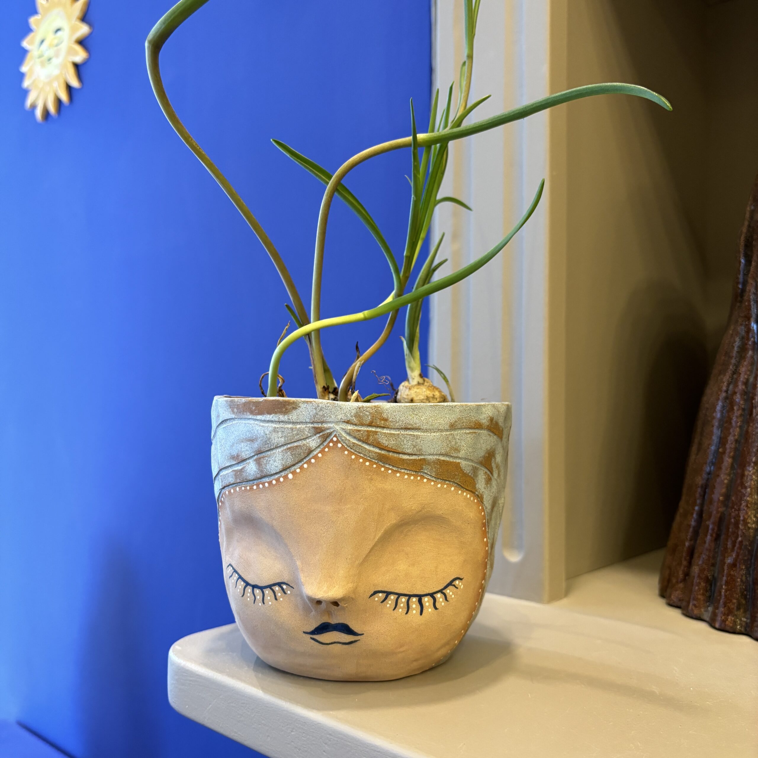 Håndmodelleret ansigtspotte i stentøjsler og dekoreret med glasur.
