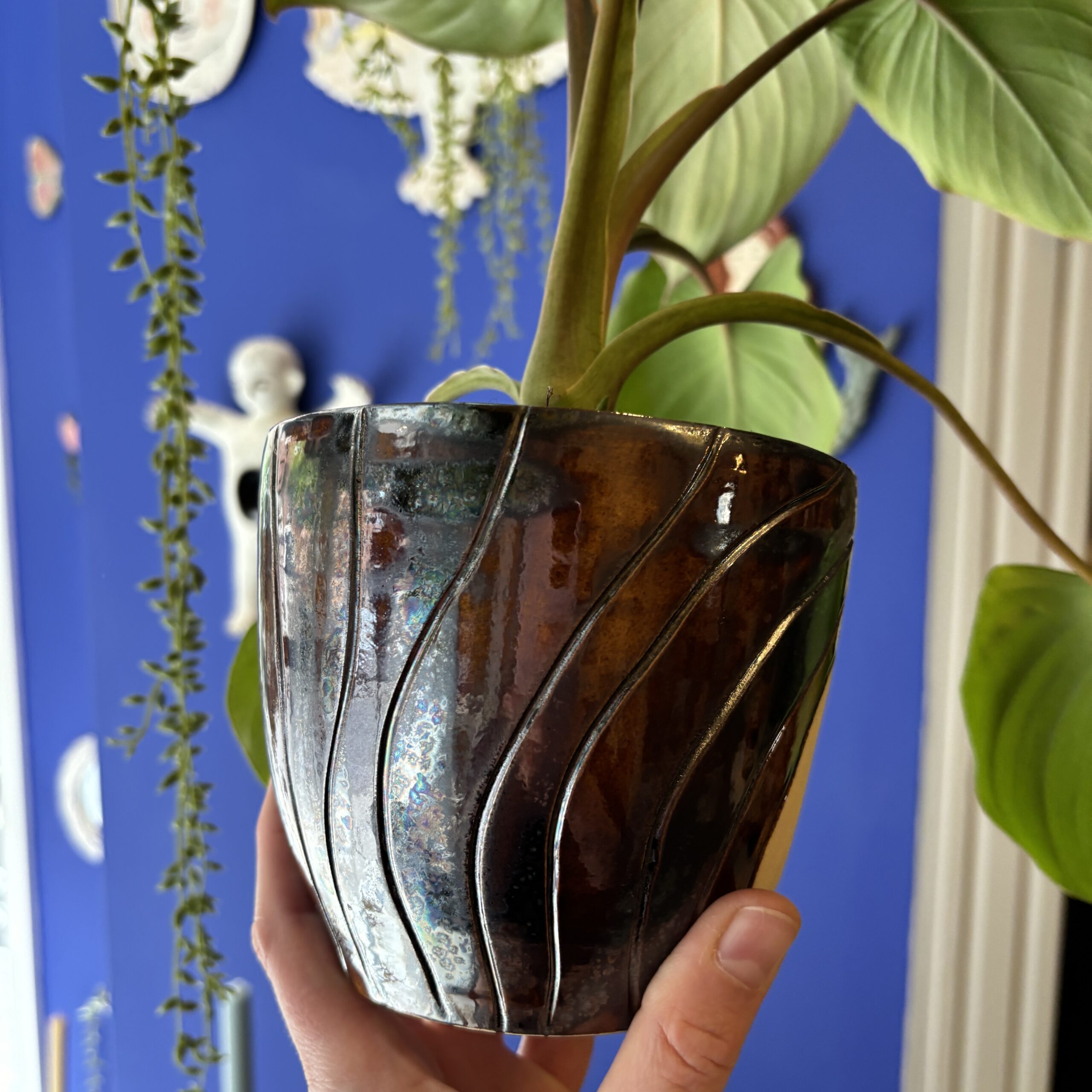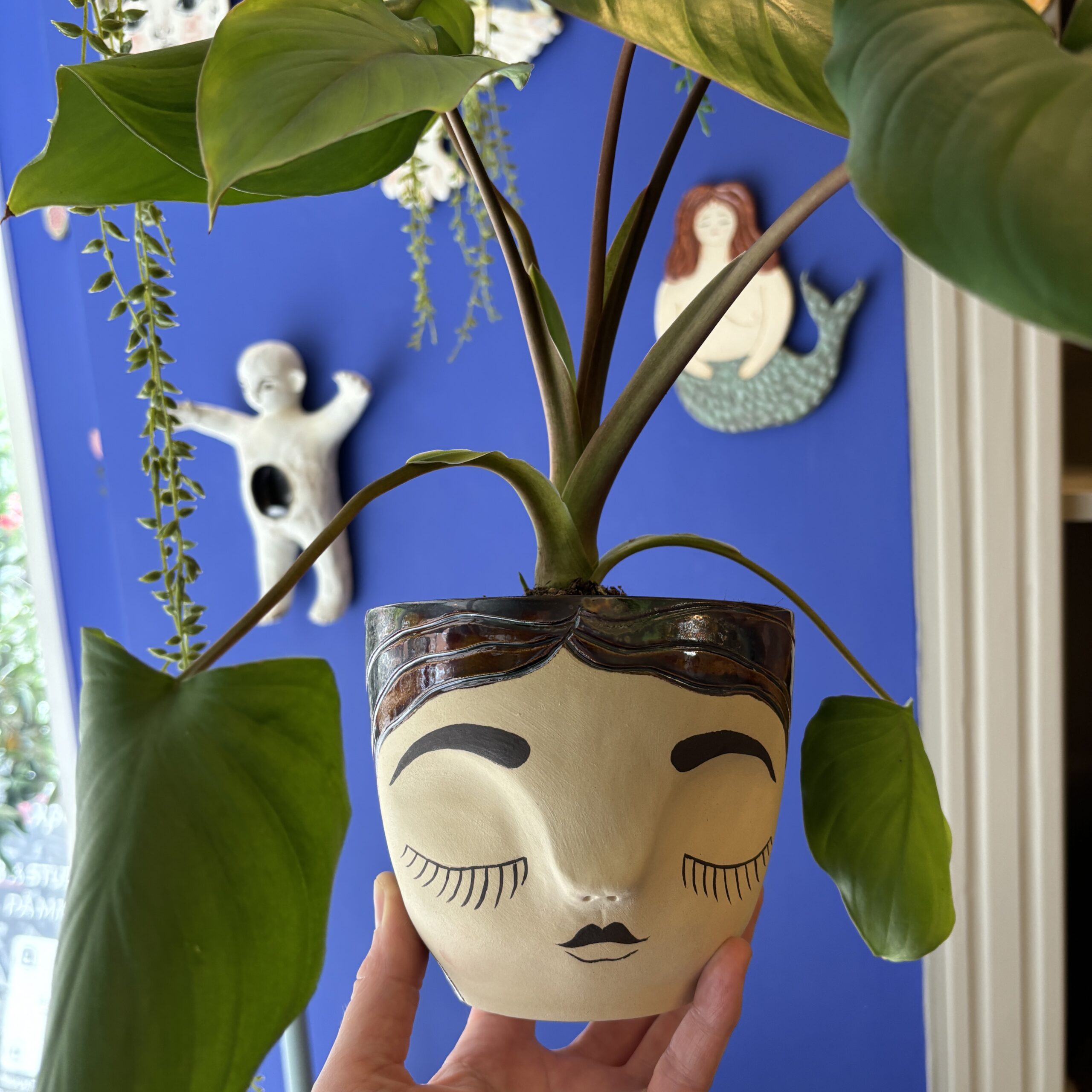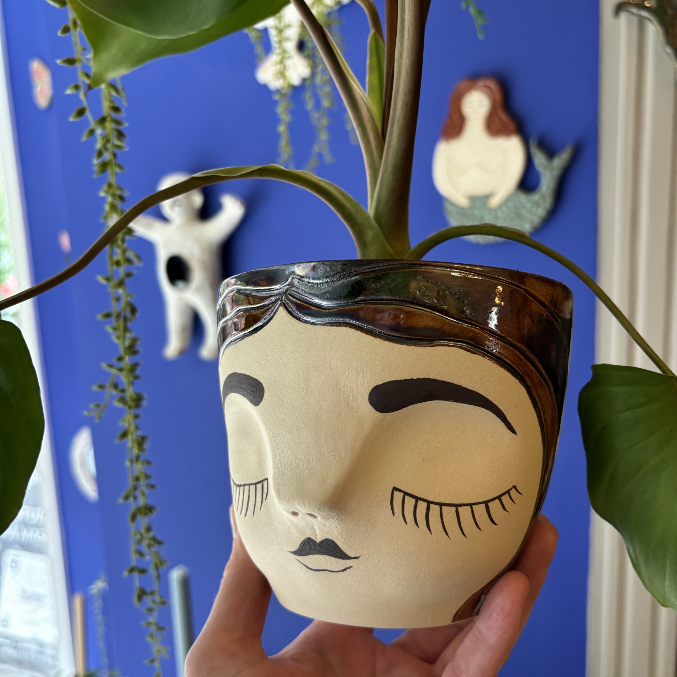 Hånddrejet ansigtspotte i stentøjsler og dekoreret med glasur.