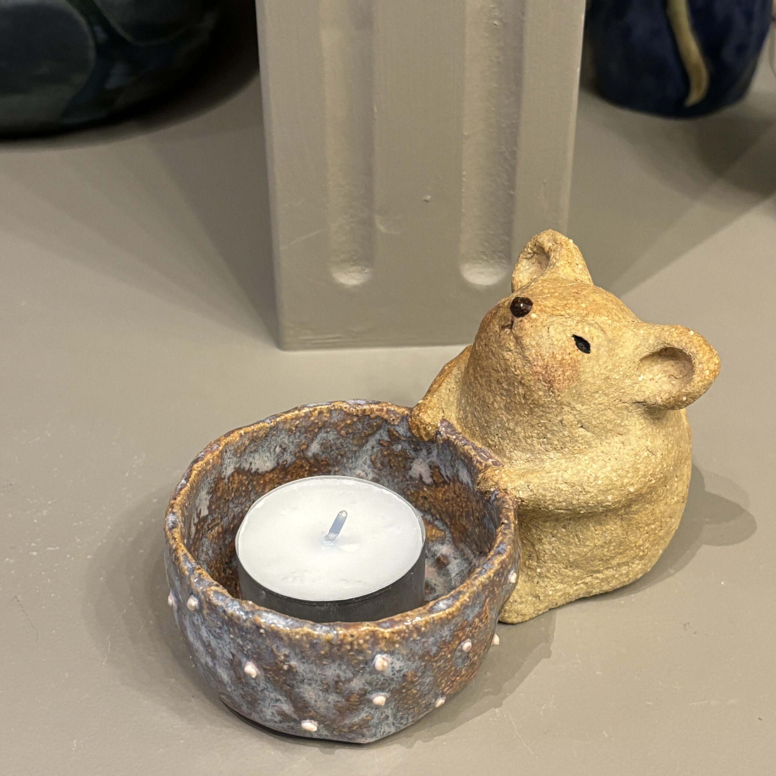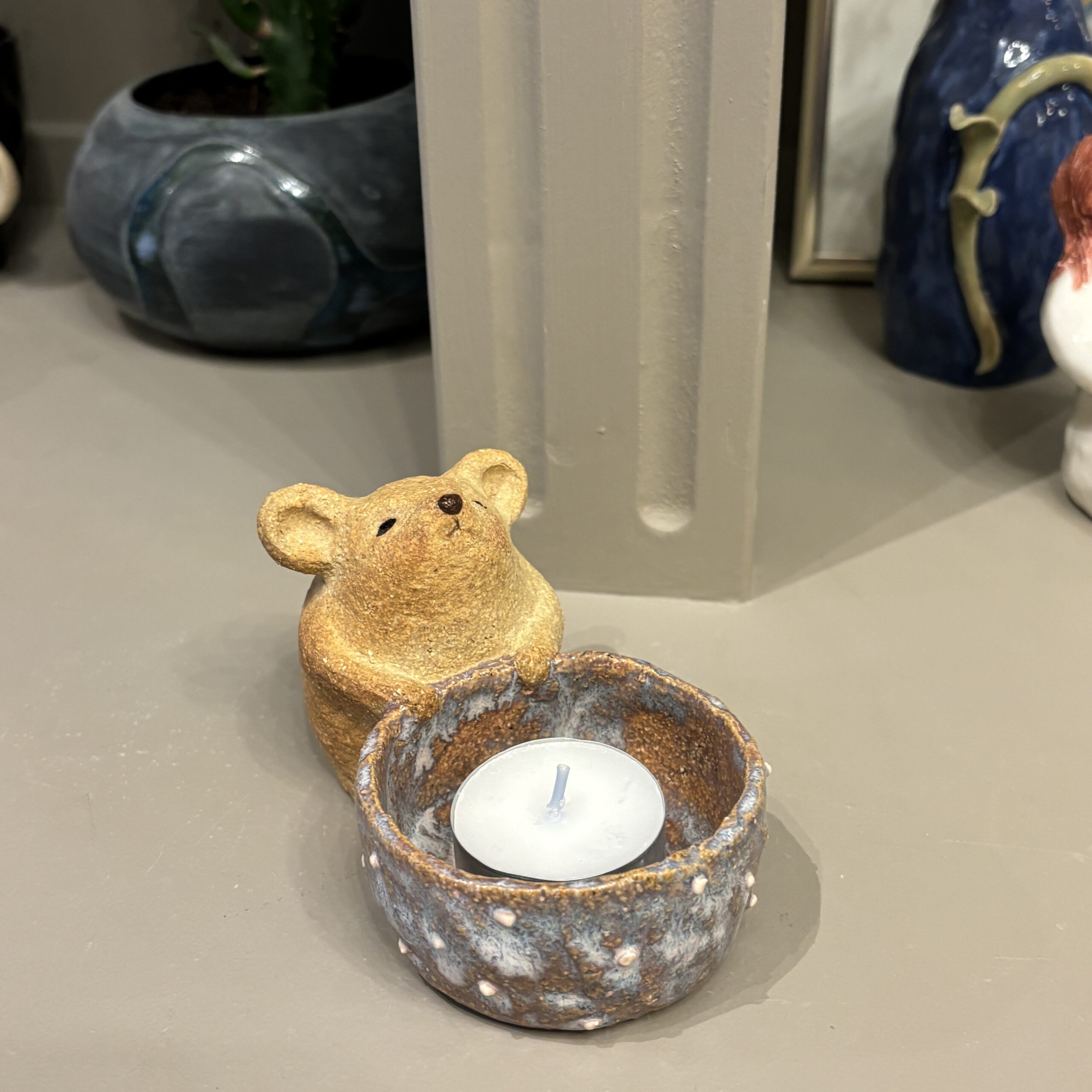 Nuttet og udtryksfuld mus med skål til fyrfadslys.