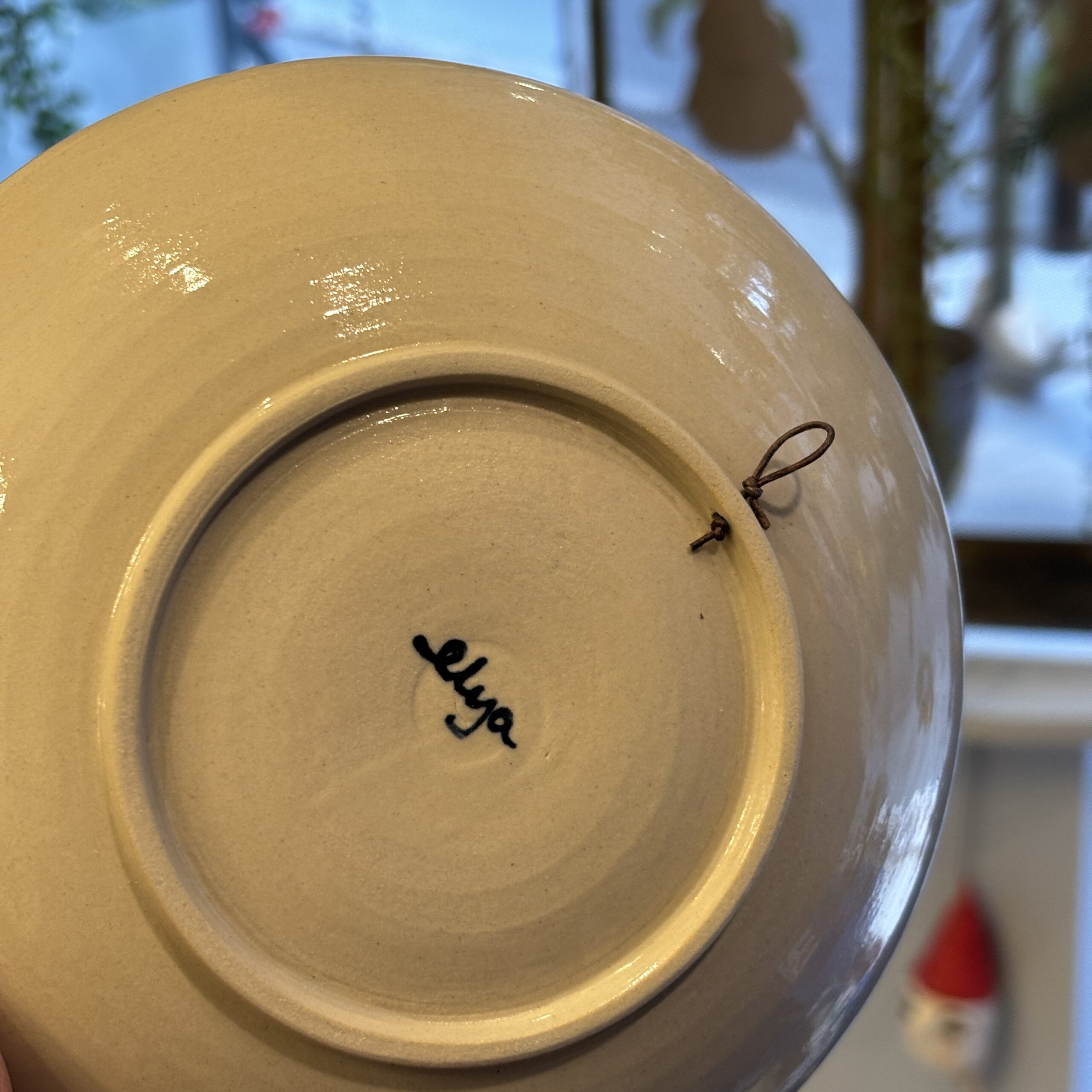 Skålen er hånddrejet i stentøjsler og dekoreret med glasur. Der er en snor på bagsiden til ophæng, ønskes den at bruges på anden vis, kan snoren blot fjernes.