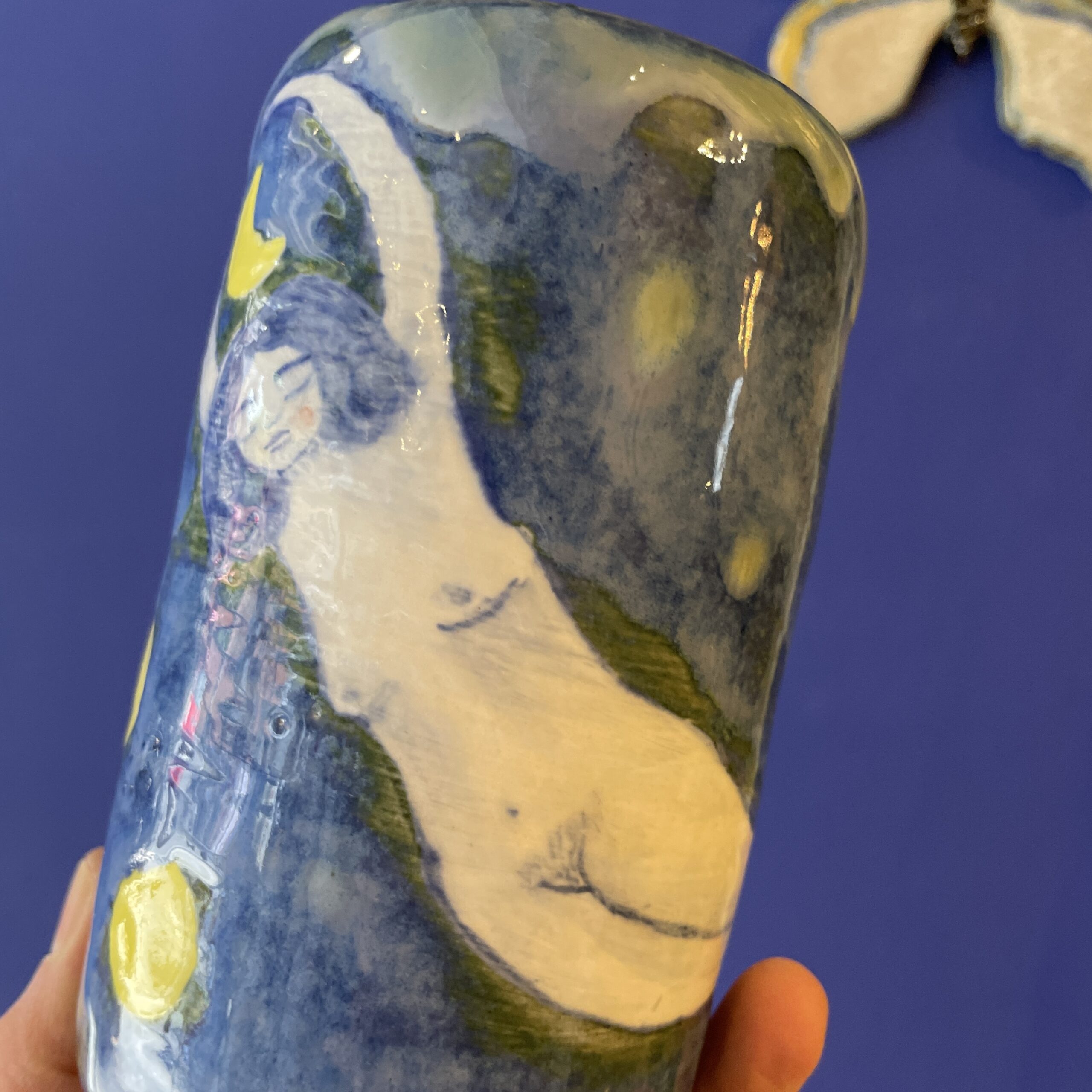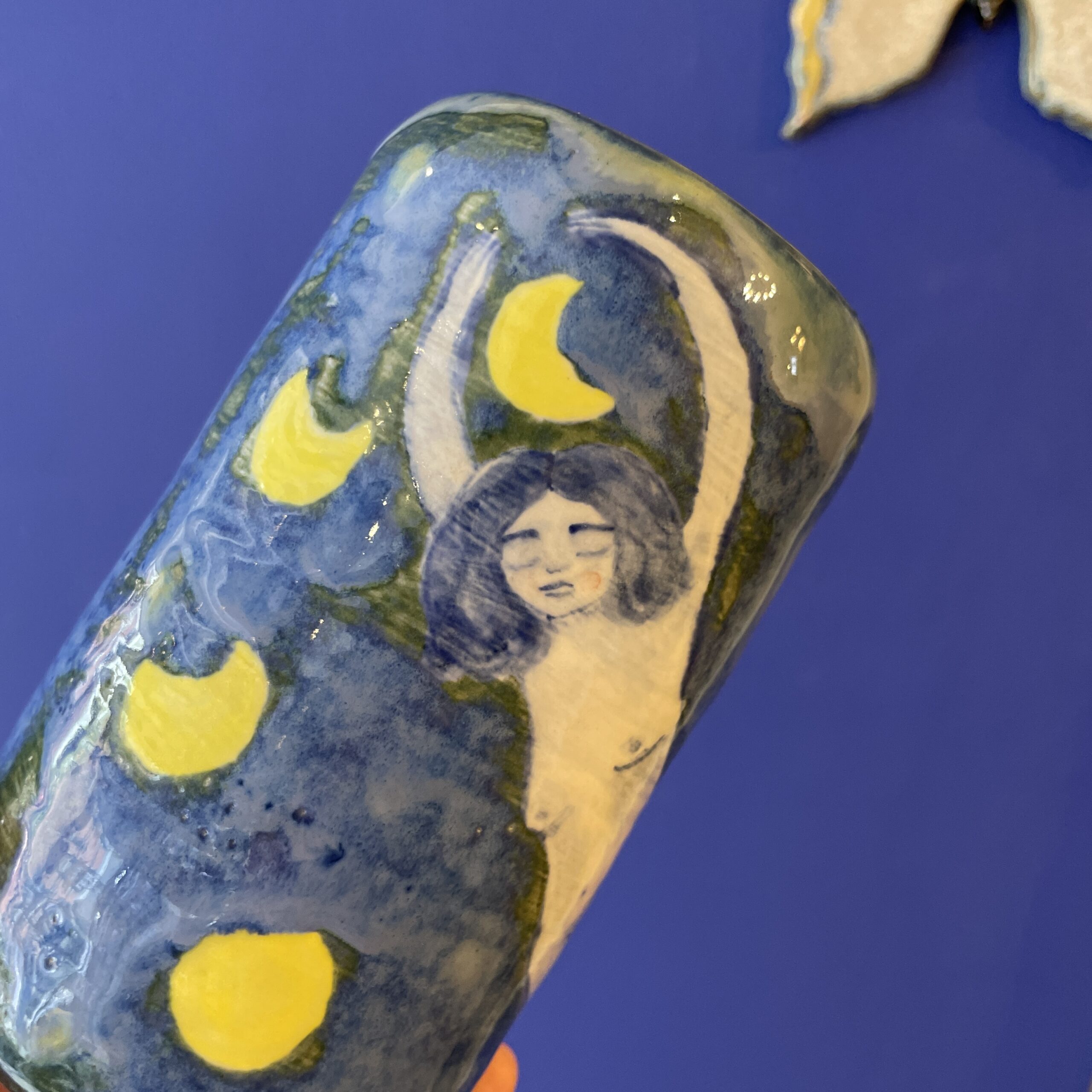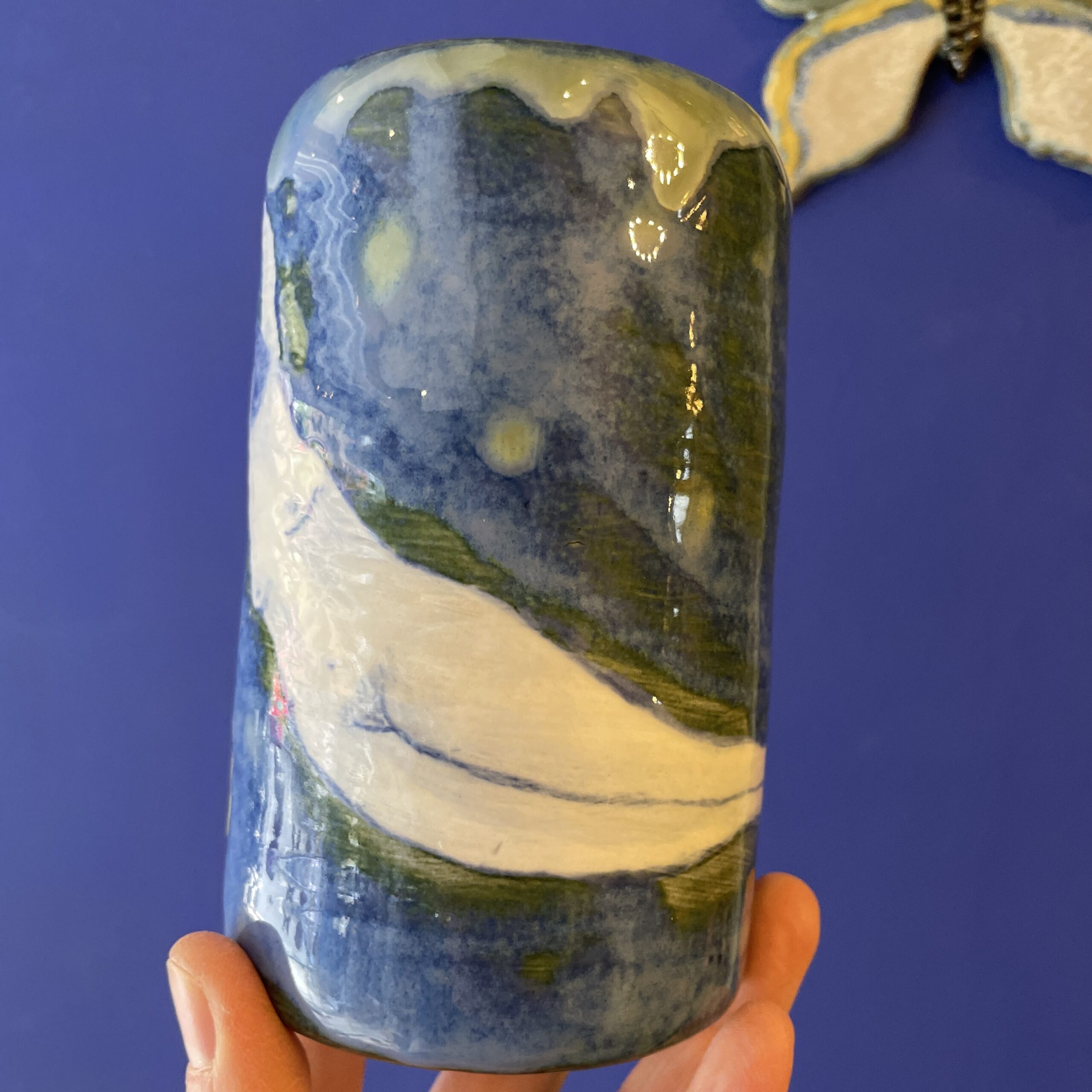 Vasen er lavet i stentøjsler og dekoreret med glasur.