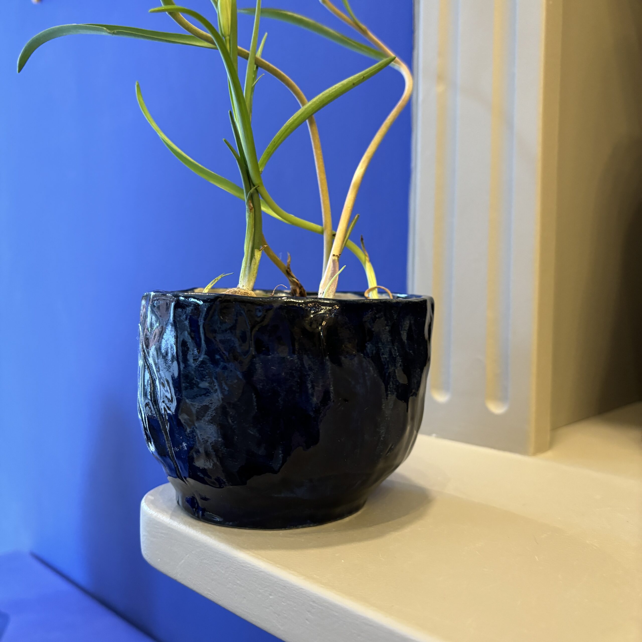 Potten er håndlavet i stentøjsler og dekoreret med glasur.