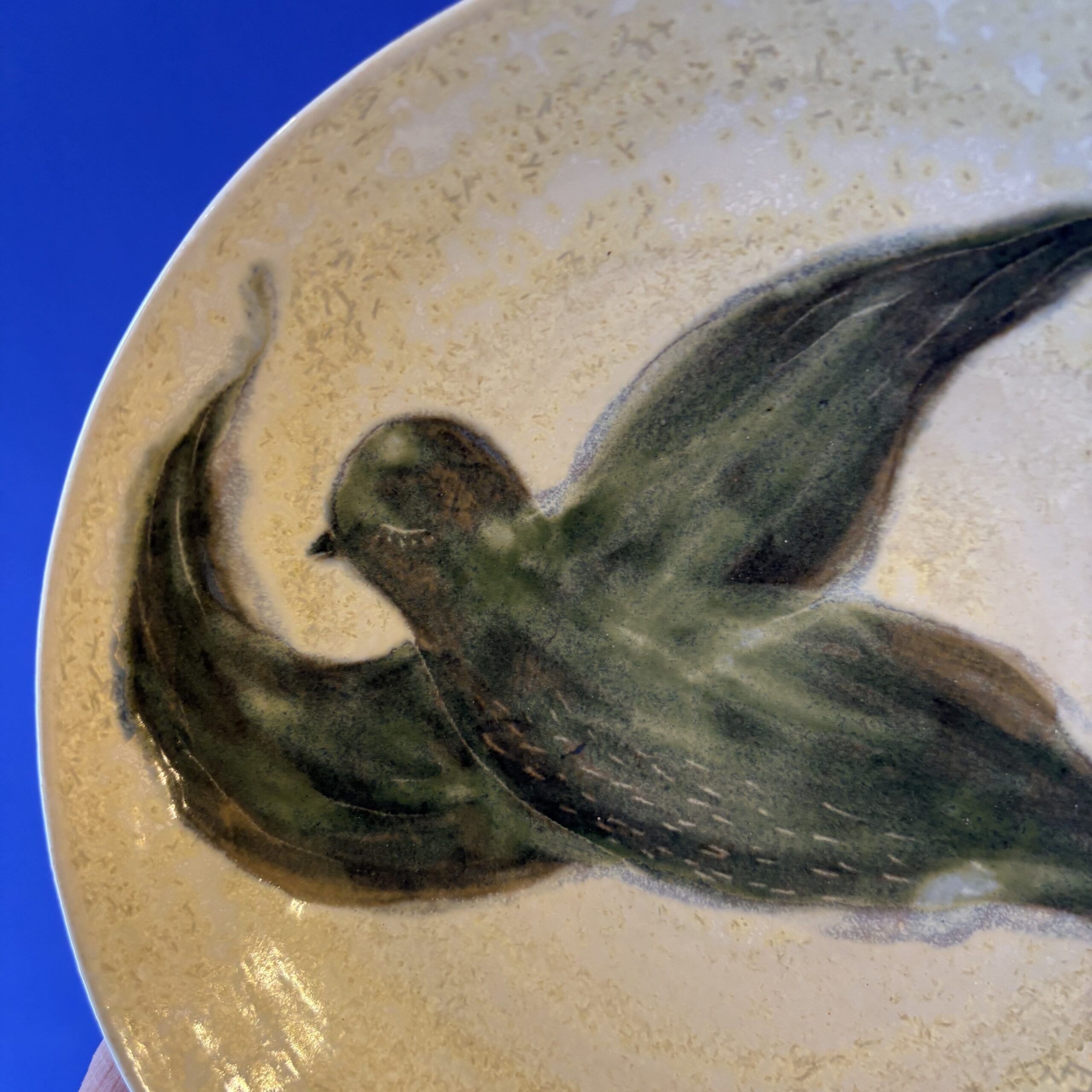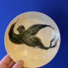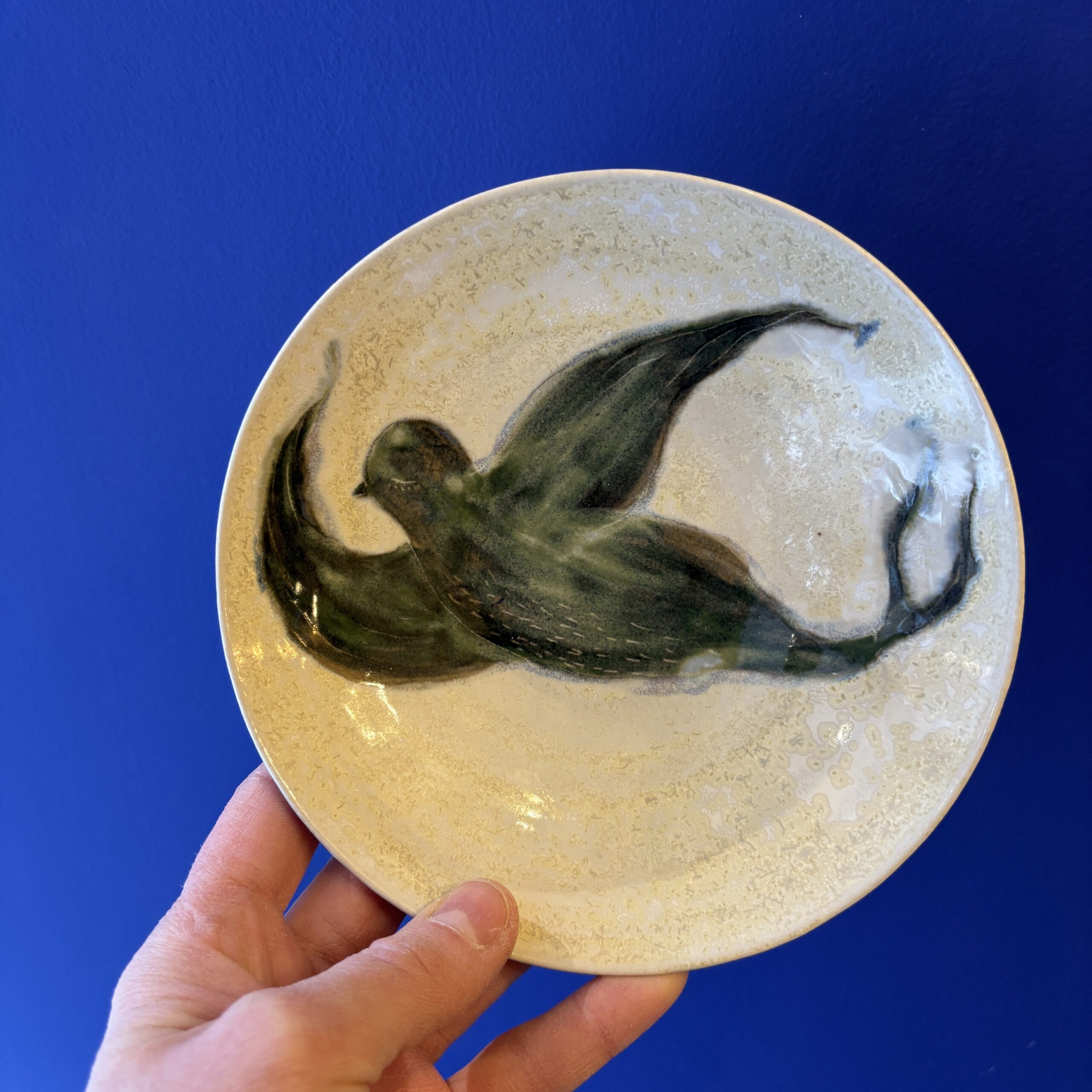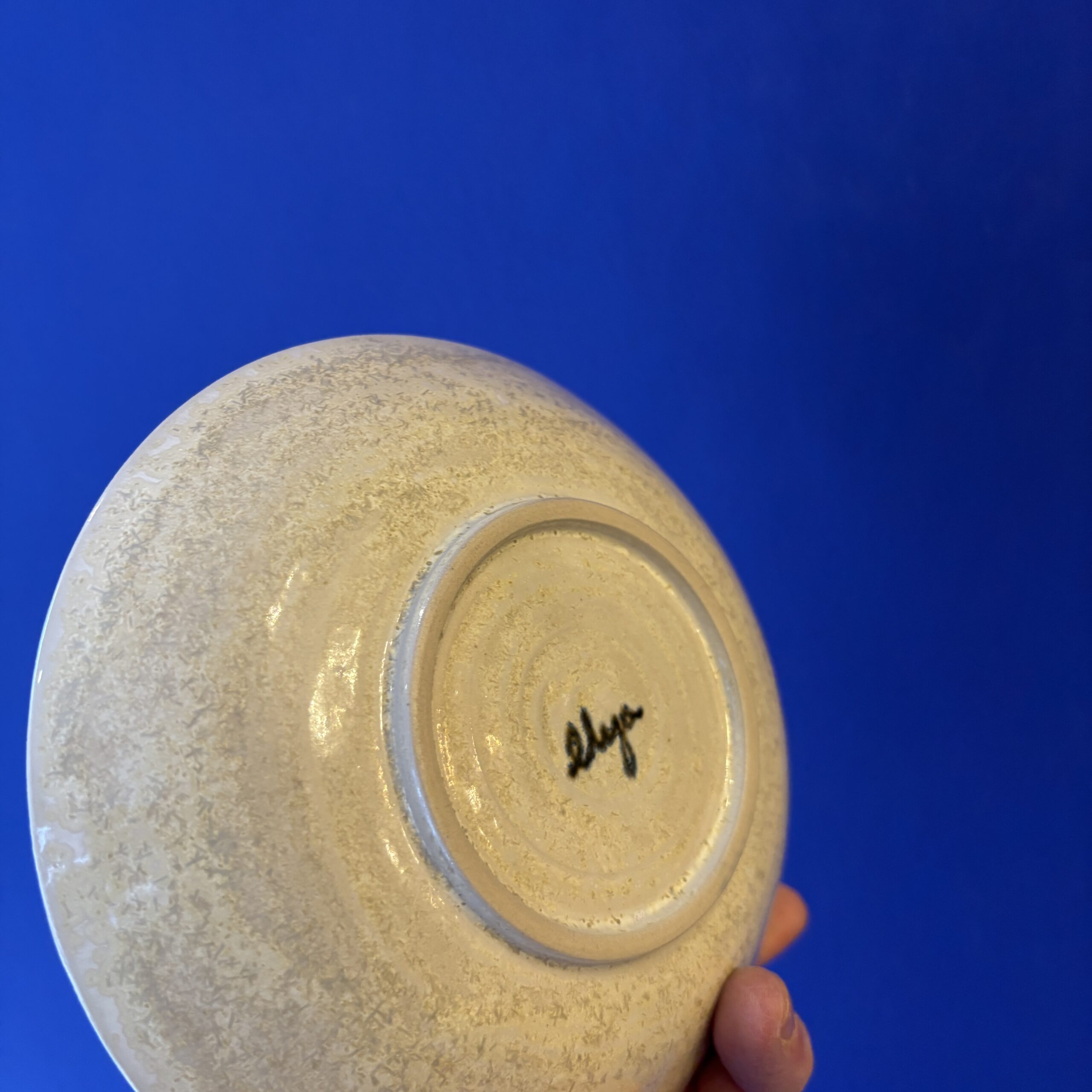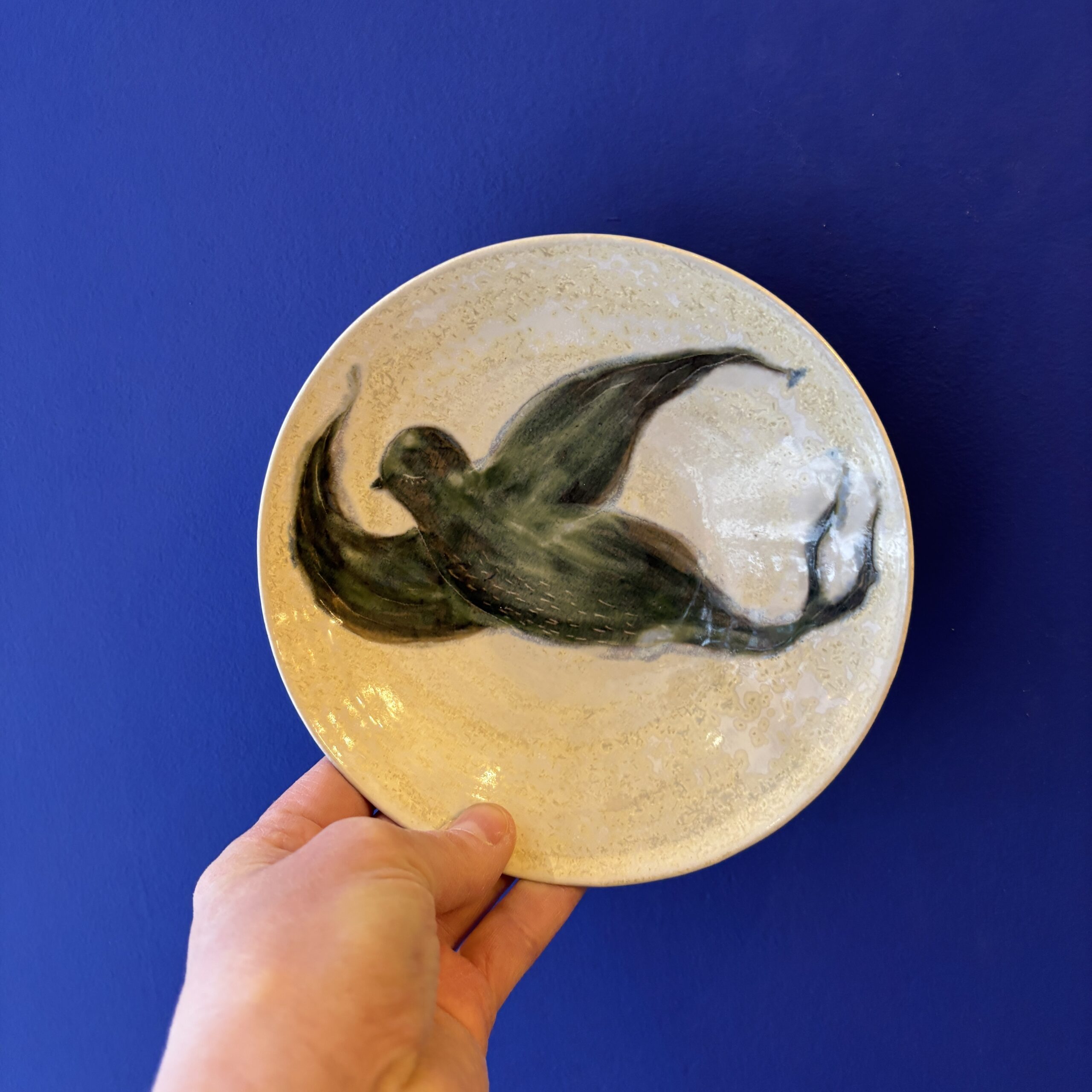 Skålen er hånddrejet i stentøjsler og dekoreret med glasur. Ønsker man at hænge den på væggen, skal der bruges platteophæng.