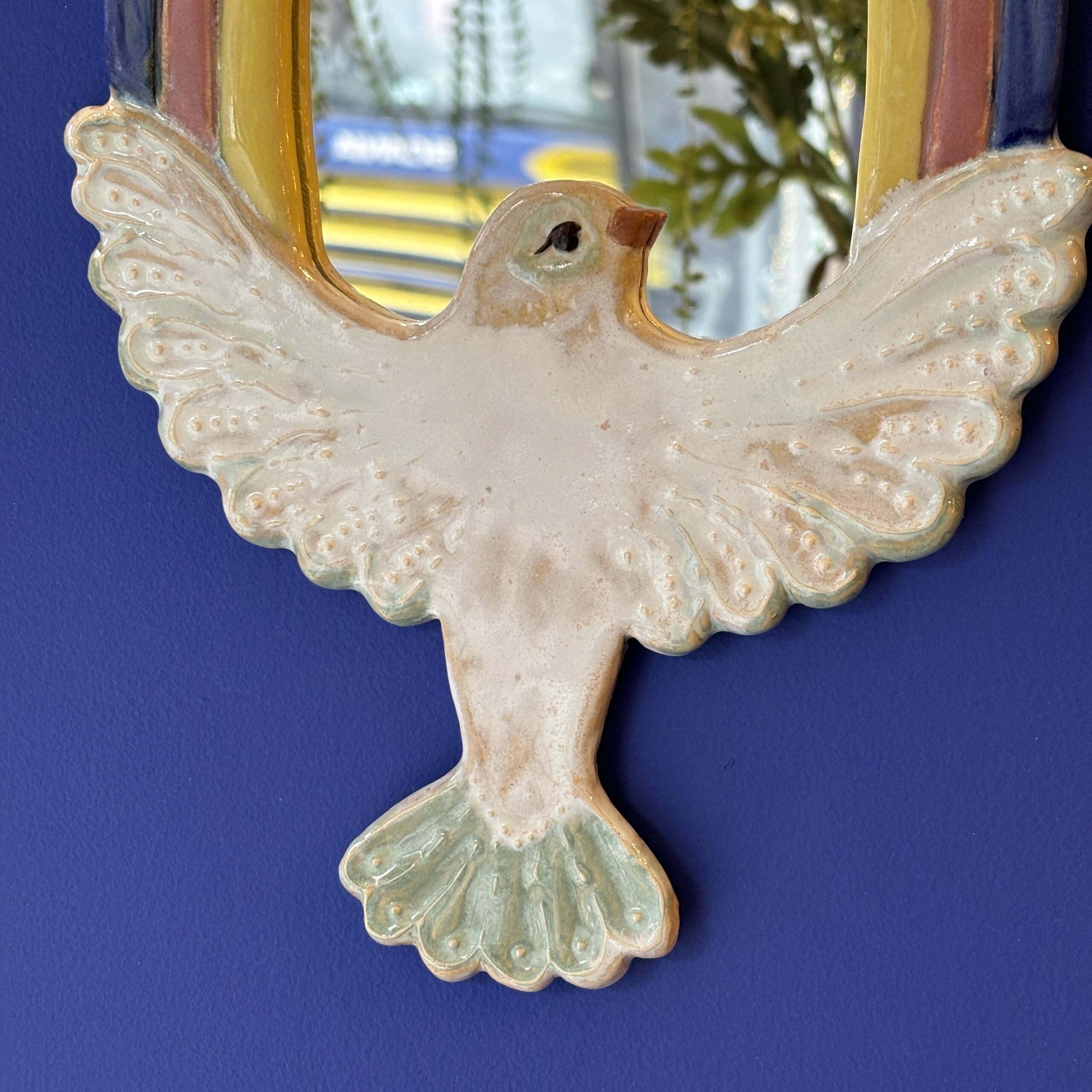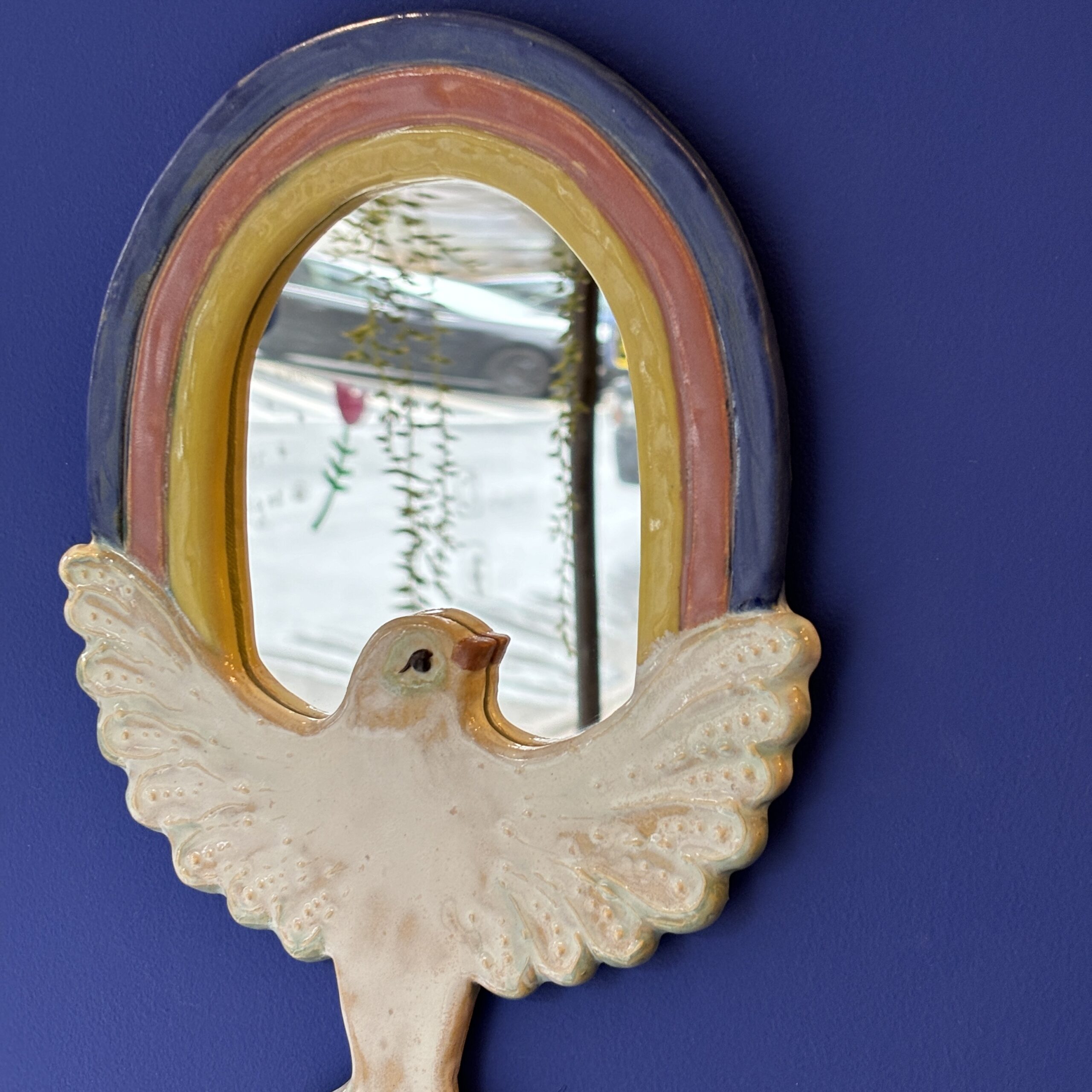 Spejlet er håndlavet i stentøjsler og dekoreret med glasur. Der er integreret ophæng på bagsiden.
