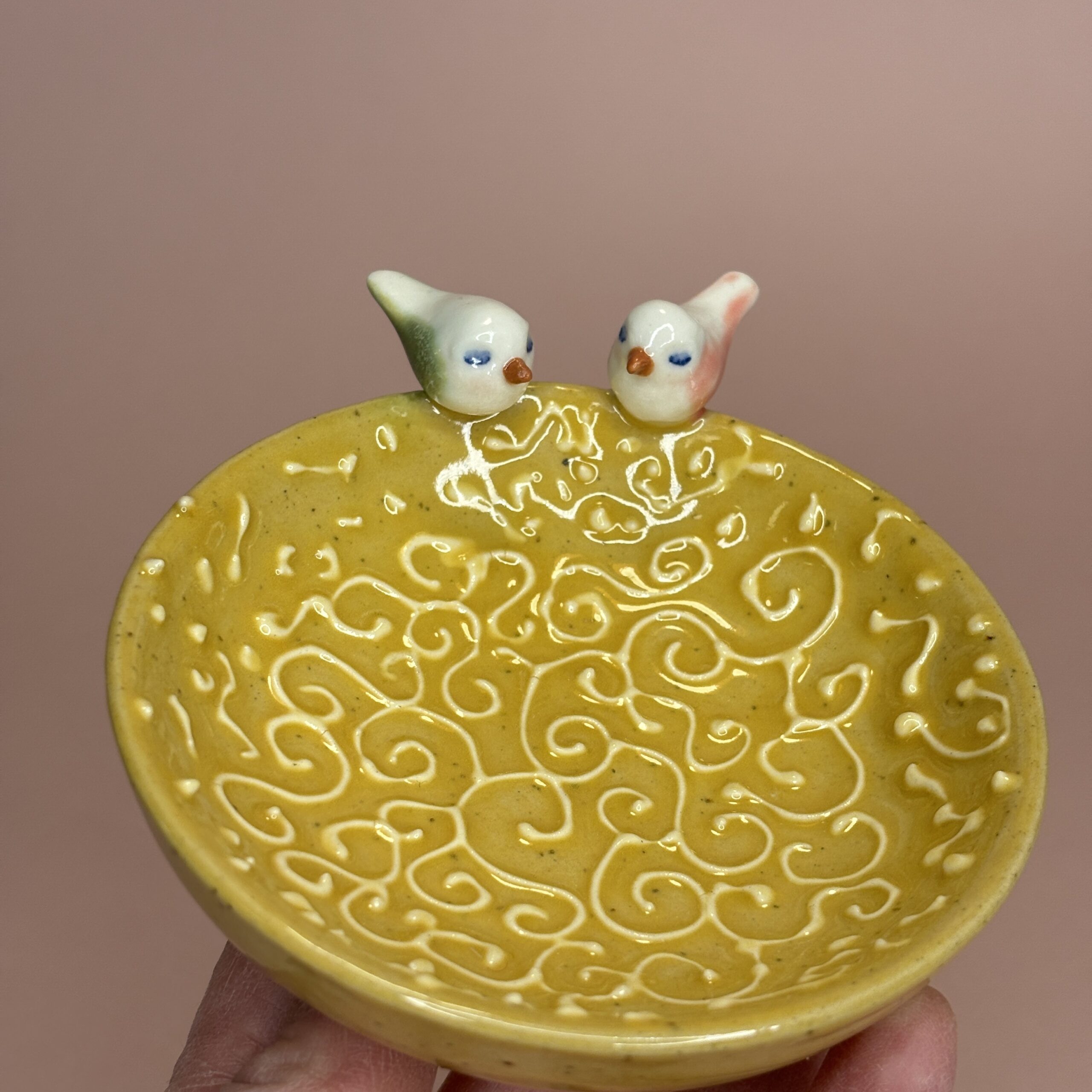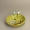 Skålen er drejet i stentøjsler og påsat små porcelænsfugle.