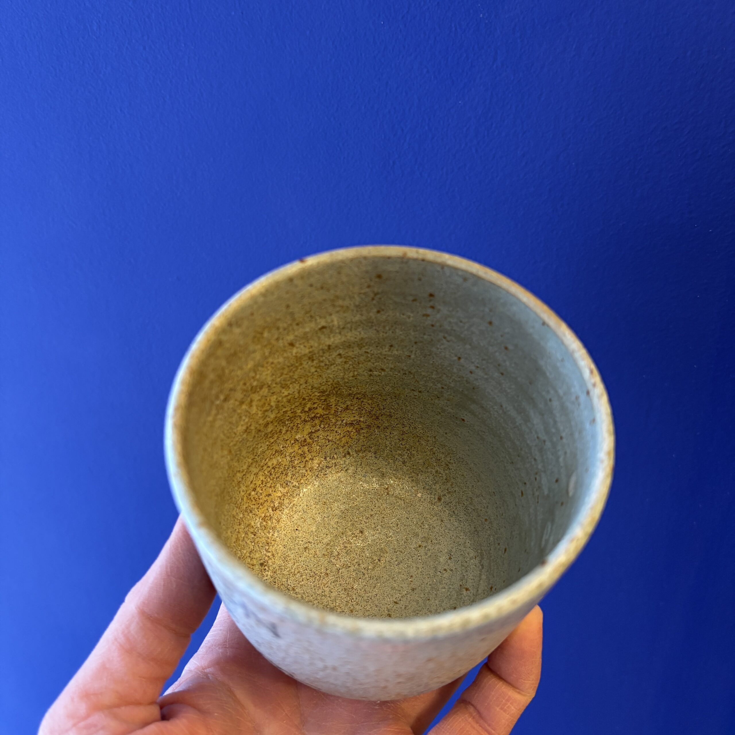 Koppen er drejet i stentøjsler og dekoreret med glasur.