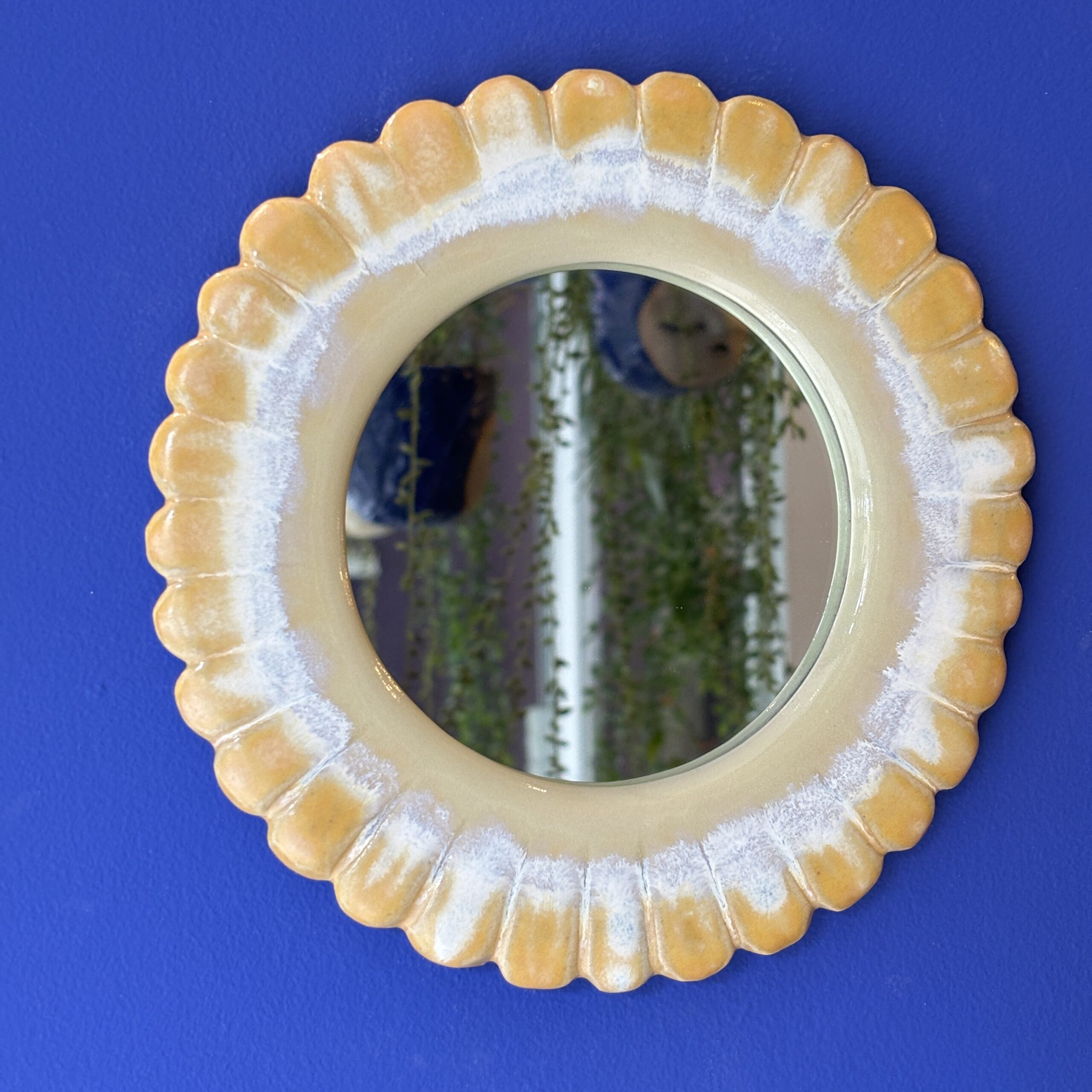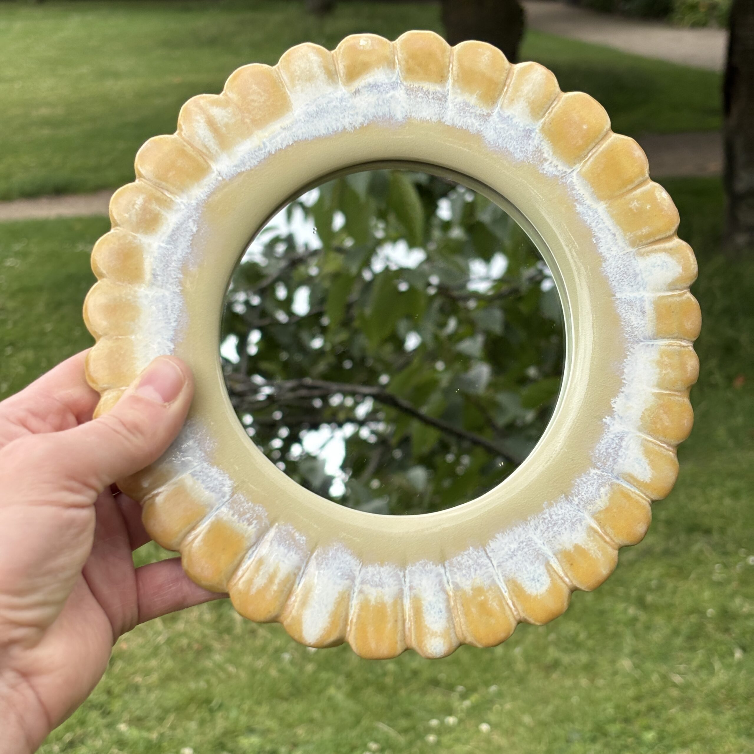 Spejlet er håndlavet i stentøjsler og dekoreret med glasur. Der er integreret ophæng på bagsiden.