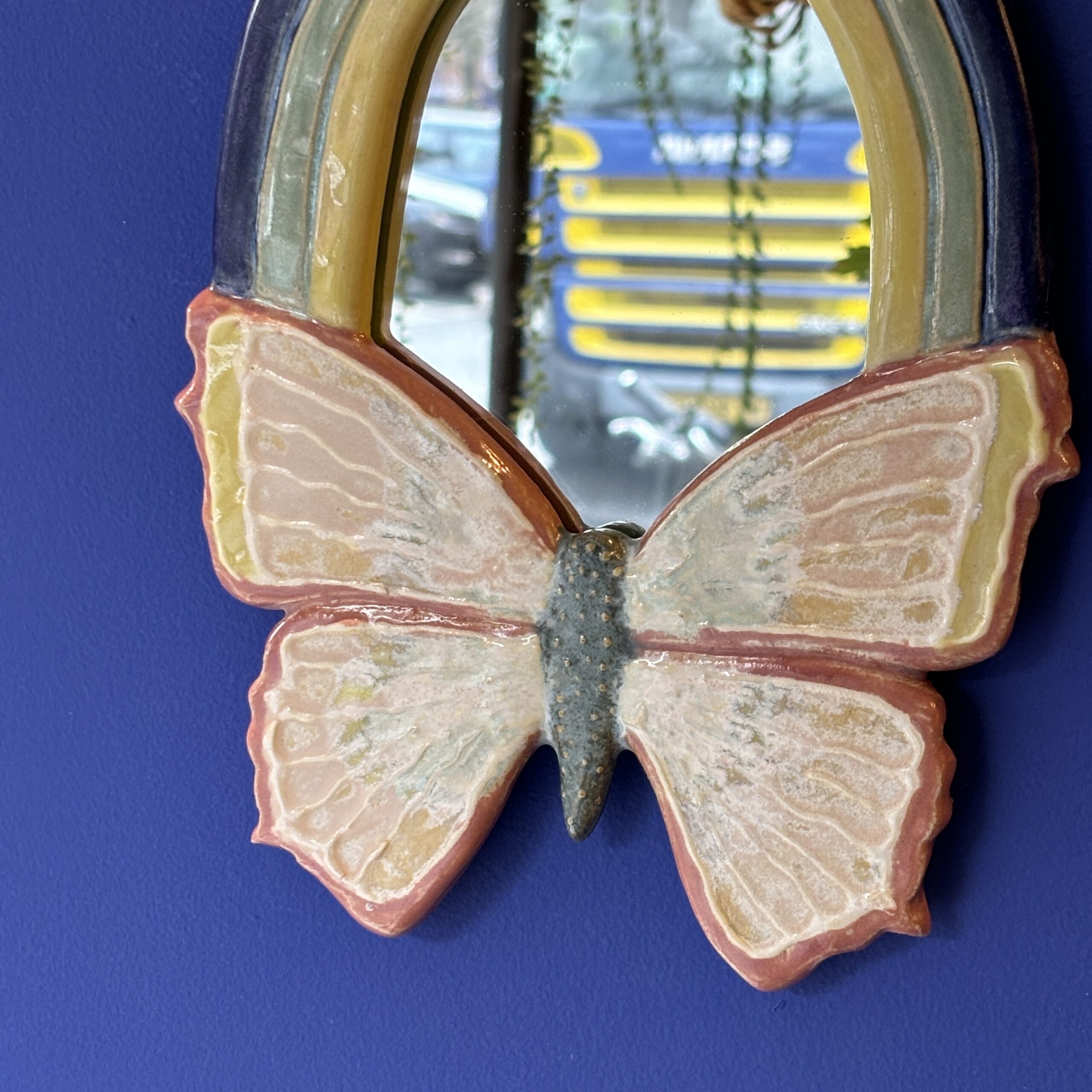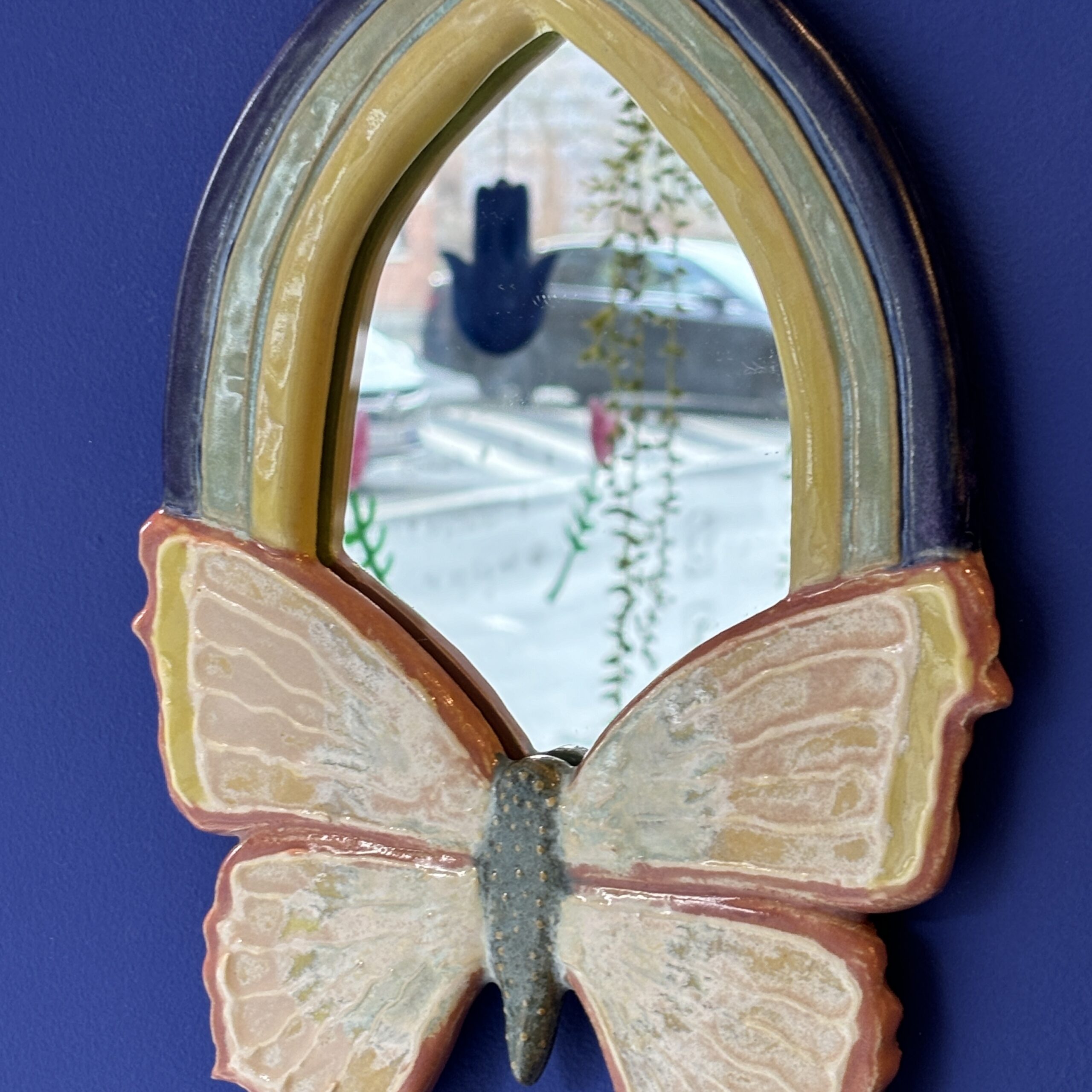 Spejlet er håndlavet i stentøjsler og dekoreret med glasur. Der er ophæng på bagsiden.