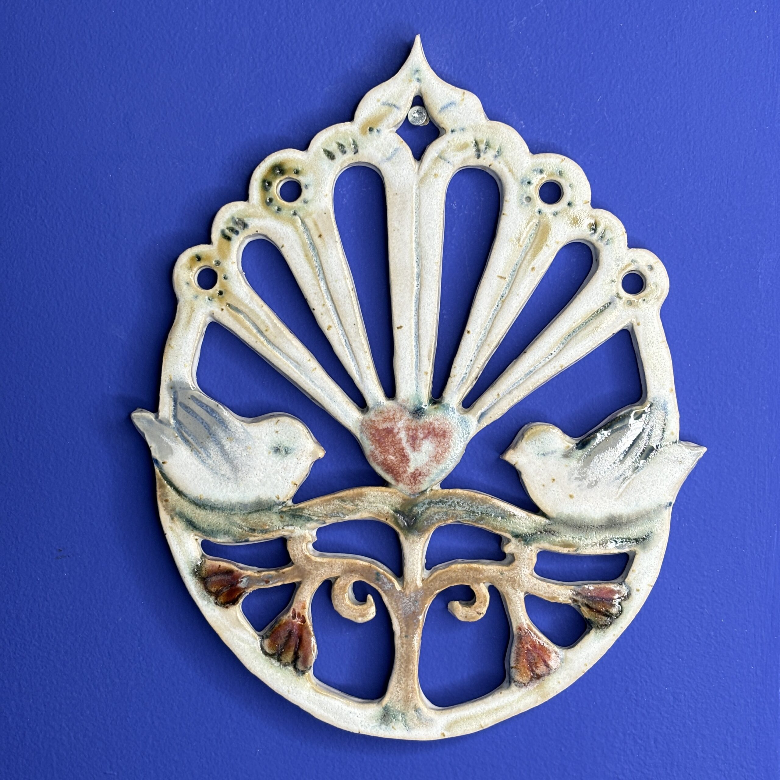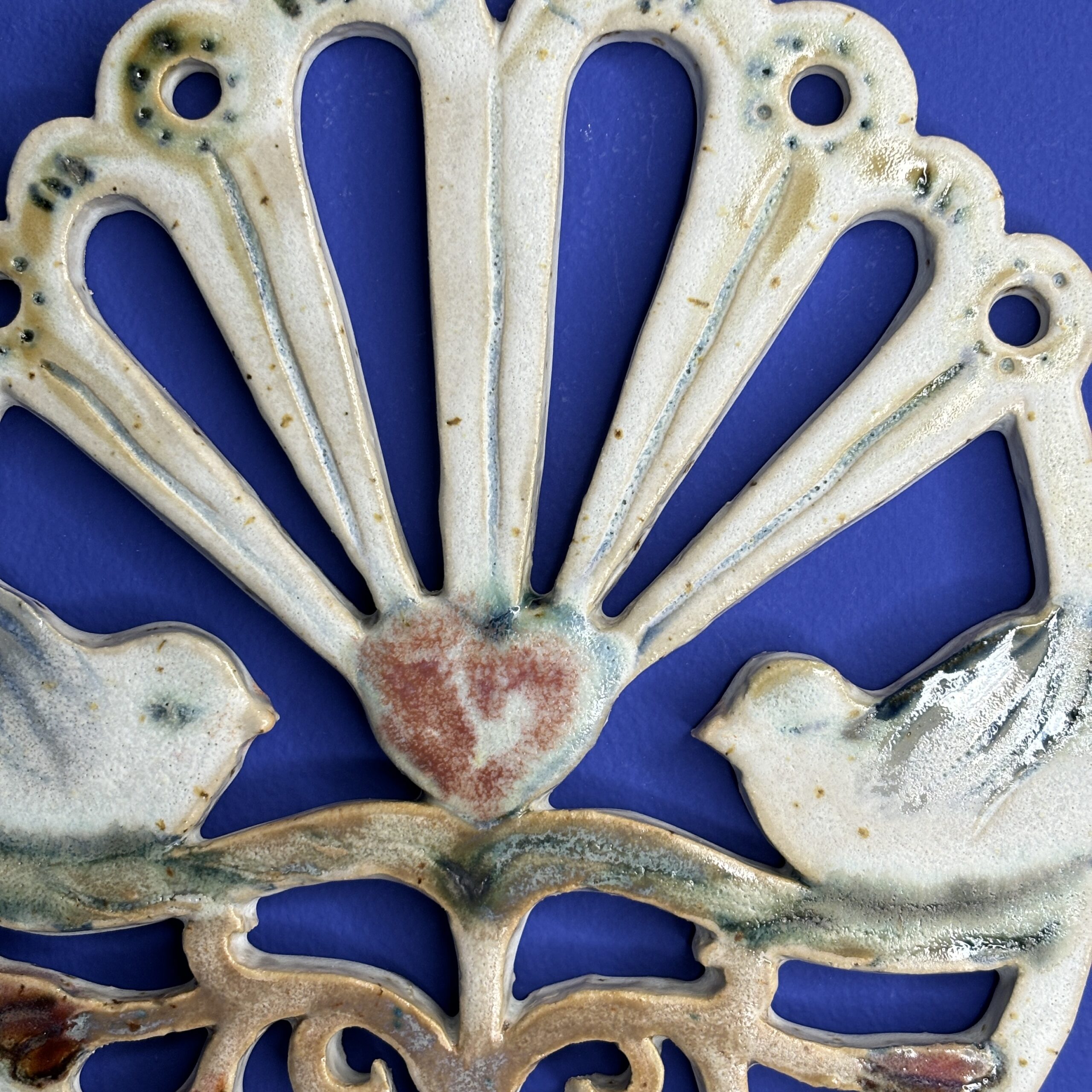 Ophænget er lavet af lyst stentøjsler og dekoreret med glasur.