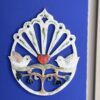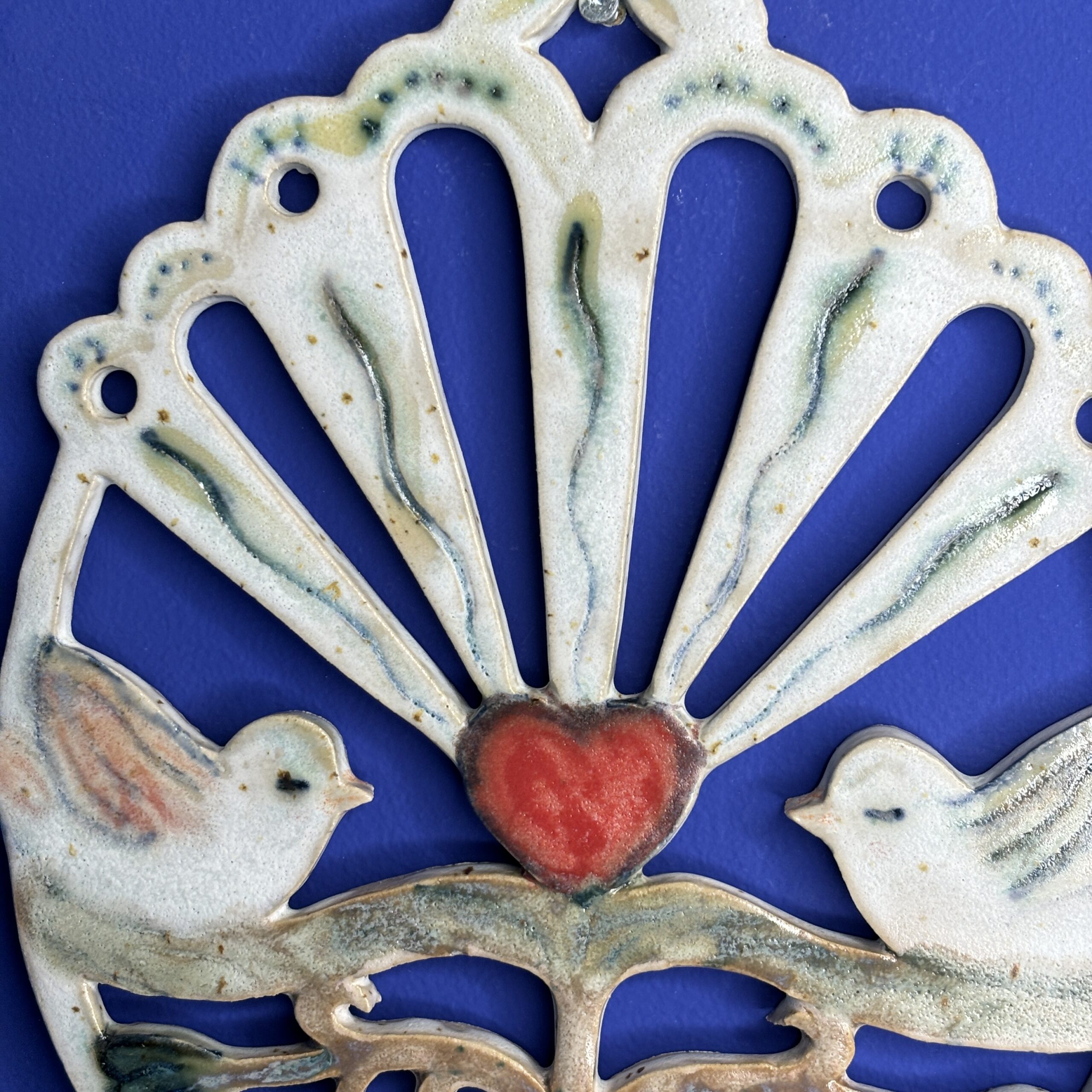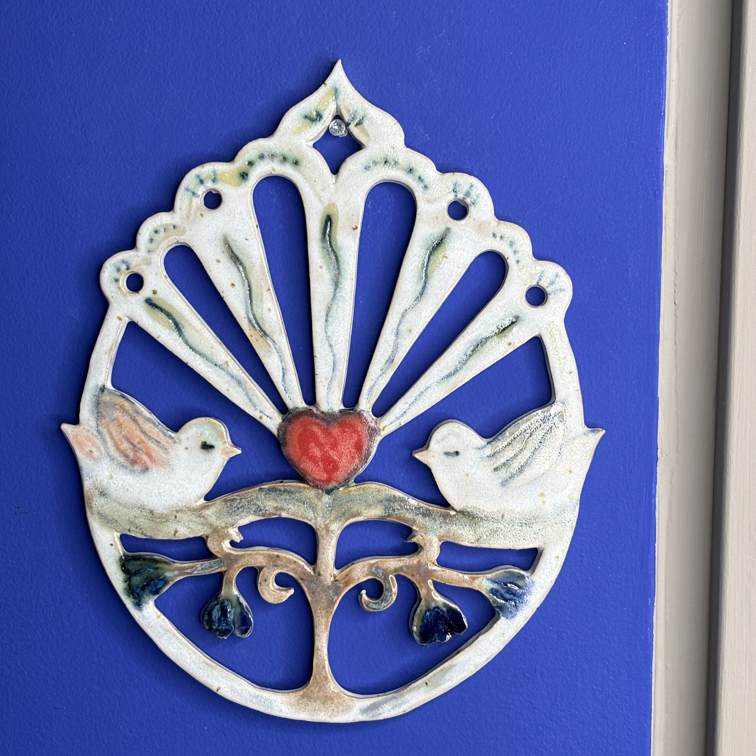 Ophænget er lavet af lyst stentøjsler og dekoreret med glasur.