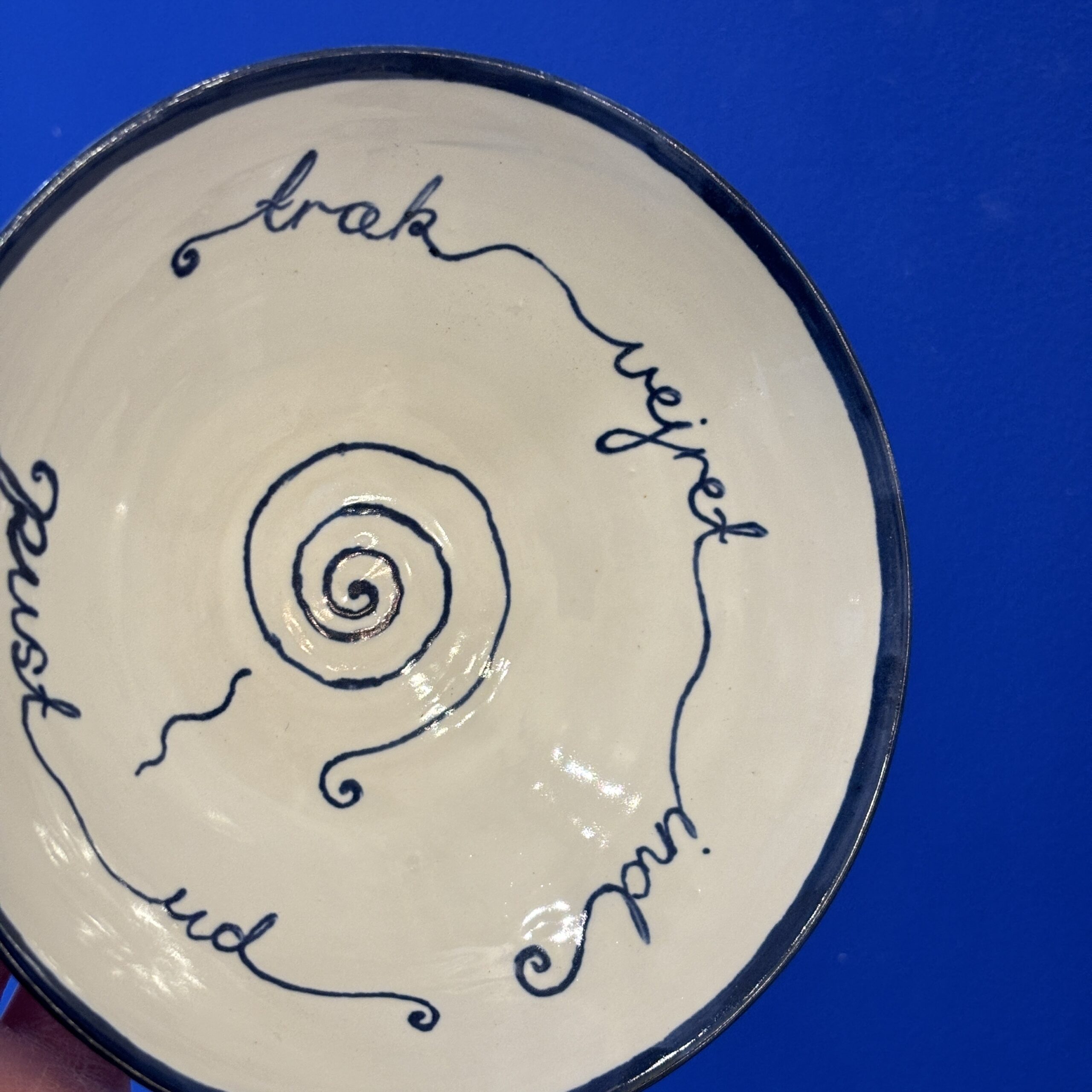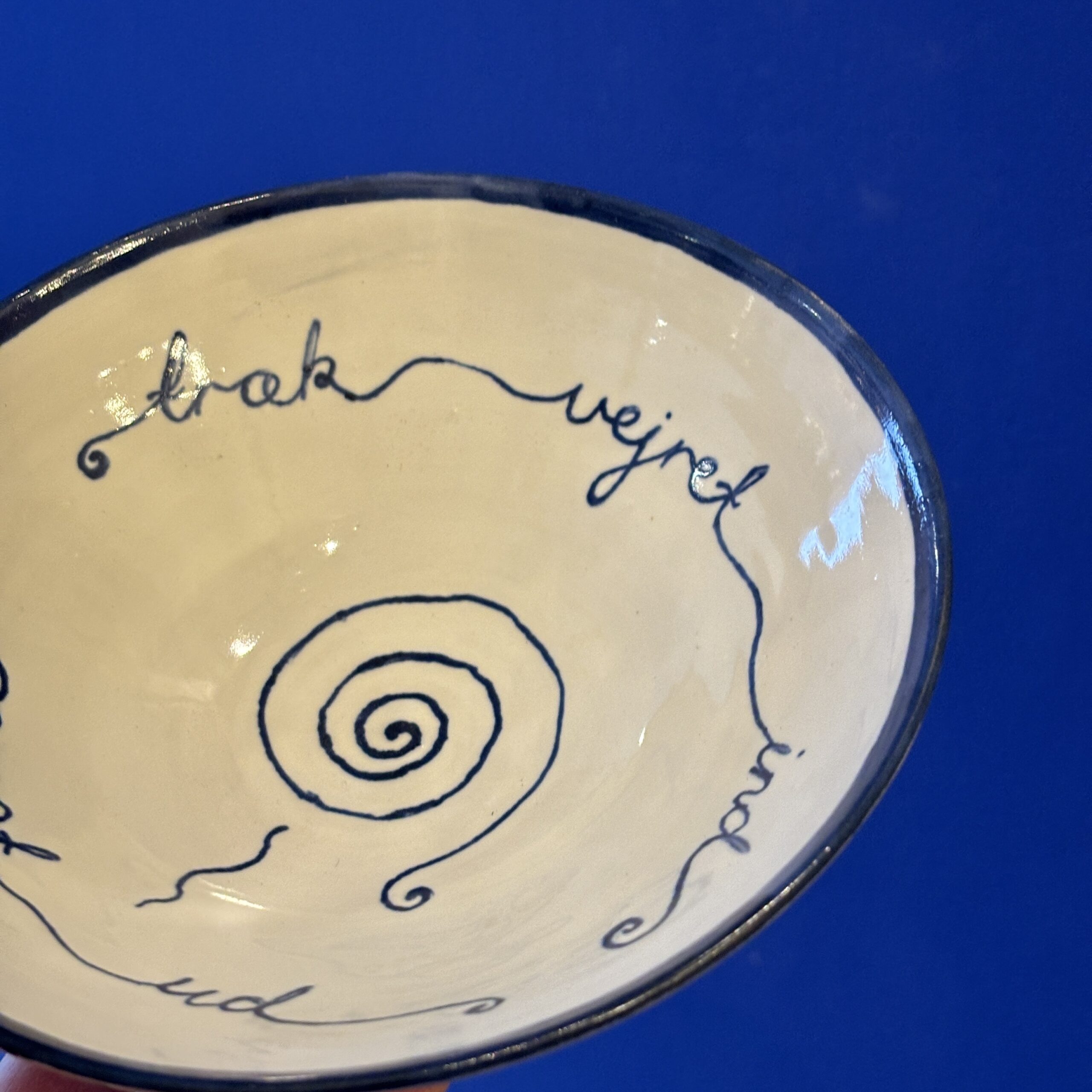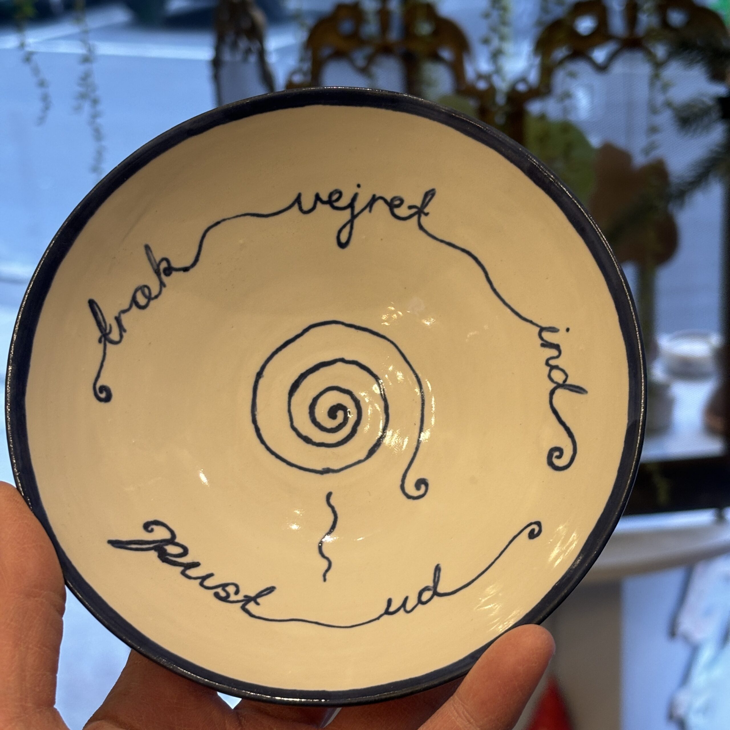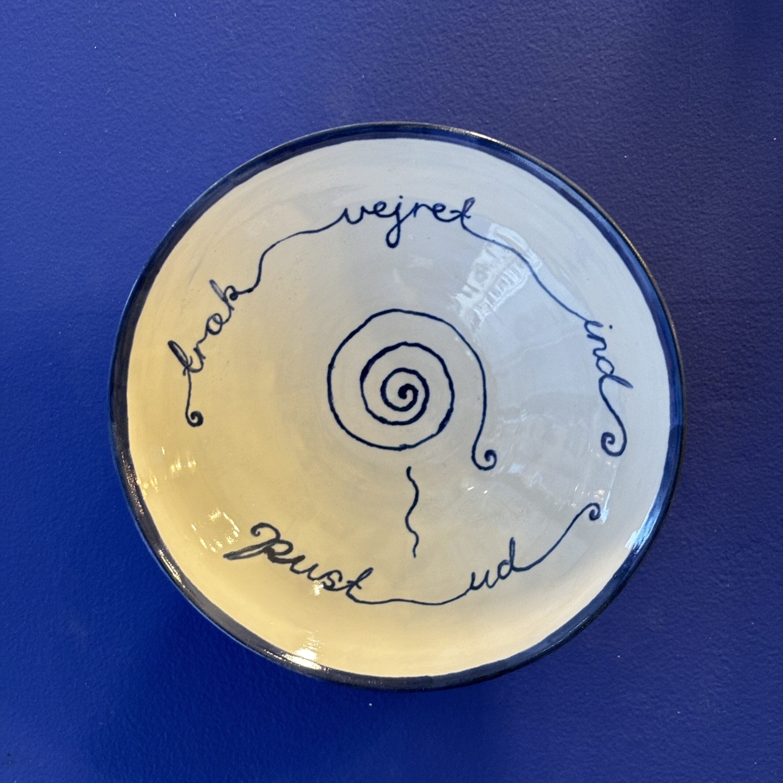 Skålen er hånddrejet i stentøjsler og dekoreret med glasur. Der er en snor på bagsiden til ophæng, ønskes den at bruges på anden vis kan snoren blot fjernes.